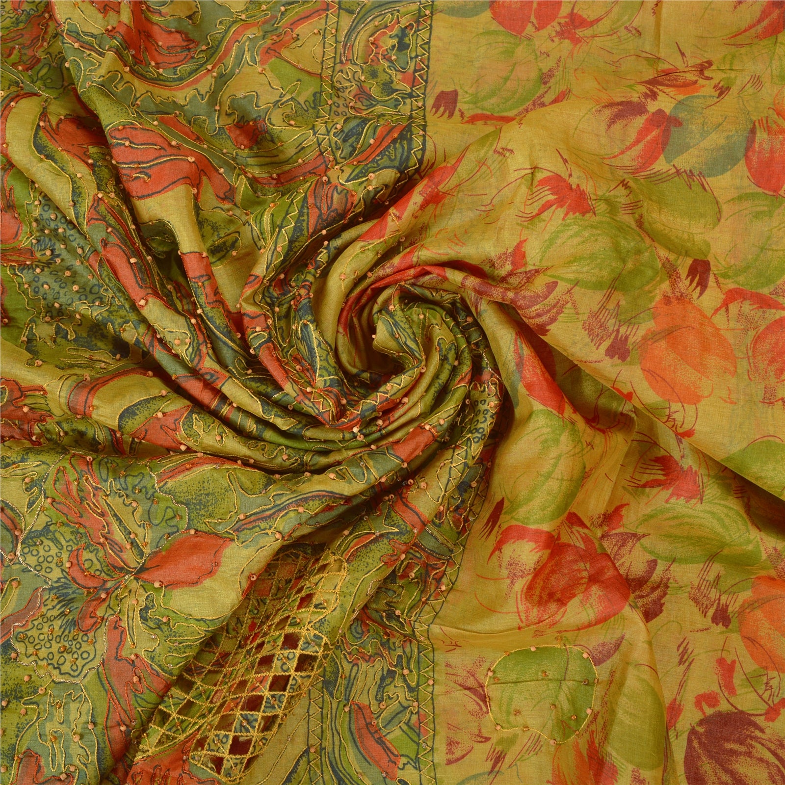 Beautiful green colored pure silk hand embroidered printed sari. Pallu & Border has printed floral pattern embroidered with thread & wooden beads work. The center of the saree has similar printed floral design with thread work. This saree can be used for various crafting ideas too. Use it for dress designing, as a throw, as window dressing, upholstery, table linen and much more. Let your creative juices flow.