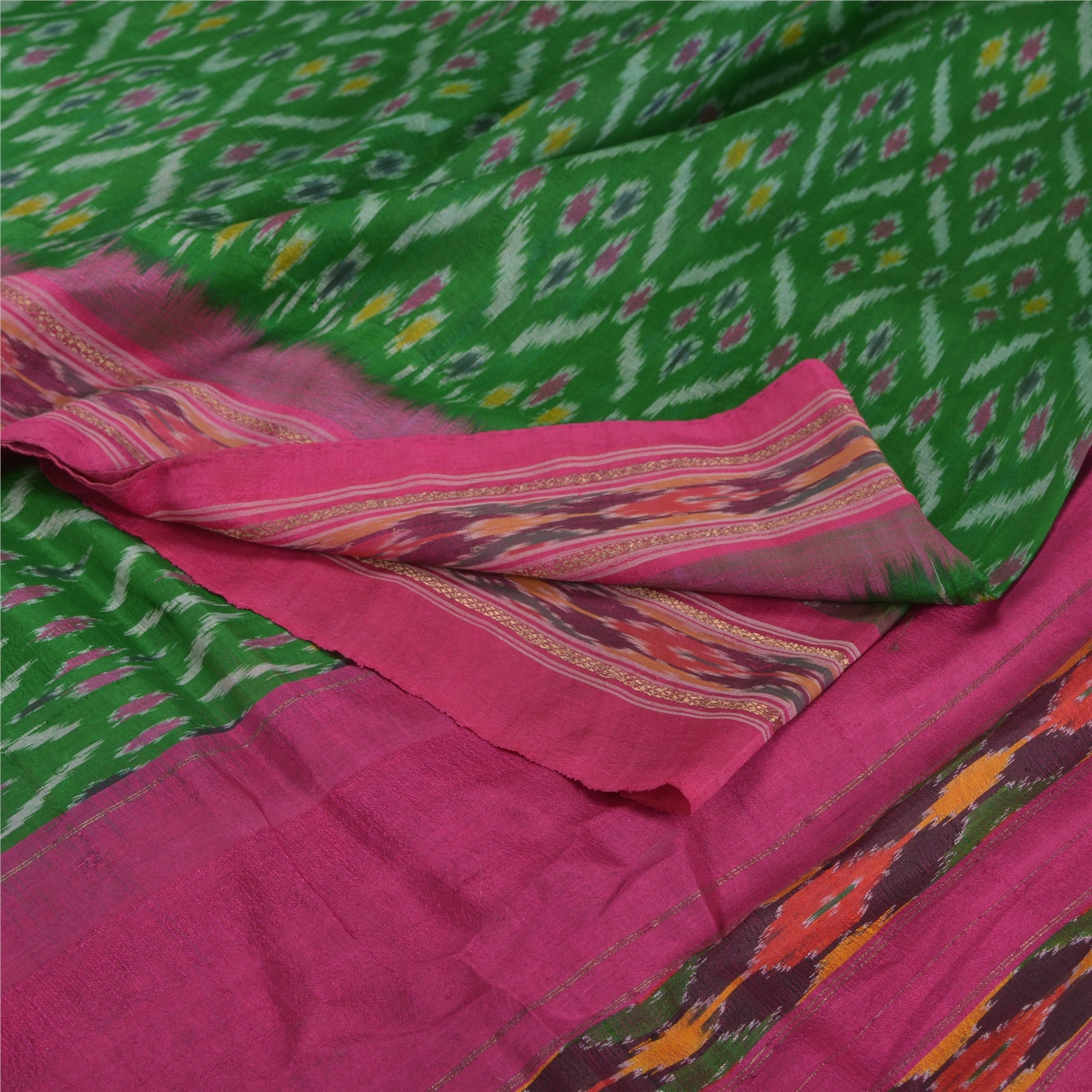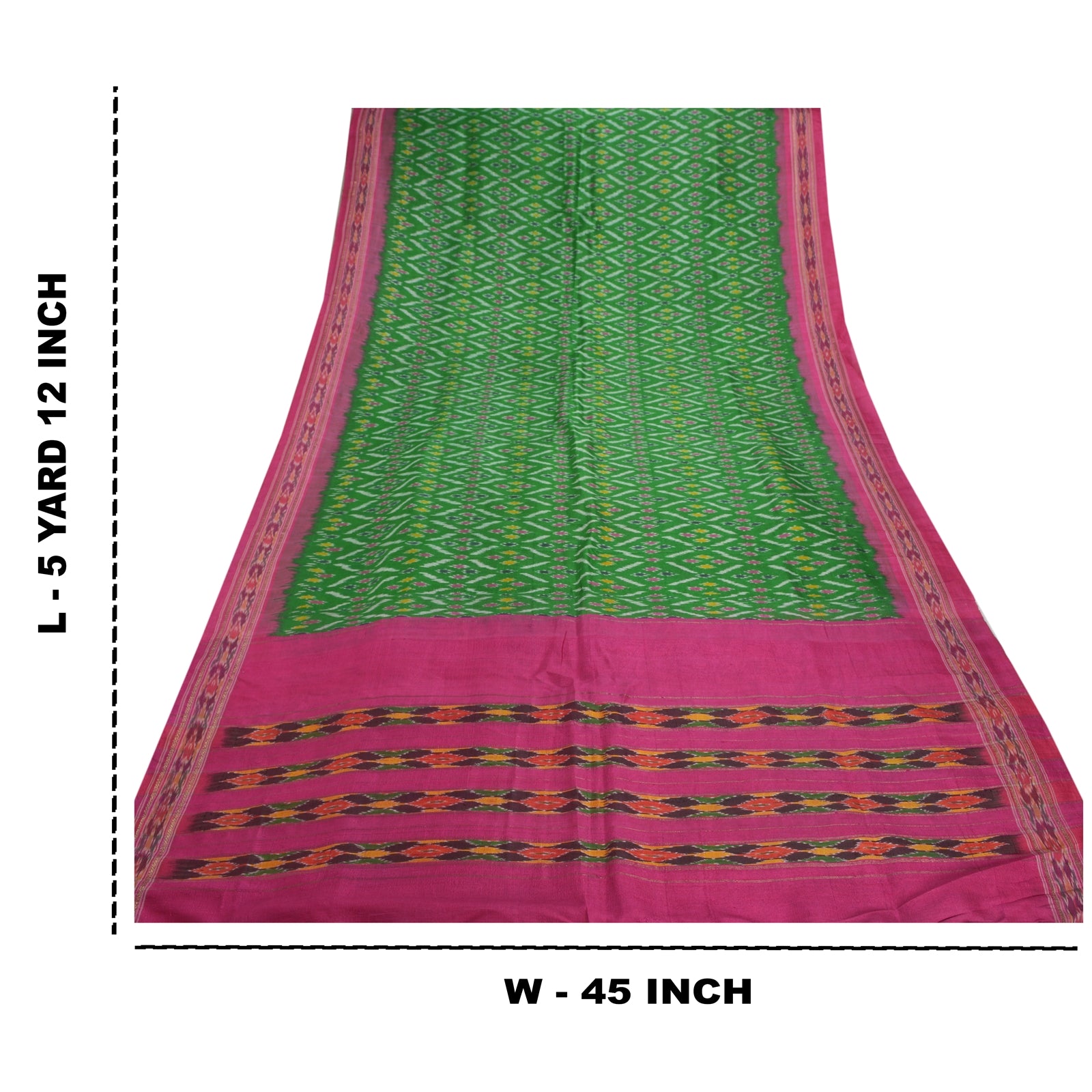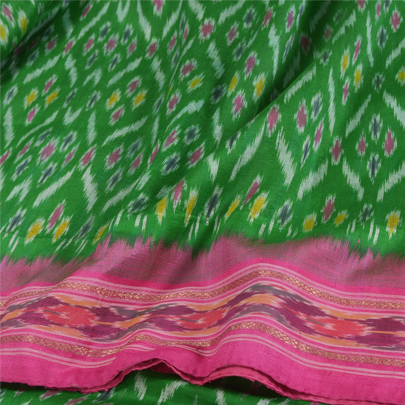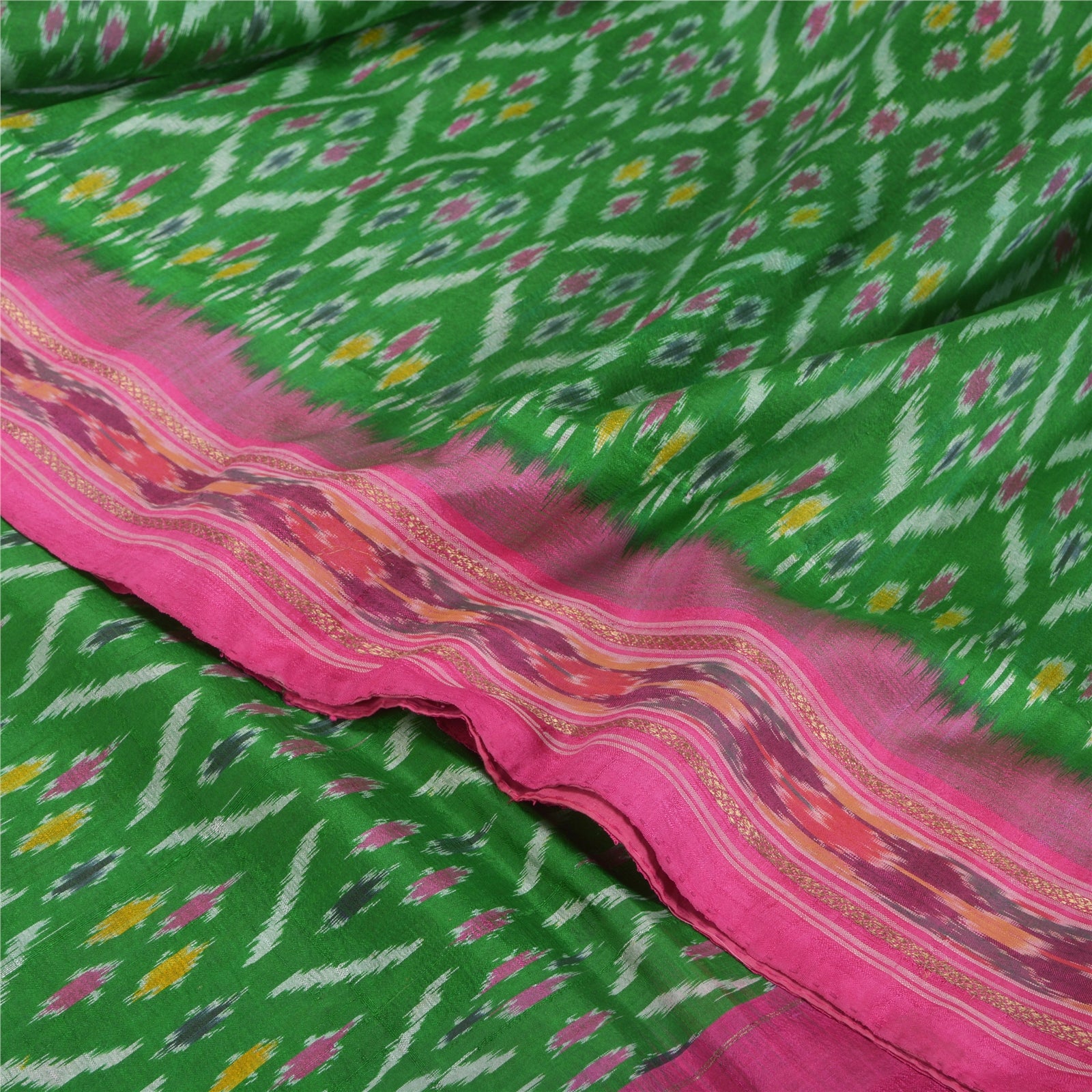 Sanskriti Vintage Green Sarees 100% Pure Silk Woven Patola Ikat Sustainable Fabric 5 YD Sari