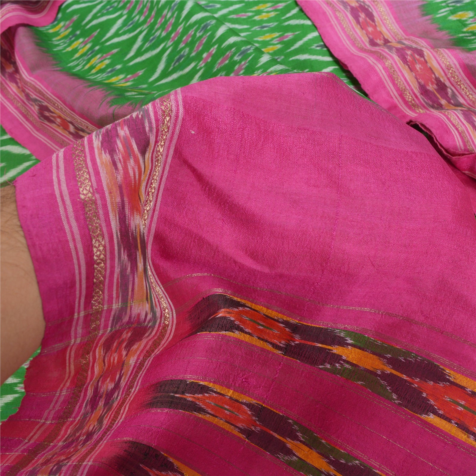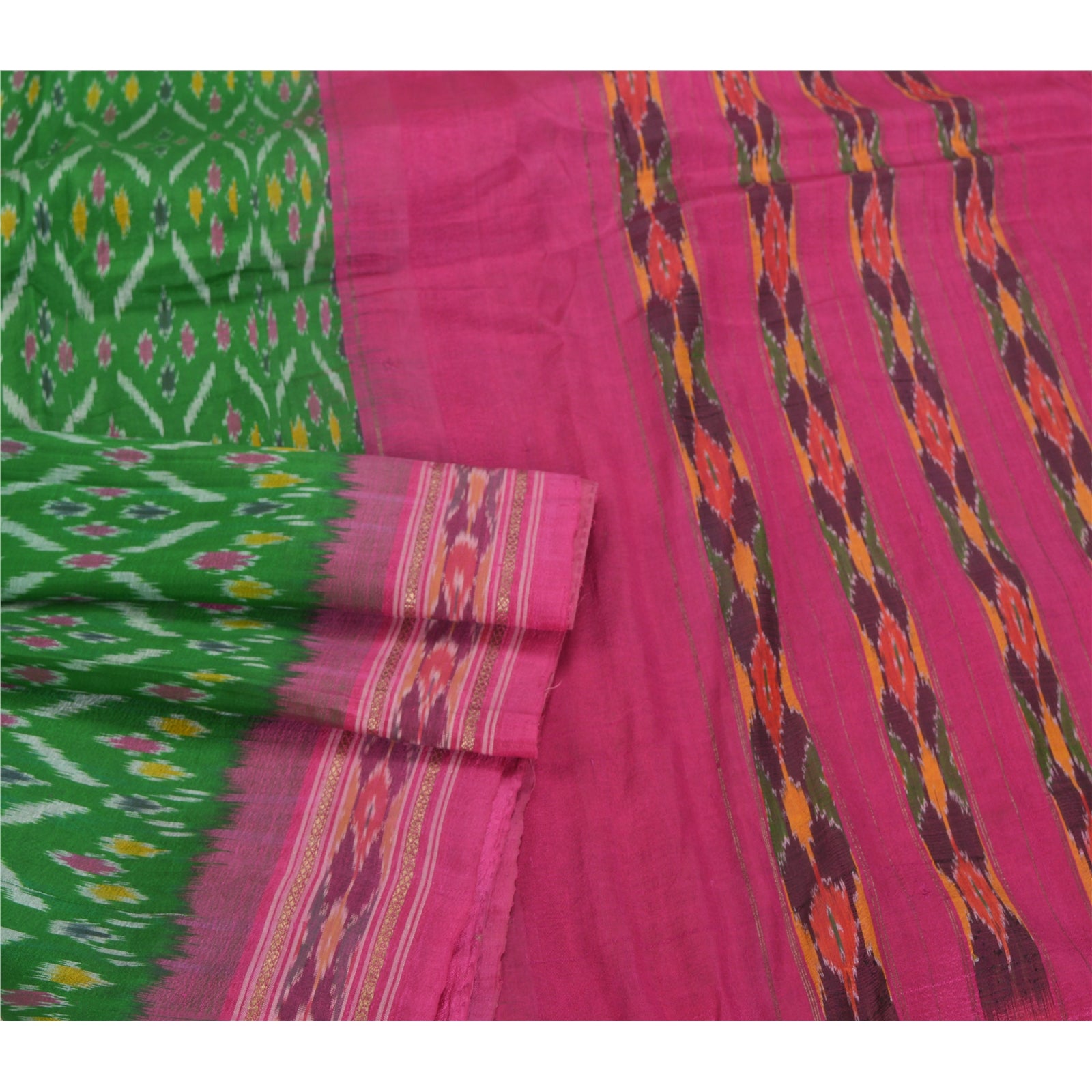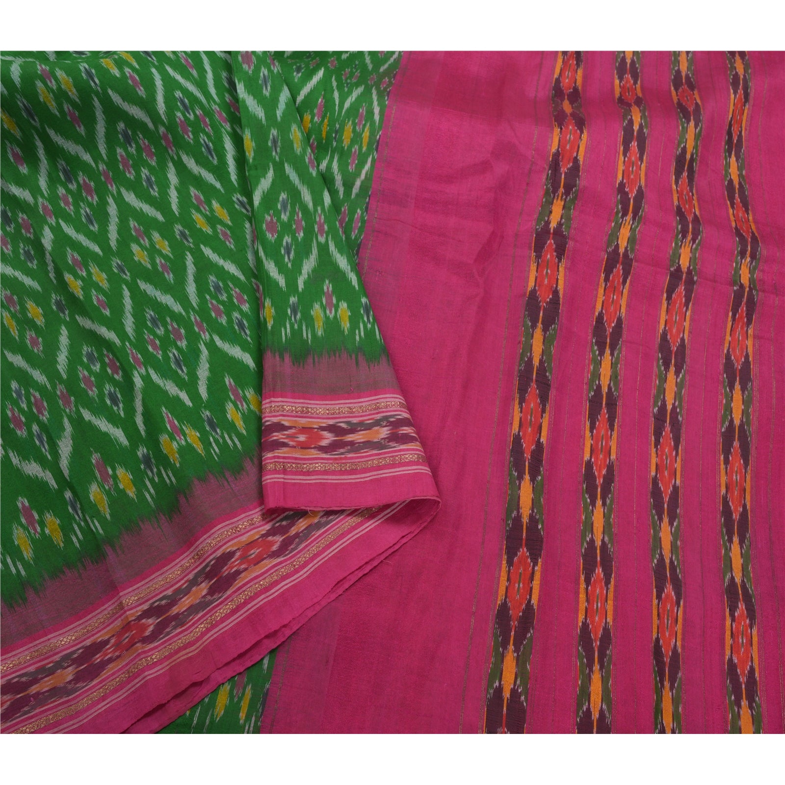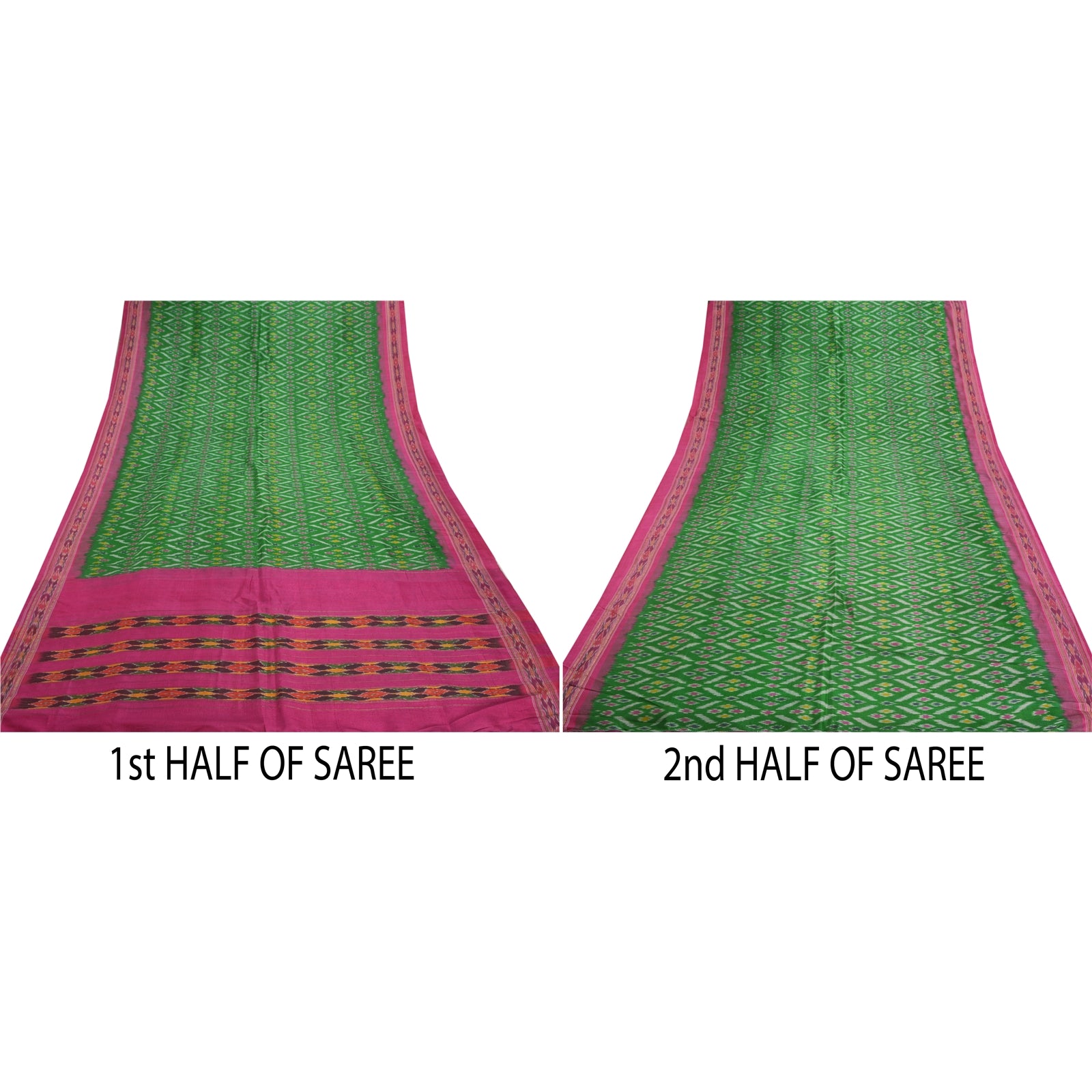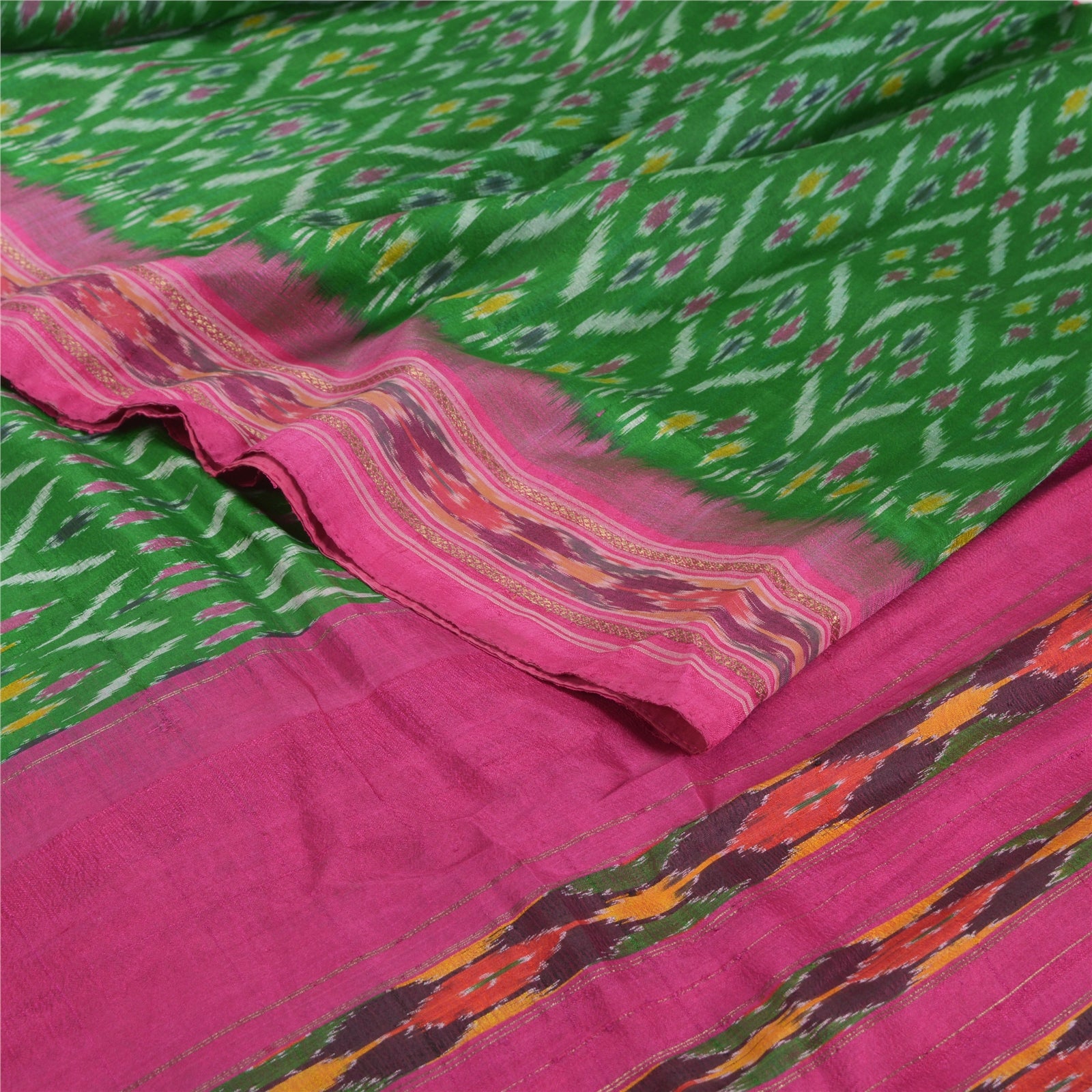 Sanskriti Vintage Green Sarees 100% Pure Silk Woven Patola Ikat Sustainable Fabric 5 YD Sari
