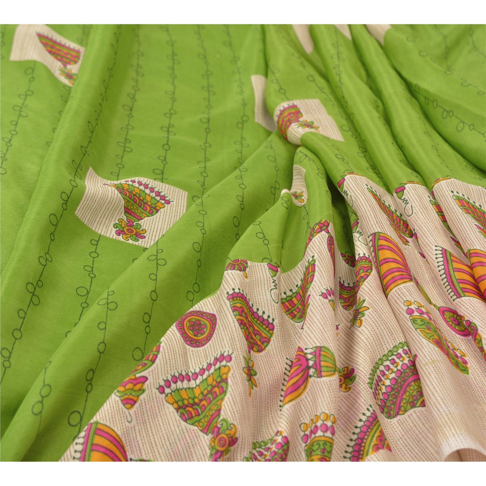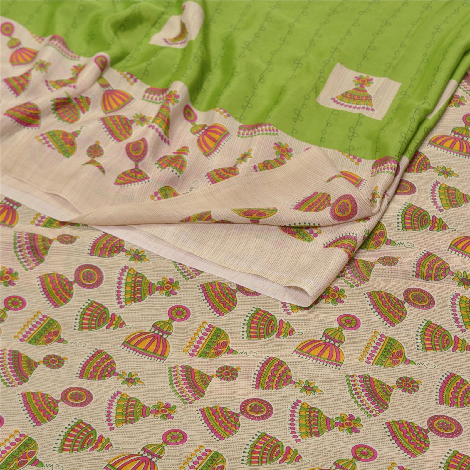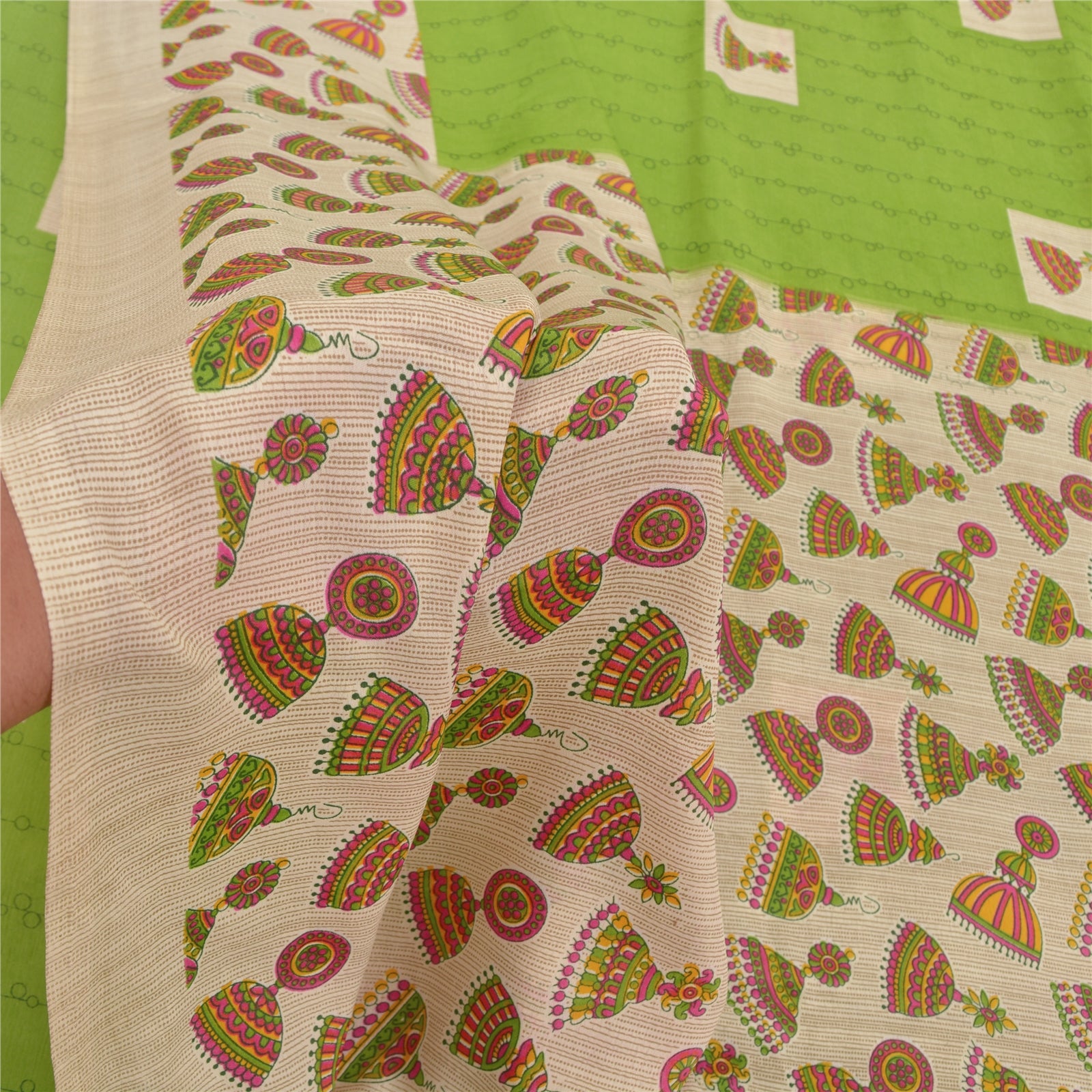 Beautiful shades of green colored printed moss crepe saree. Pallu & Border has printed jhumka earring design. Similar print design in center part of sari. What is special about this saree? Nice printed design with extremely smooth moss crepe base Sustainable Fabric is really enhancing the beauty of the saree. This unique vintage saree can be used for various crafting ideas even if you don't want to use it as a sari. Design a dress, use it as a throw, as window dressing, upholstery, sarongs, table linen and much more. Let your creative juices flow and use this decorated Sustainable Fabric in multiple fashion. Please note - Buyers from Australia are required to pay postage. Registered air mail to Australia is temporarily suspended due to the pandemic. Once it goes back to normal we'll revert to free shipping. For now, we are using Aramex and DHL to ship orders. These services are expensive but faster compared to regular mail. Thank you for your support. If you are buying in bulk we will refund whatever excess is left. Contact us after that purchase. For USA buyers - Single item ships via registered air mail, buy 1 more to get FedEx.