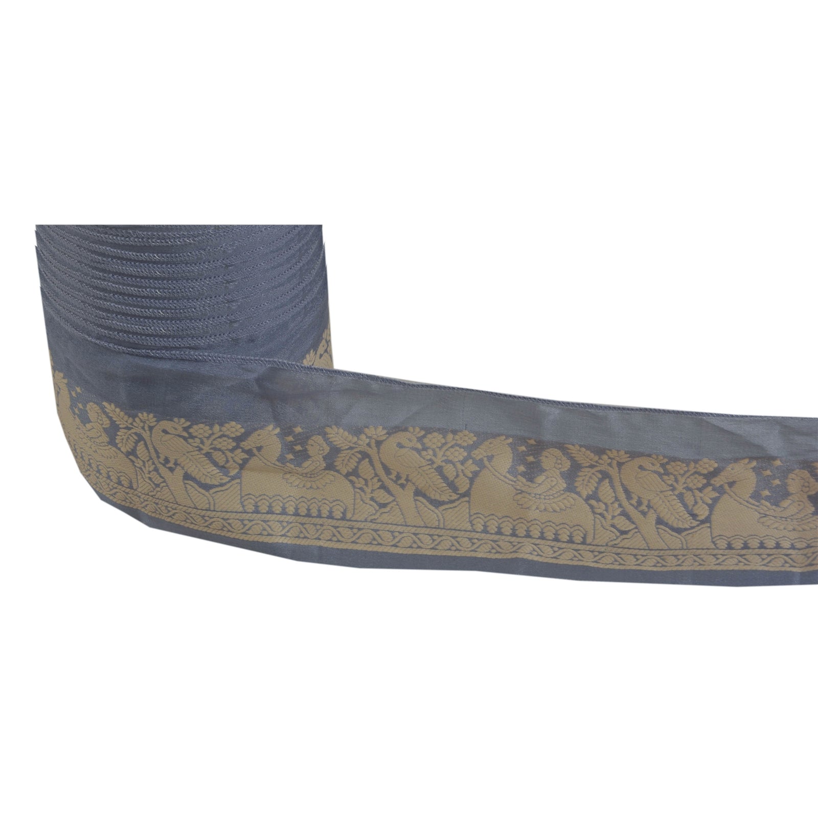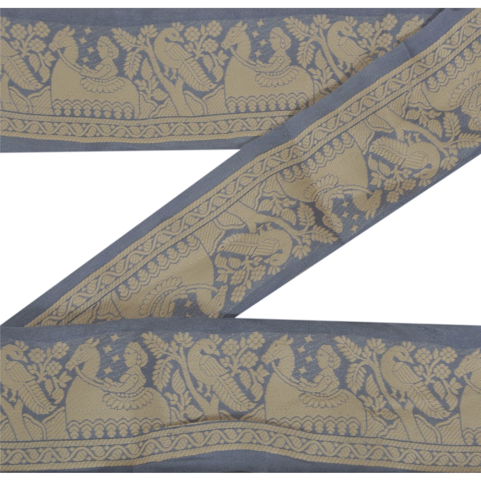 Fabulous 100% pure silk woven sari border in grey color highlighting thread work. Border has beautiful floral, animals and human figures design painstakingly woven with cream color thread. WOW!! an awesome one of a kind versatile border. 1 Quantity = 1 Yard