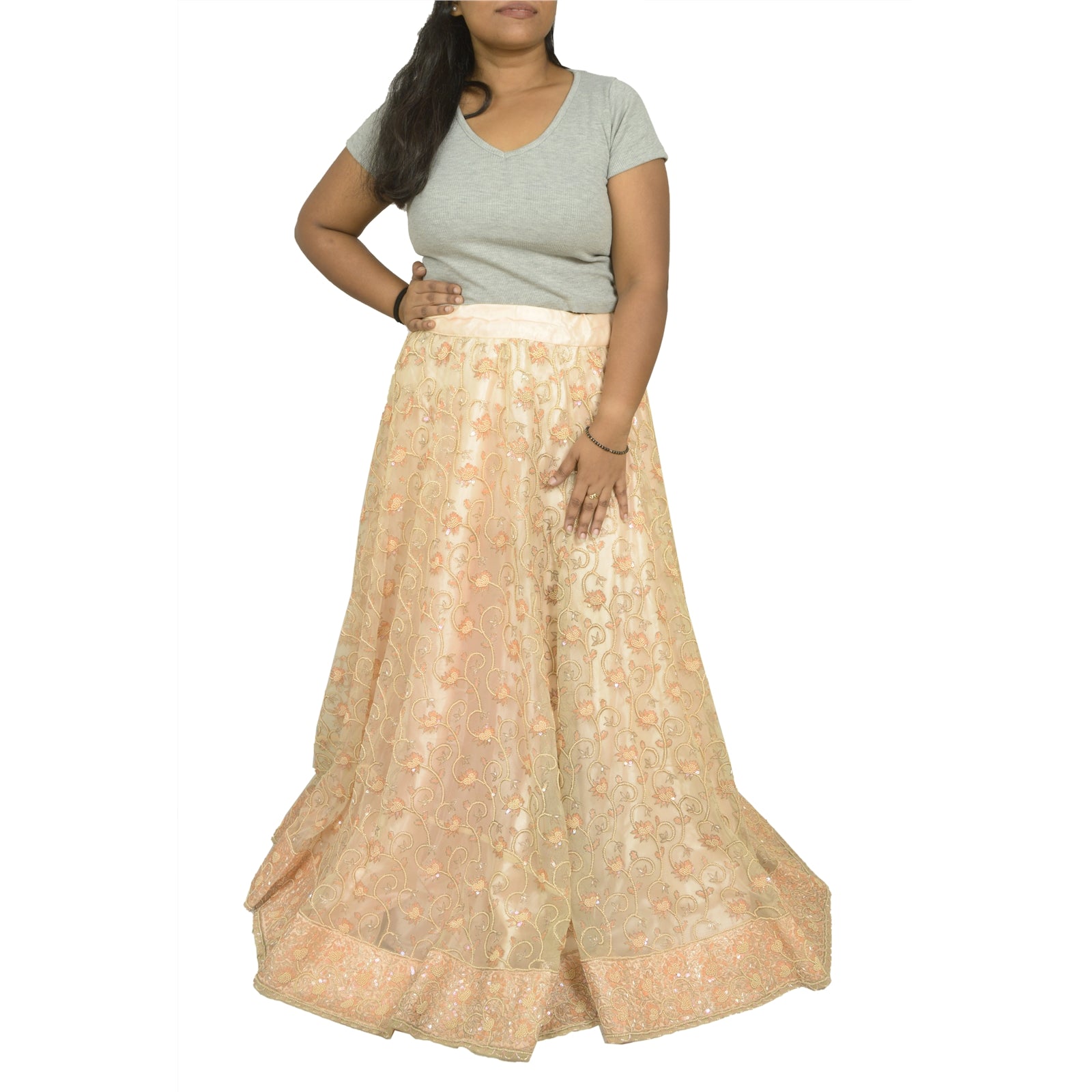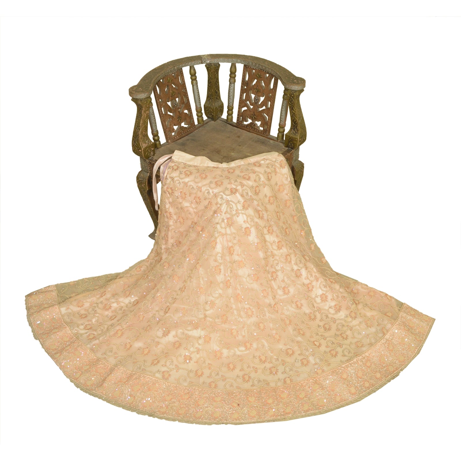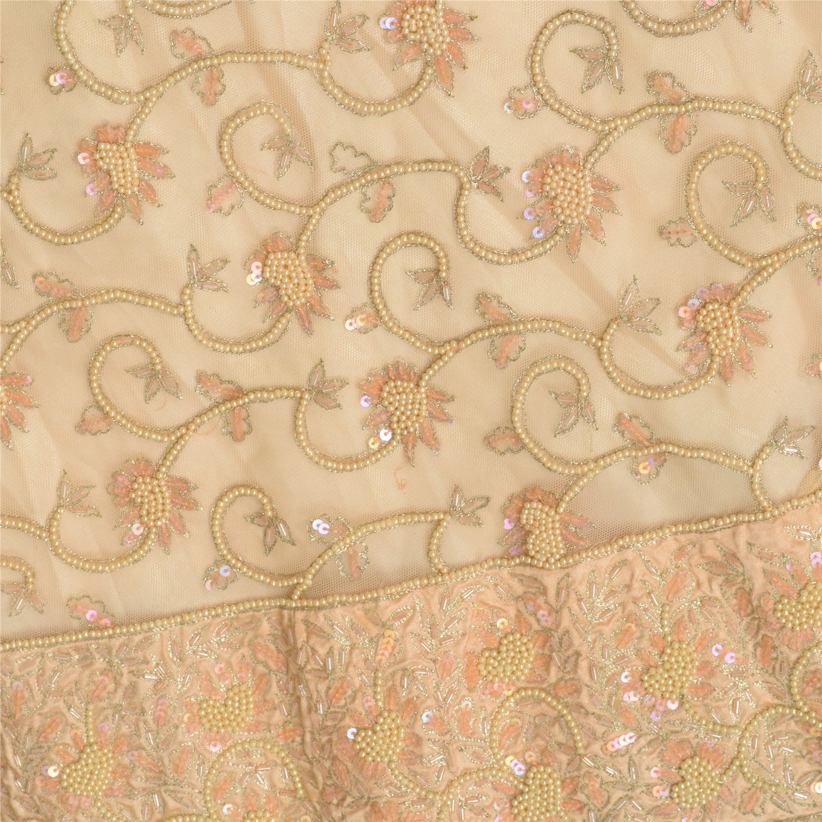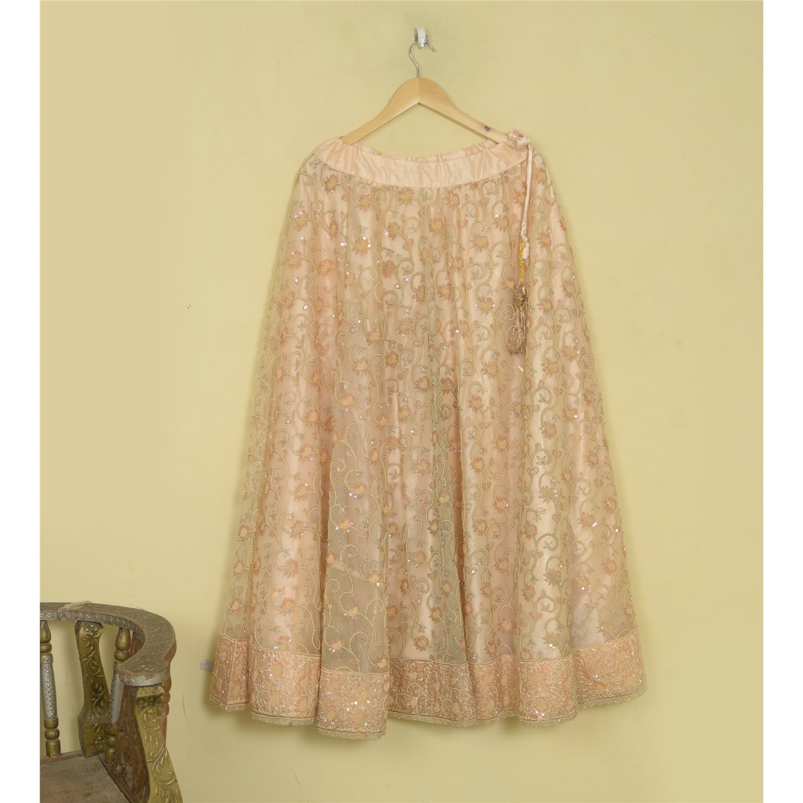 Sanskriti Vintage Hand Beaded Indian Skirt Peach Party Pearl Beads Net Lehenga