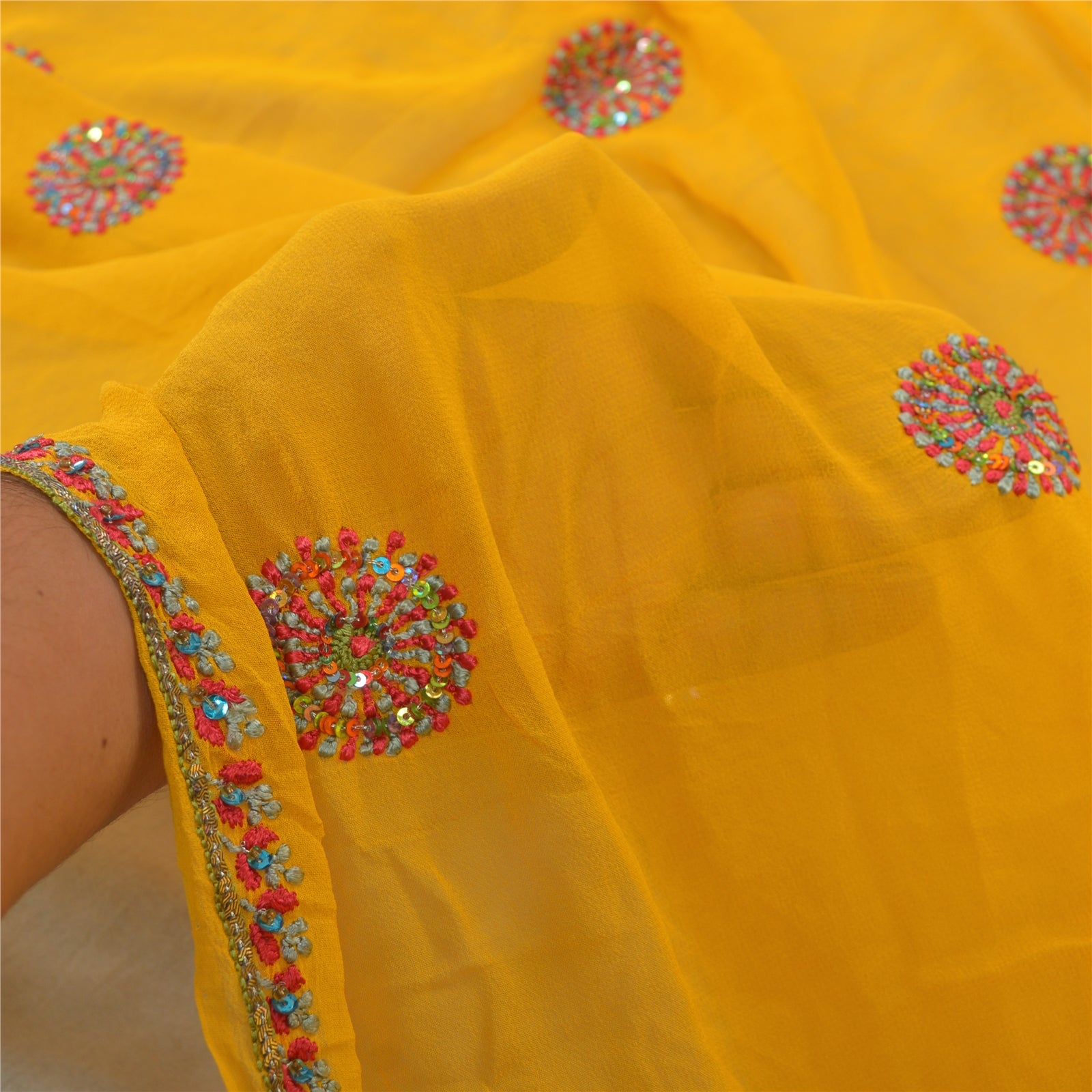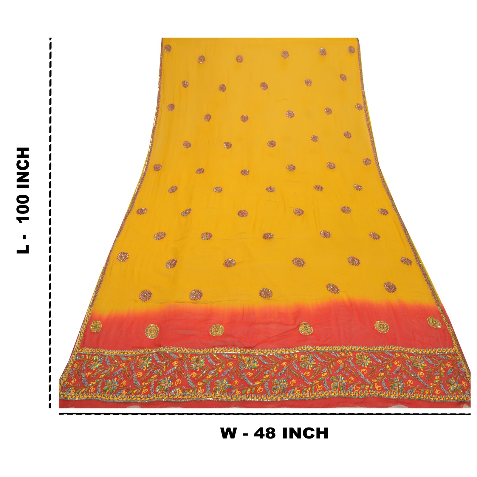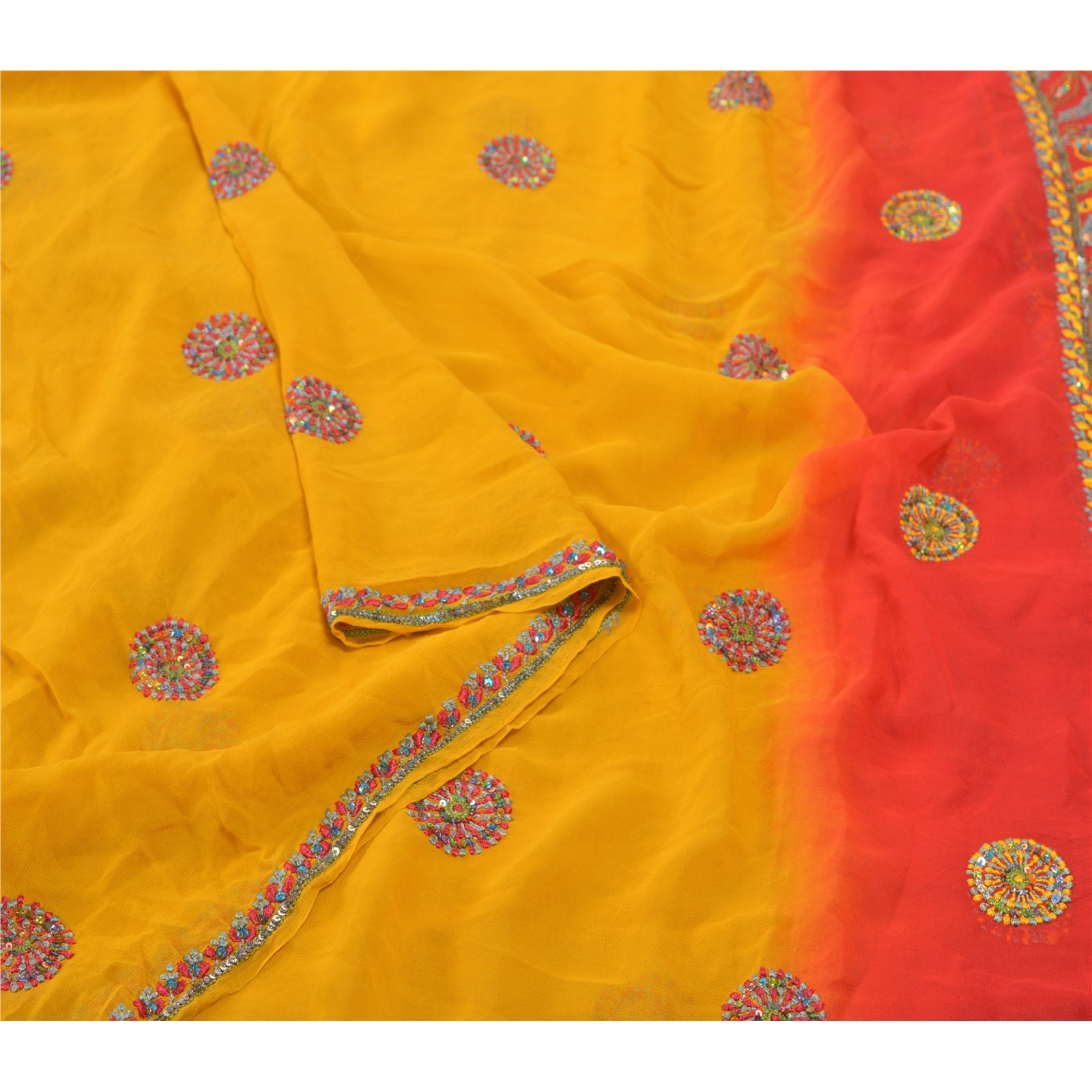 Mesmerizing Royal Full Hand Beaded Chakankari Heavy Dupatta In 100% Pure Georgette Silk Sustainable Fabric. Amazing Yellow & Red color base Sustainable Fabric. Border feature floral design embroidered with multi color thread work embellished with multi color sequins & rhinestone work on the dupatta is adding grace to the dupatta. Also you can see similar sequins work on center portion of dupatta with floral design looks fabulous. A very traditional dupatta with beautiful craftsmanship which I am sure you will truly appreciate. Sequins work is giving a fabulous look to the dupatta. Awesome one !!!