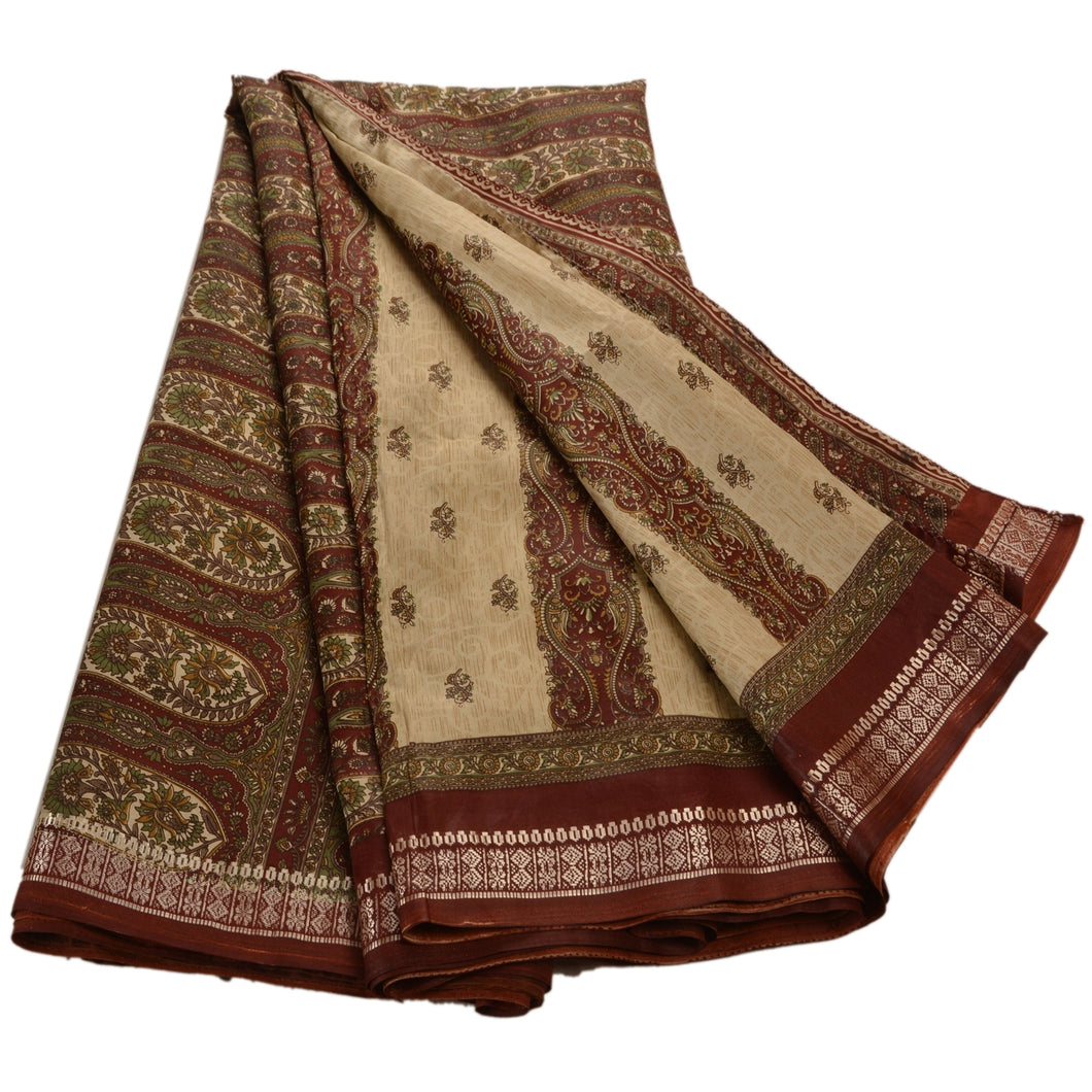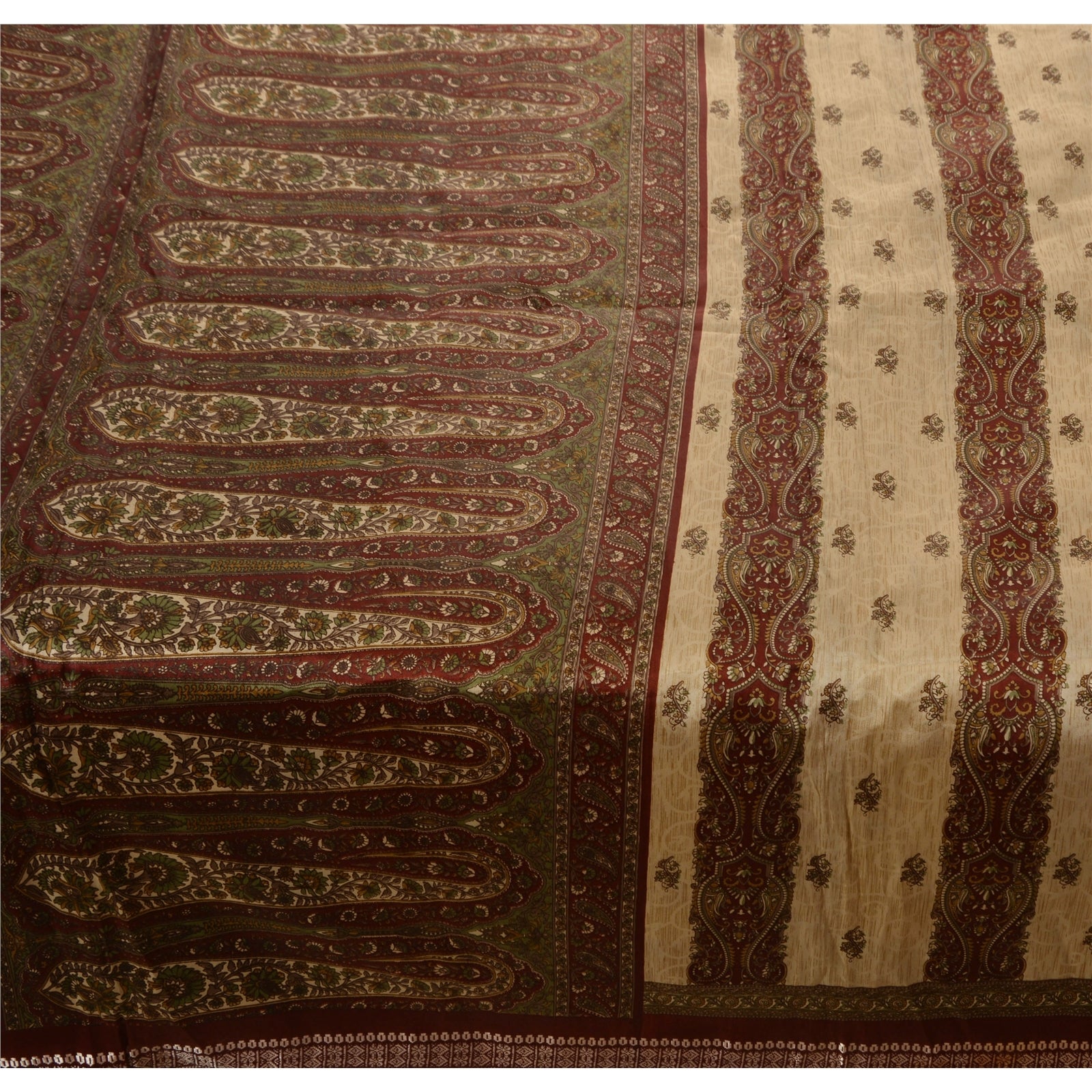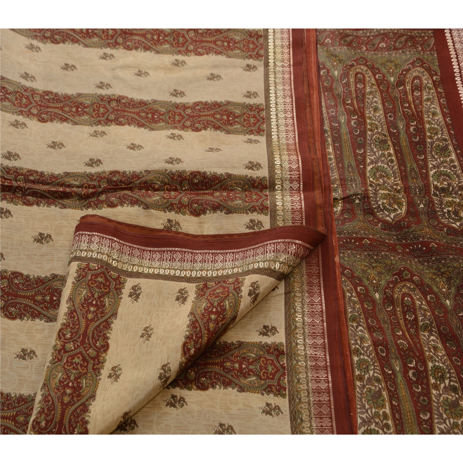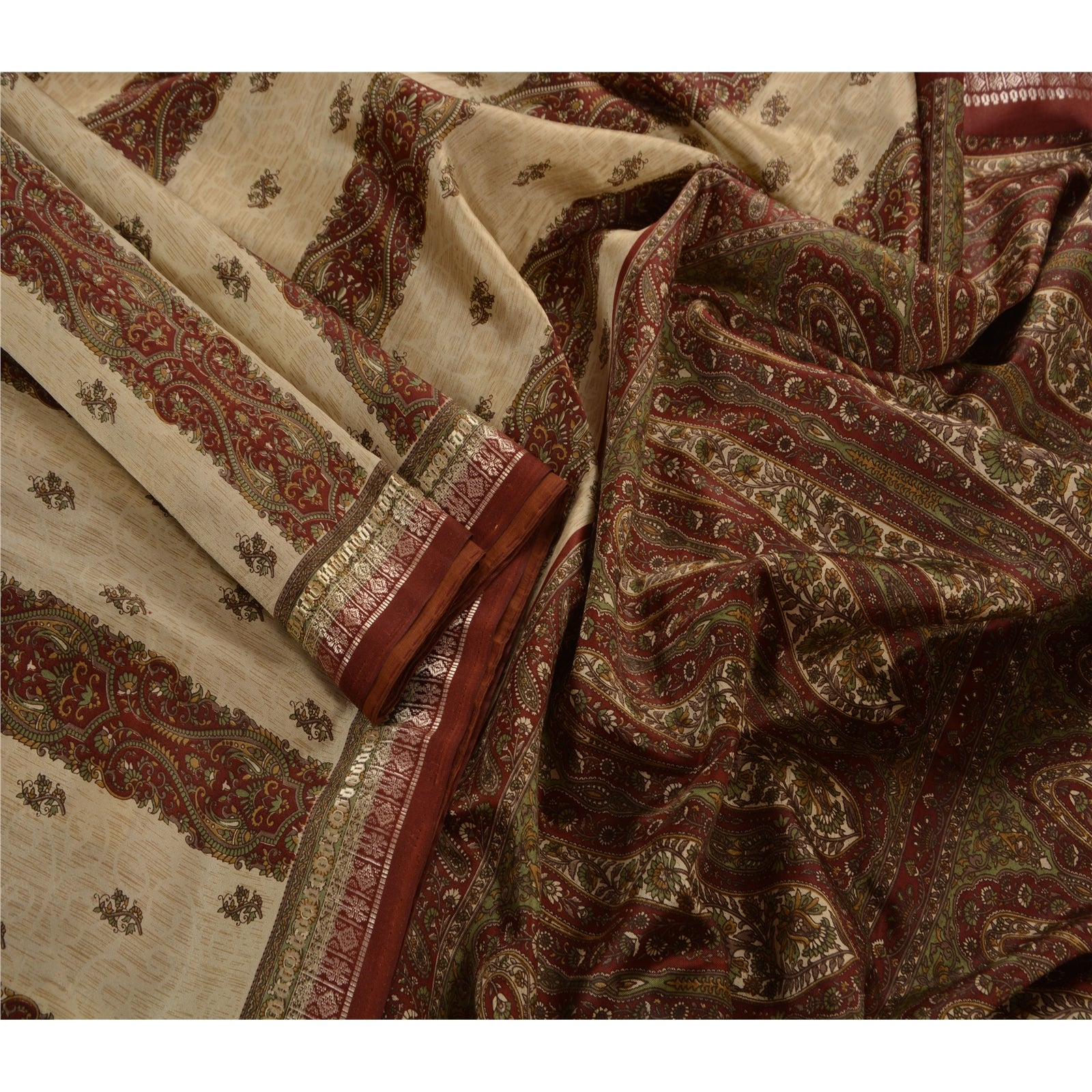 ? Beautiful dark red colored printed art silk sari . ? Pallu & border has printed floral & paisley design . ? Floral design in center part of sari. ? Border has cream weaving work with floral design . . What is special about this saree? Nice printed work with floral & paisley design on dark red color base Sustainable Fabric is really enhancing the beauty of the saree. This unique vintage saree can be used for various crafting ideas even if you don't want to use it as a sari. Design a dress, use it as a throw, as window dressing, upholstery, sarongs, table linen and much more. Let your creative juices flow and use this decorated Sustainable Fabric in multiple fashion.
