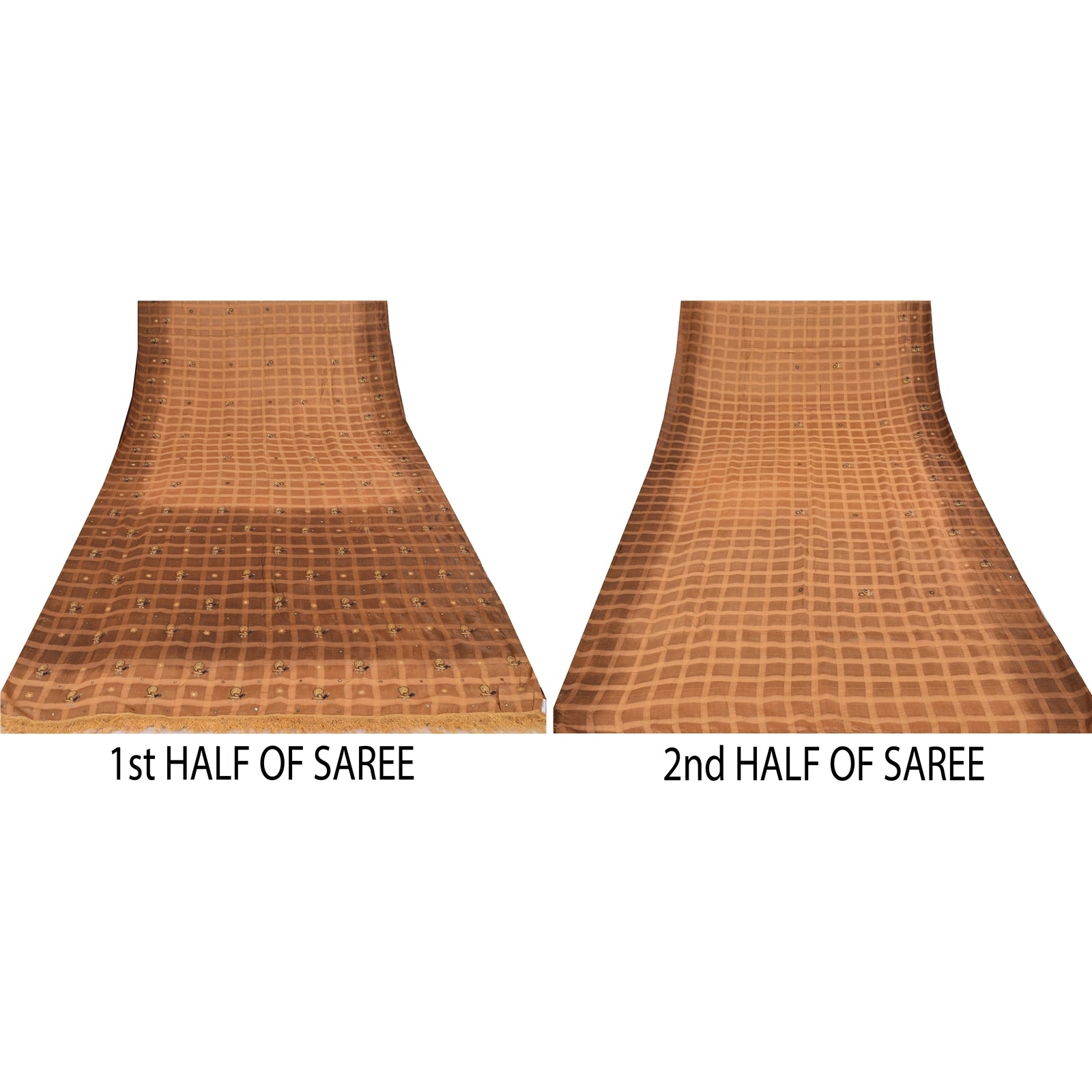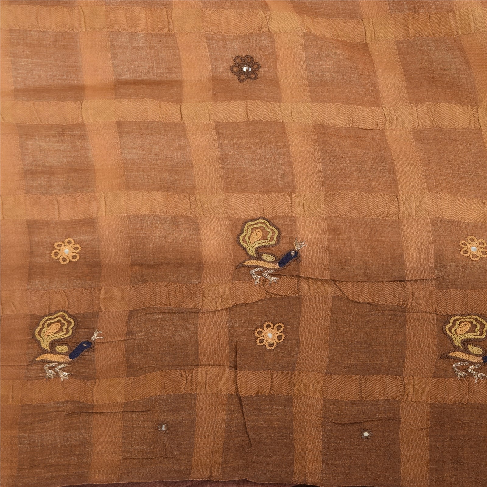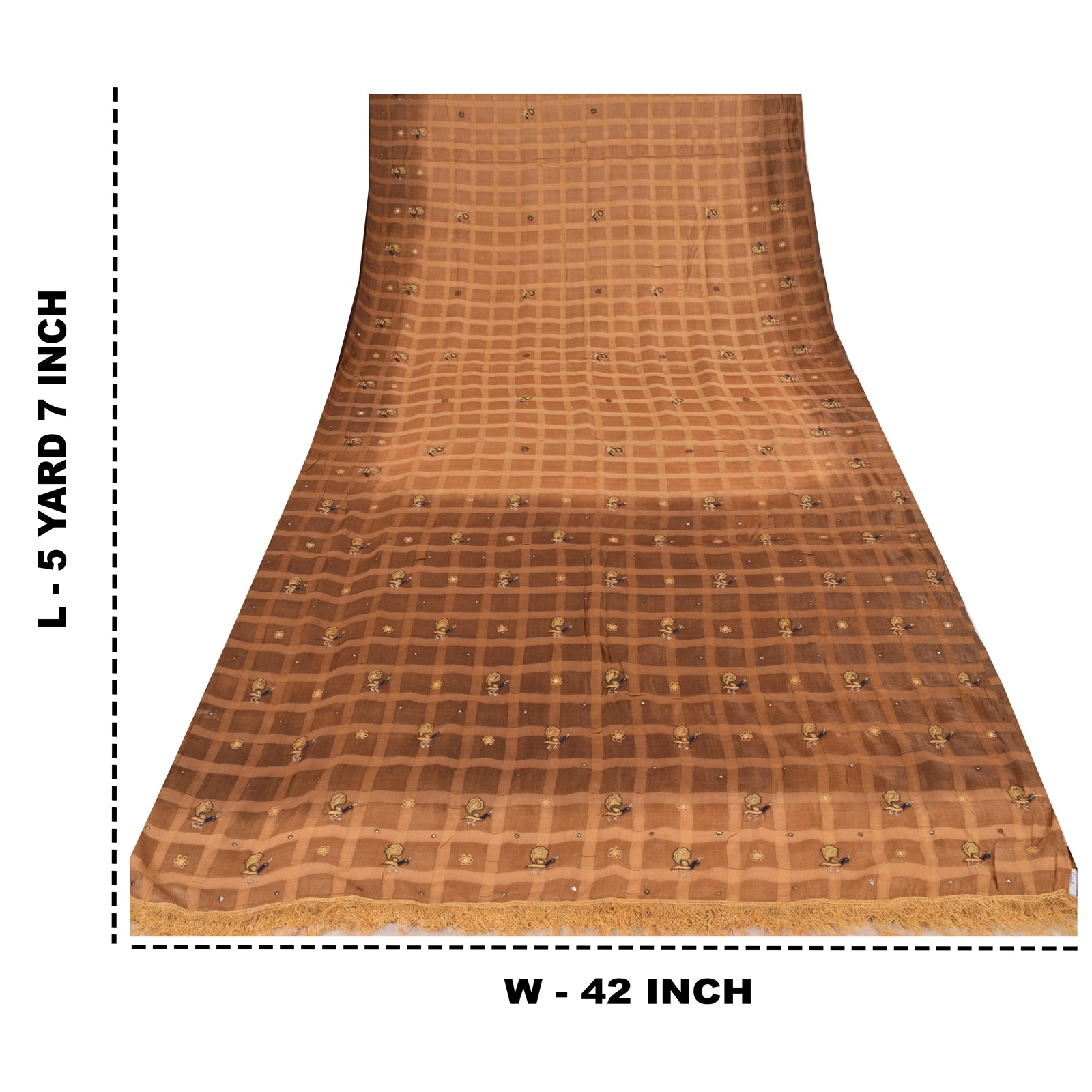 THE ITEM COLOR OR SHADE MAY BE DARKER OR LIGHTER THAN THE PICTURE.' • Beautiful shades of brown colored hand embroidered pure silk sari • Pallu & Border features floral & peacock design embellished with blue/yellow & brown color thread work, golden zari work & diy mirror rhinestone work. • There are floral motifs with similar work in center part of sari. Sari has cream fringes on pallu. Shining zari work with nice peacock design on shades of brown color base fabric is really enhancing the beauty of the saree. This unique vintage saree can be used for various crafting ideas even if you don't want to use it as a sari. Design a dress, use it as a throw, as window dressing, upholstery, sarongs, table linen and much more. Let your creative juices flow and use this decorated fabric in multiple fashion. Shipping note: International buyers please note: Import duties, taxes, and charges are not included in the item price or postage cost. These charges are the buyer's responsibility. Please check with your country's customs office to determine what these additional costs will be prior to bidding or buying. Buyer will pay custom duty/tax. It is calculated and charged differently by every country. As a seller I do not have any control over it. VAT or sales tax is calculated by the platform at the time of checkout. Customs charge is payable at the time of delivery. SKU: PS-39835