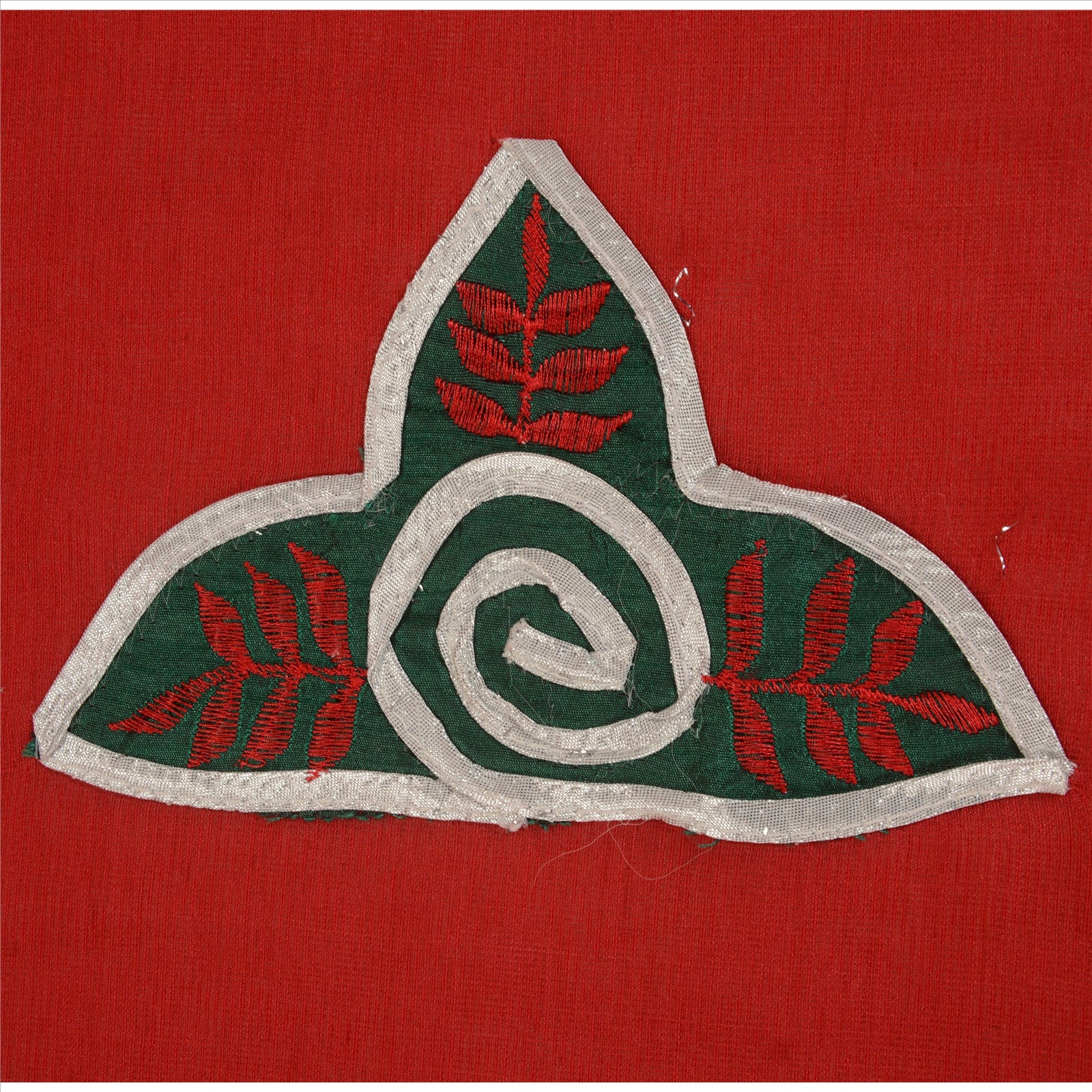 Pallu & border features floral design embellished with red thread work with silver, green, & saffron color Sustainable Fabric patch work.