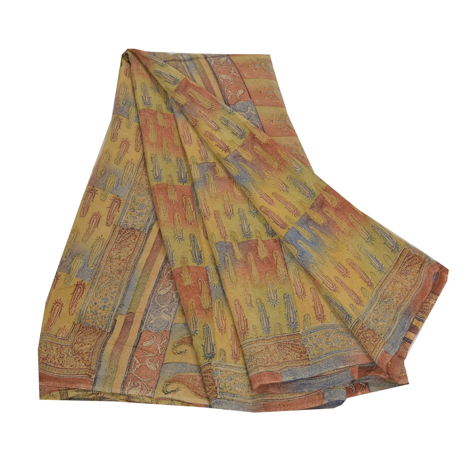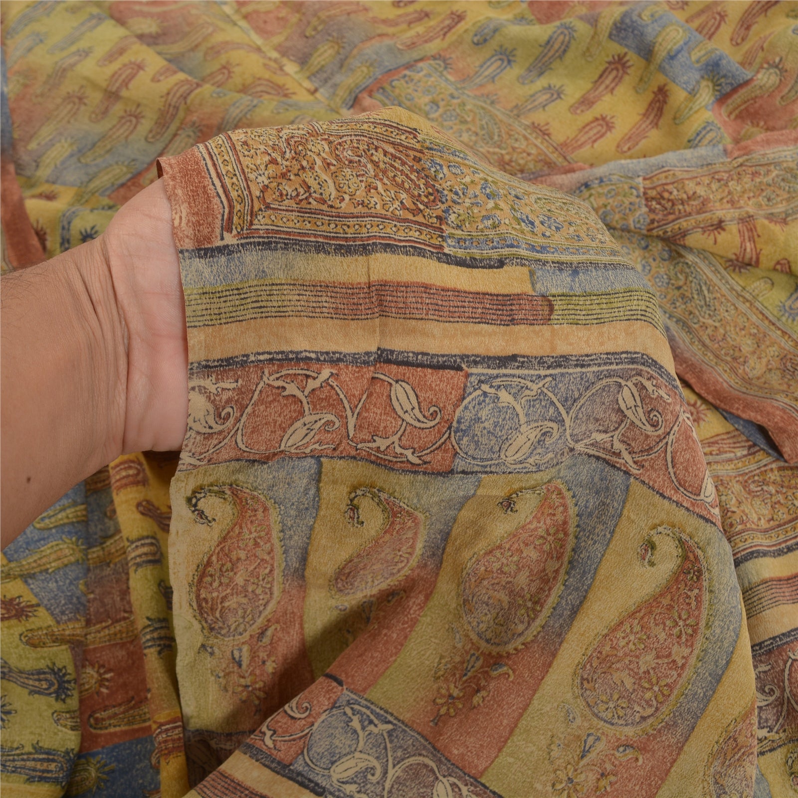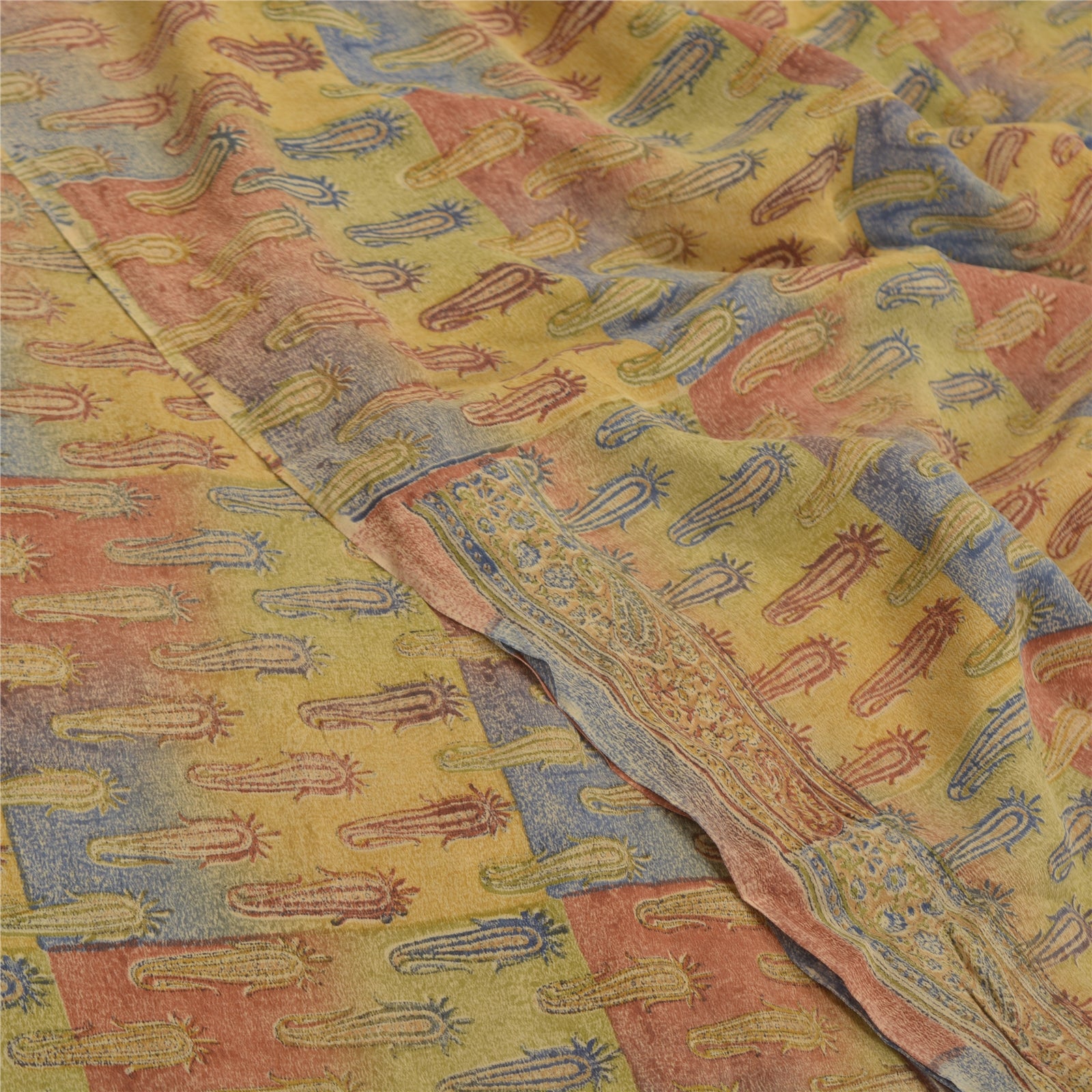 Beautiful Multi Color Colored Saree 100% Pure Crepe Silk Printed Base Sustainable Fabric Pallu & Border has printed floral design. Center part of the sari has printed paisley design. This unique vintage saree can be used for various crafting ideas even if you don't want to use it as a sari. Design a dress, use it as a throw, as window dressing, upholstery, sarongs, table linen and much more. Let your creative juices flow and use this decorated Sustainable Fabric in multiple fashion.