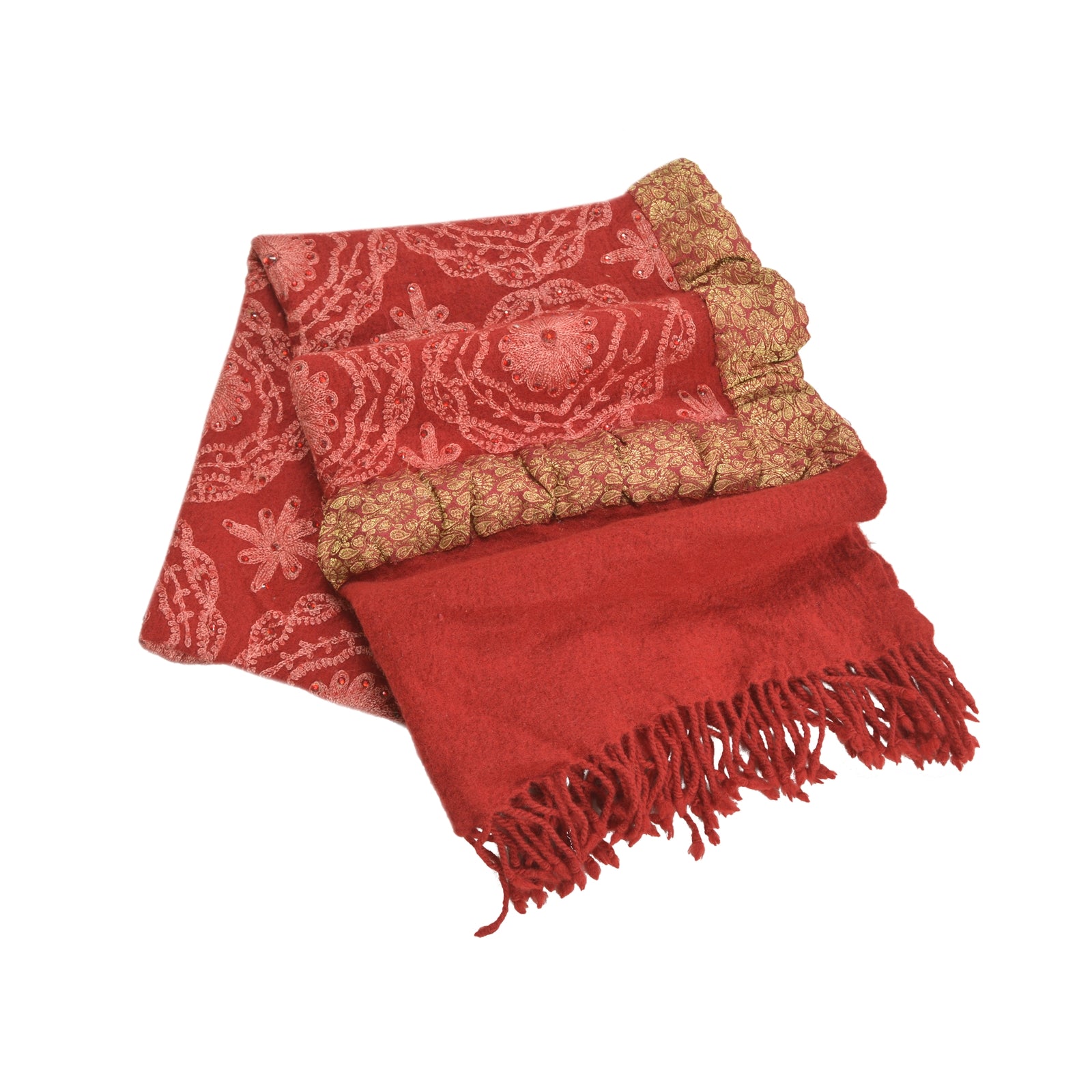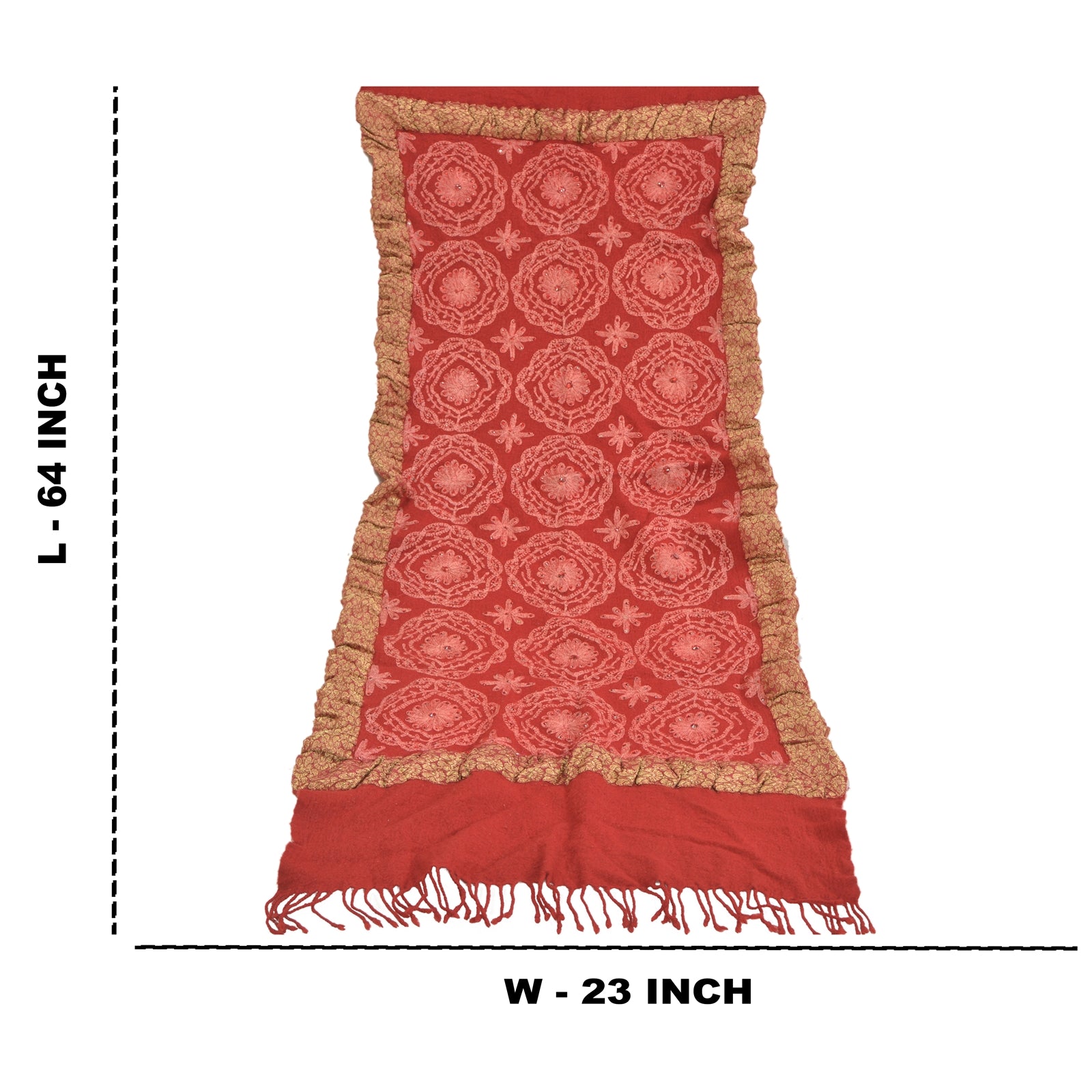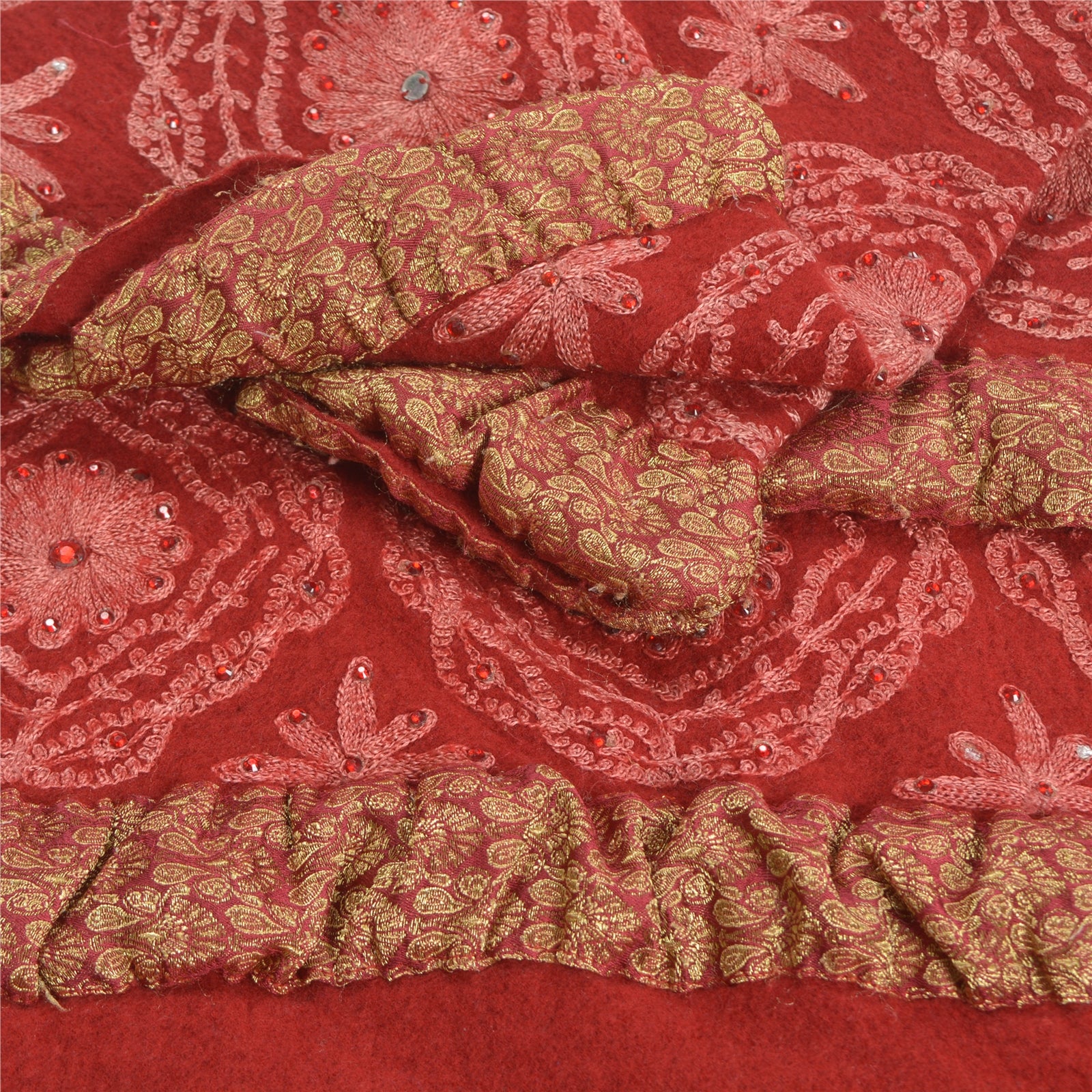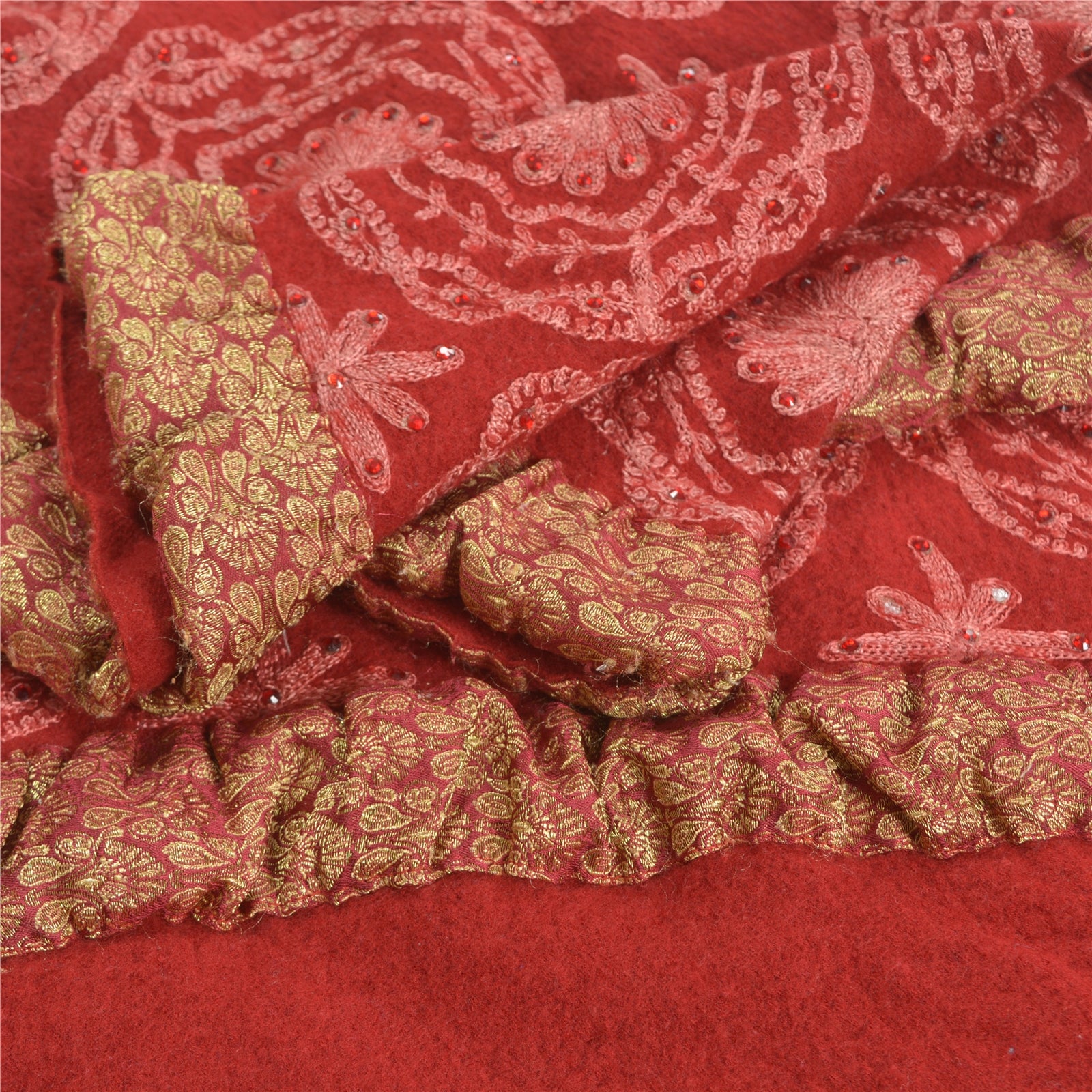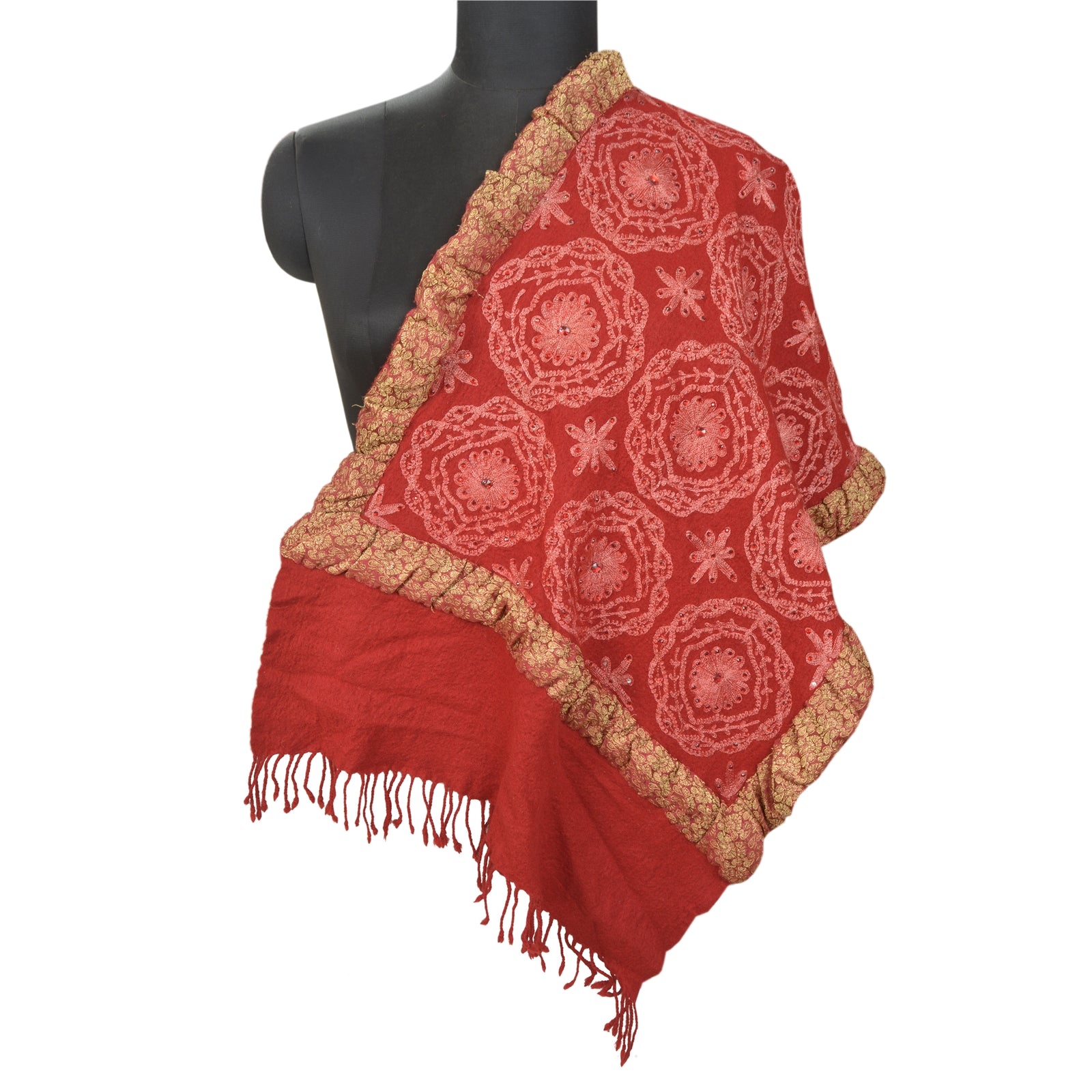 Beautiful Vintage dark red color 100% pure woolen stole/shawl which adorns hand embroidered Ari work. Center part of the shawl has pink thread work (Ari embroidery), red rhinestones work with floral pattern. Border part of shawl has maroon woven Sustainable Fabric patch work. Shawl Has Matching Fringes On Borders. This cozy, warm and fuzzy stool is soft against skin due to the mellow woolen Sustainable Fabric. A truly gorgeous piece which will also make an admirable gift.