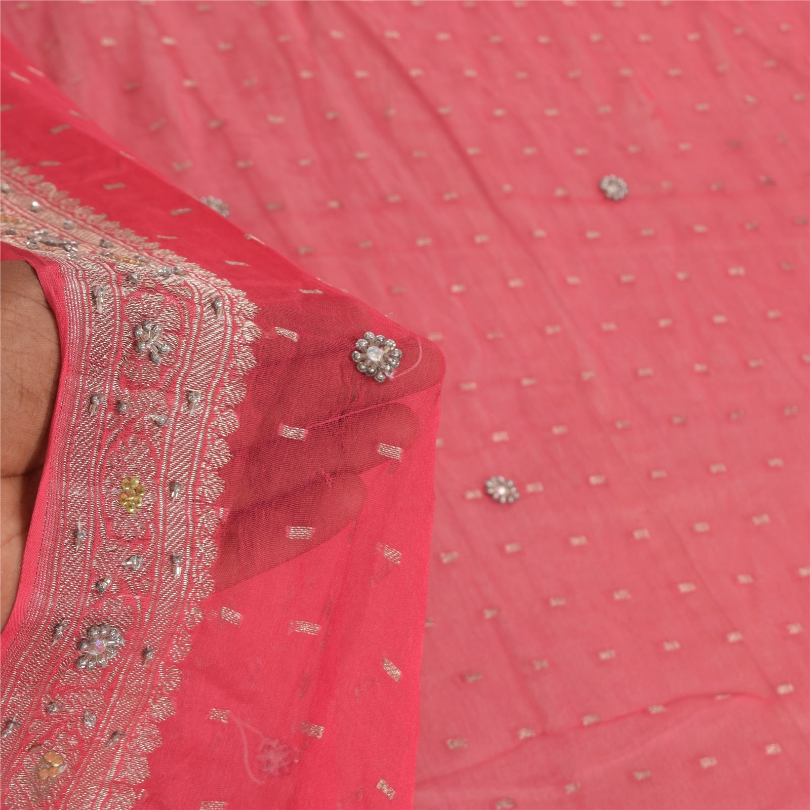 THE ITEM COLOR OR SHADE MAY BE DARKER OR LIGHTER THAN THE PICTURE. Beautiful pink colored pure georgette silk hand embordered & woven long scarf/dupatta. Border of dupatta has floral design with silver woven work & glass beads, sequins, silver beads work. Similar work in center part of dupatta. This dupatta/stole can be used for various crafting ideas too. Use it for dress designing, as a throw, as window dressing, upholstery, table linen and much more. Let your creative juices flow. These Items are pre-owned and well preserved. Shipping Note: International buyers please note: Import duties, taxes, and charges are not included in the item price or postage cost. These charges are the buyer's responsibility. Please check with your country's customs office to determine what these additional costs will be prior to bidding or buying. Buyer will pay custom duty/tax. It is calculated and charged differently by every country. As a seller I do not have any control over it. VAT or sales tax is calculated by the platform at the time of checkout. Customs charge is payable at the time of delivery.' DC-54988