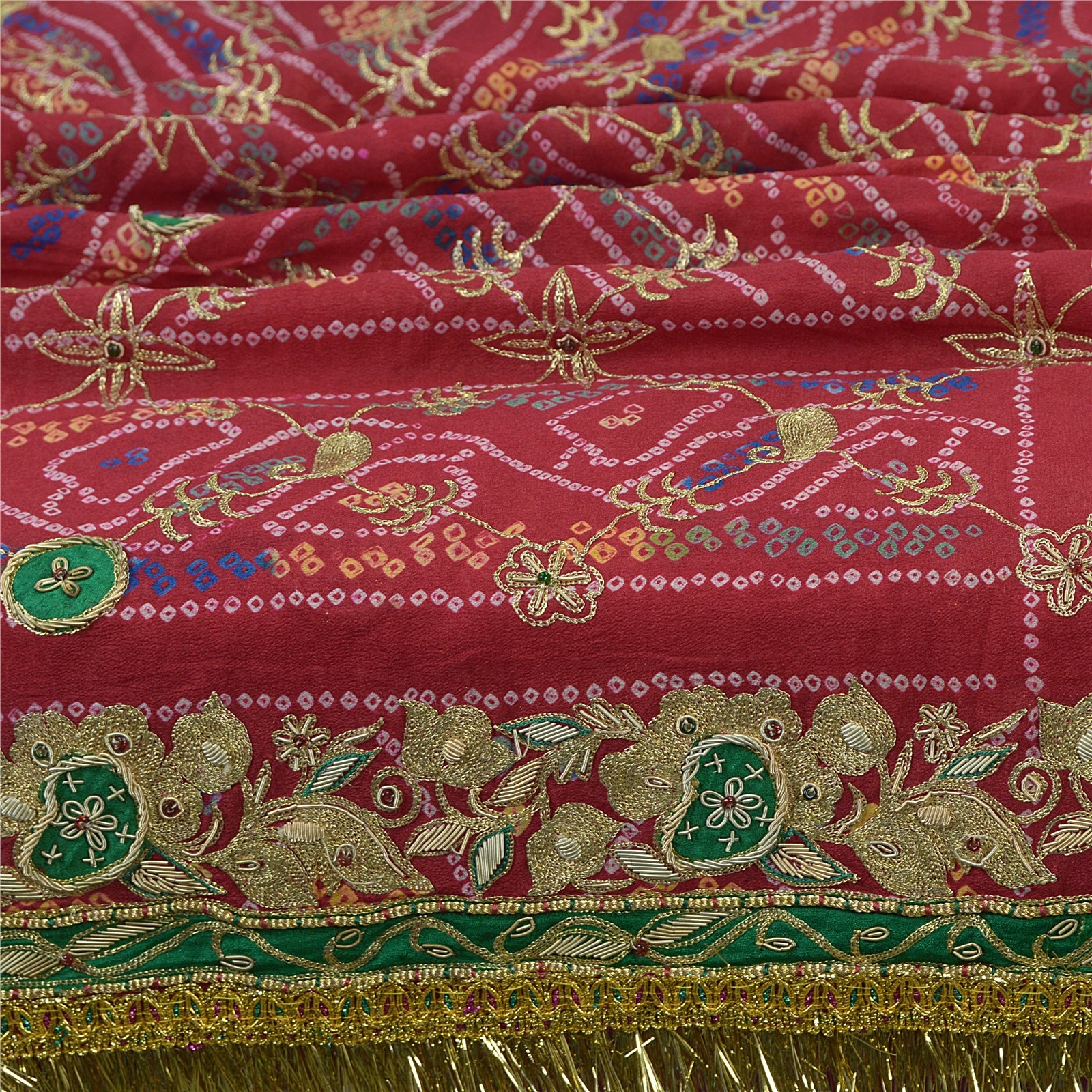 'THE ITEM COLOR OR SHADE MAY BE DARKER OR LIGHTER THAN THE PICTURE.' One Of A Kind Item. Mesmerizing full hand beaded Bandhani dupatta in 100% pure silk stole/Sustainable Fabric. Amazing red color base Sustainable Fabric along with Bandhani work on the dupatta is adding grace to the dupatta. Border features floral & paisley pattern with embellished with metallic golden zari/zardozi work, green glass beads, golden fringes & lace work is looking exquisite. Also you can see similar zari & beaded work in center part of the dupatta/stole. An amazing piece of dupatta. Bandhani design looks fabulous. A very traditional dupatta with beautiful craftsmanship which I am sure you will truly appreciate. 'International buyers please note: Import duties, taxes, and charges are not included in the item price or postage cost. These charges are the buyer's responsibility. Please check with your country's customs office to determine what these additional costs will be prior to bidding or buying. Buyer will pay custom duty/tax. It is calculated and charged differently by every country. As a seller I do not have any control over it. VAT or sales tax is calculated by the platform at the time of checkout. Customs charge is payable at the time of delivery.'