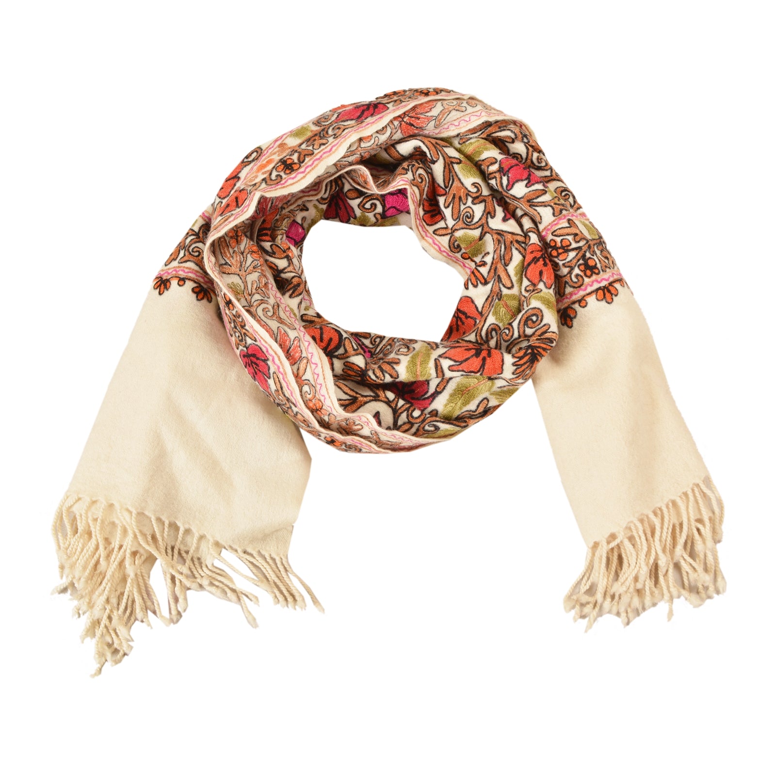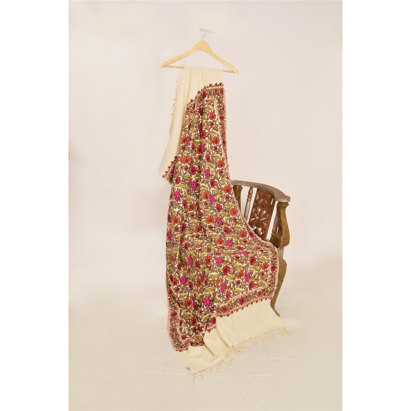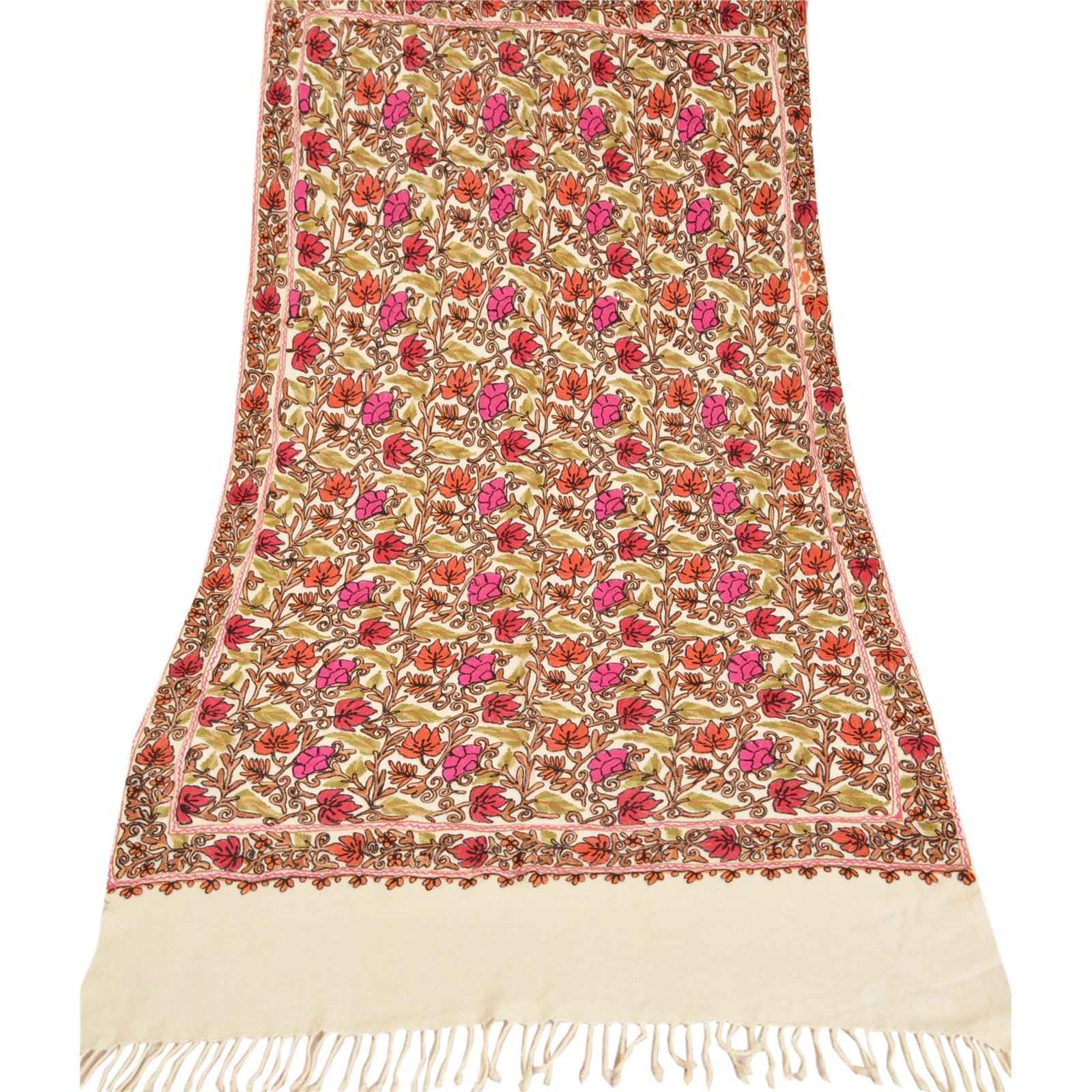 Sanskriti Vintage Long Ivory Pure Woolen Shawl Handmade Ari Work Scarf Stole