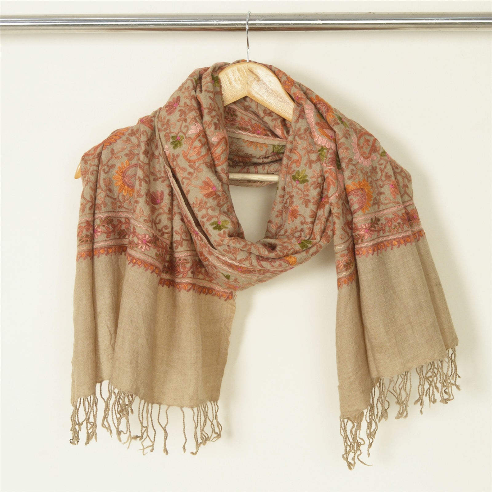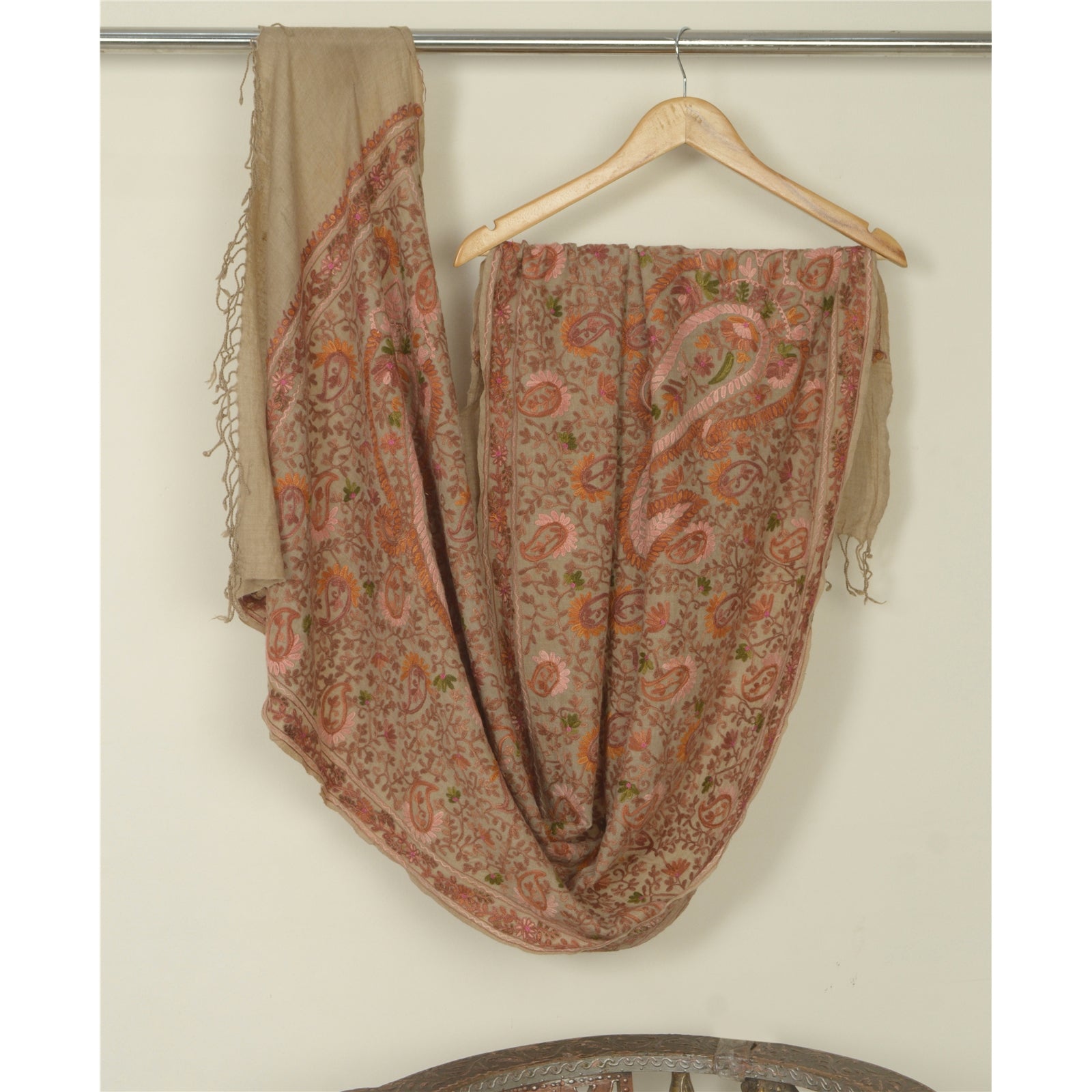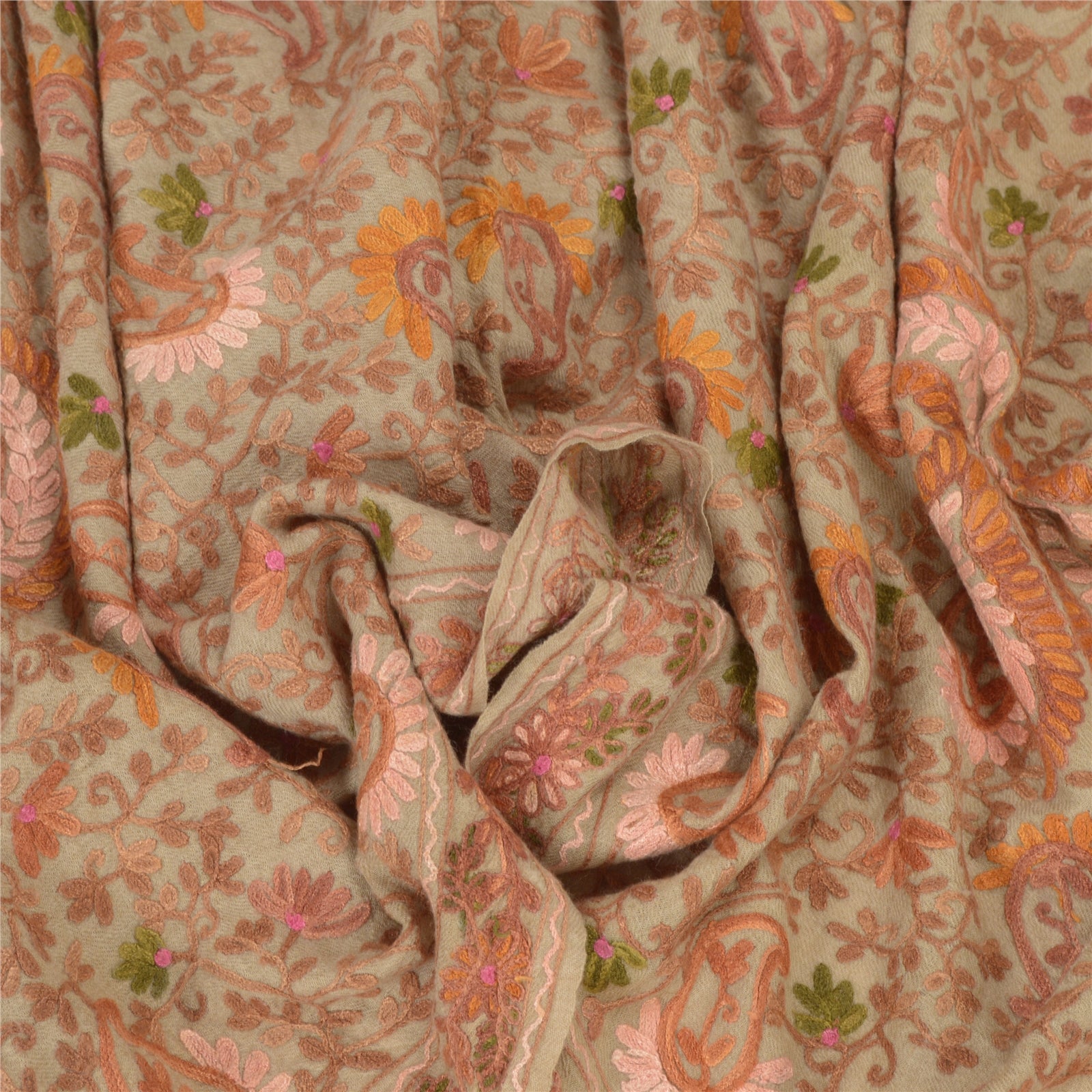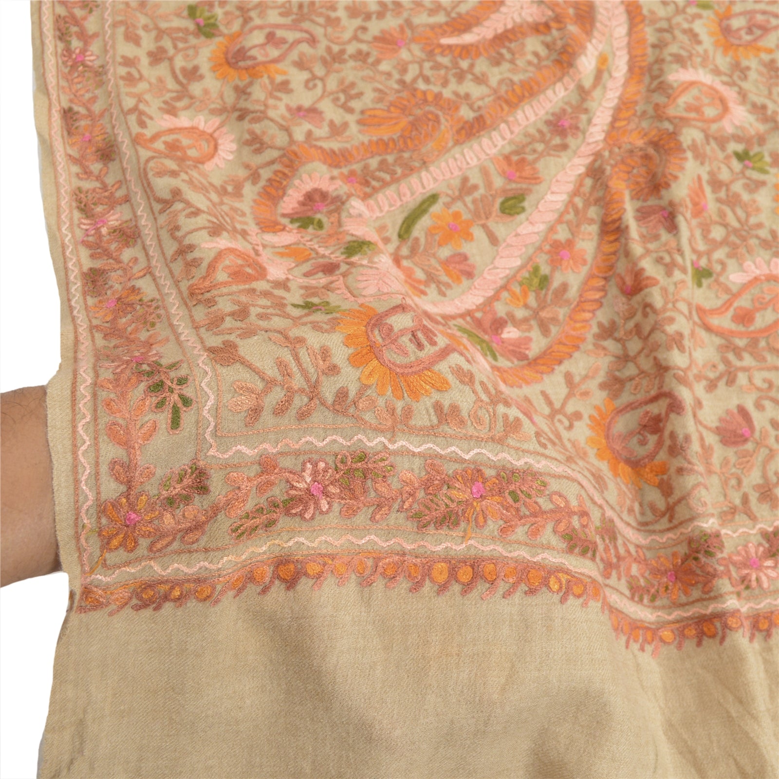 Sanskriti Vintage Long Ivory Pure Woolen Shawl Handmade Ari Work Scarf Stole