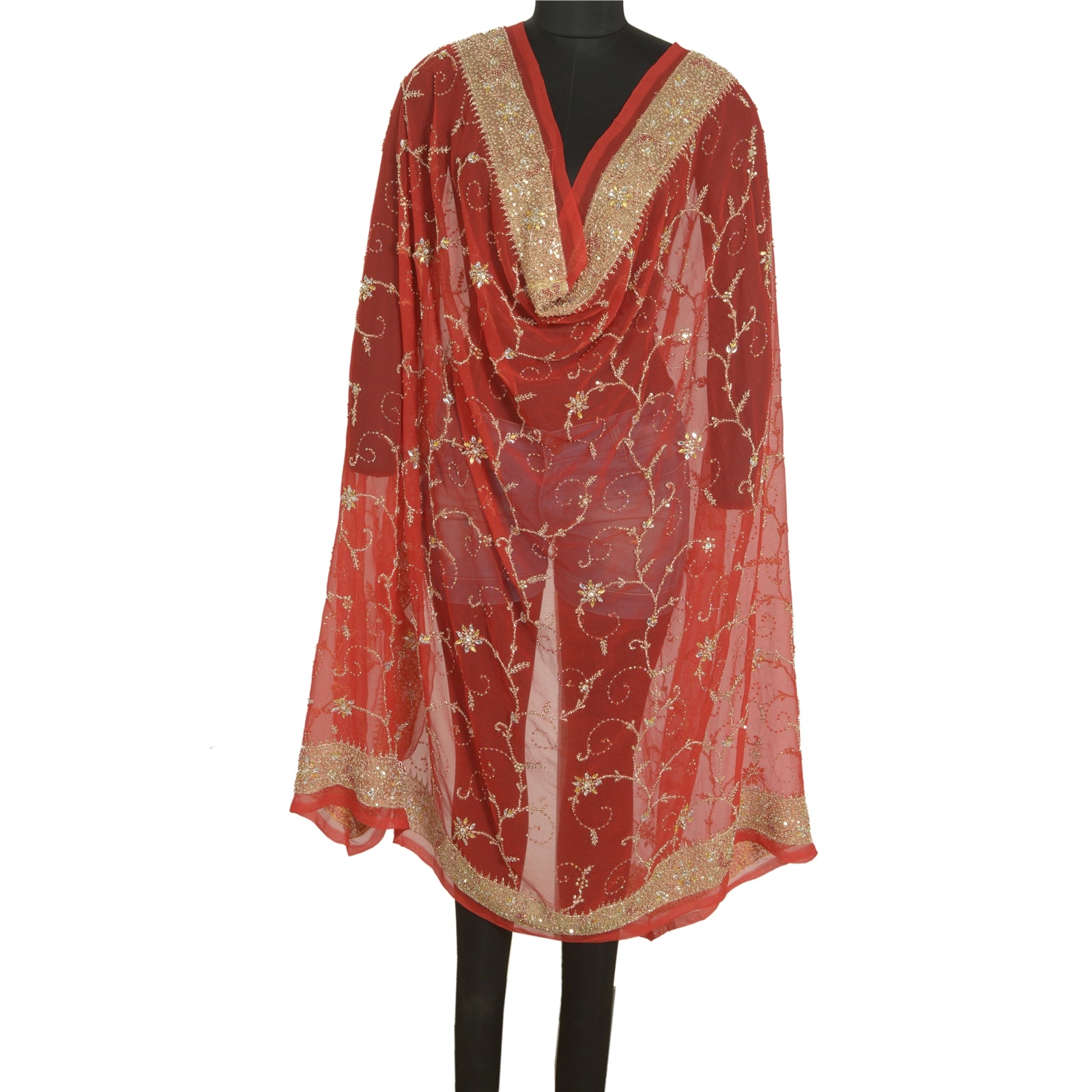 Sanskriti Vintage Long Red Dupatta/Stole Pure Georgette Silk Hand Beaded Veil