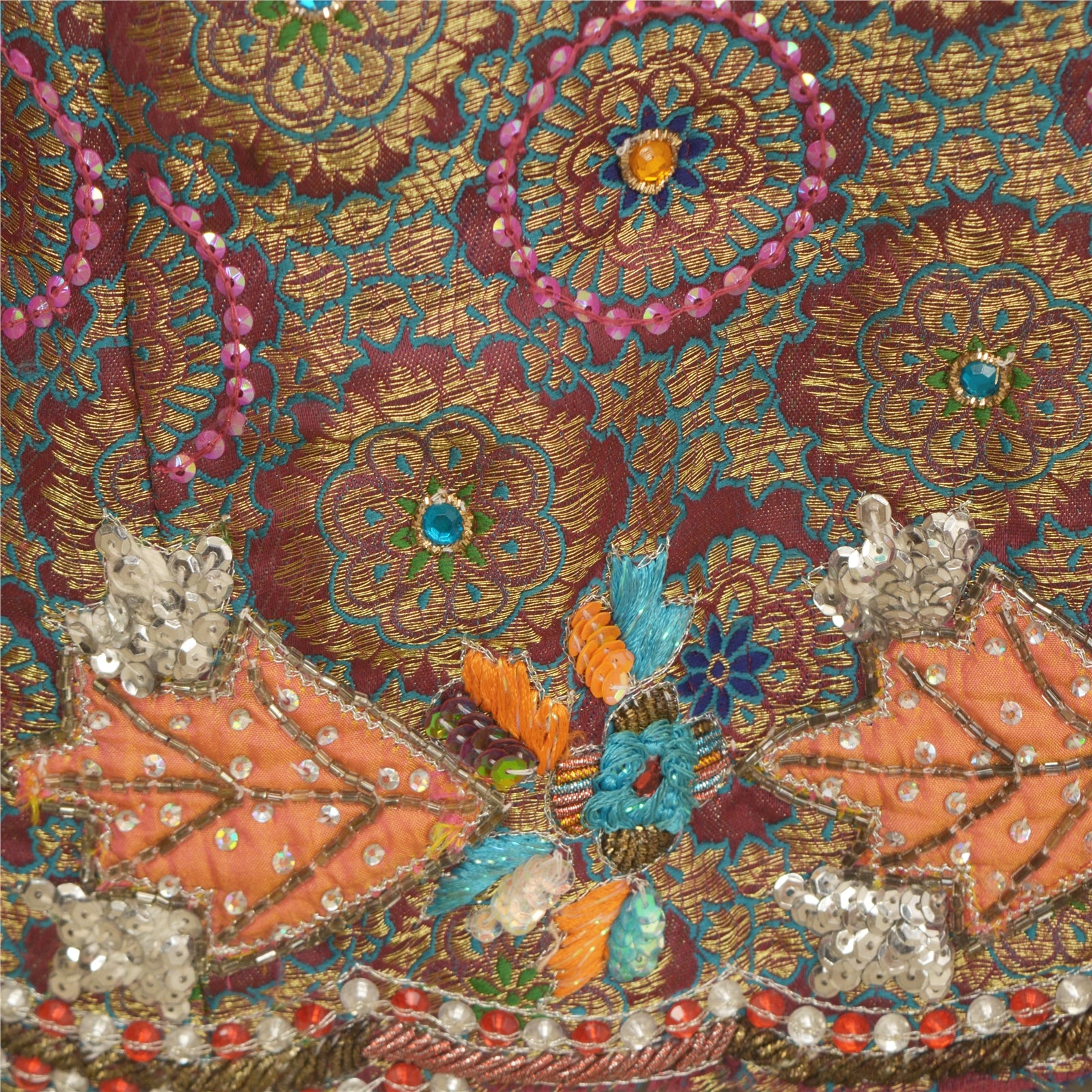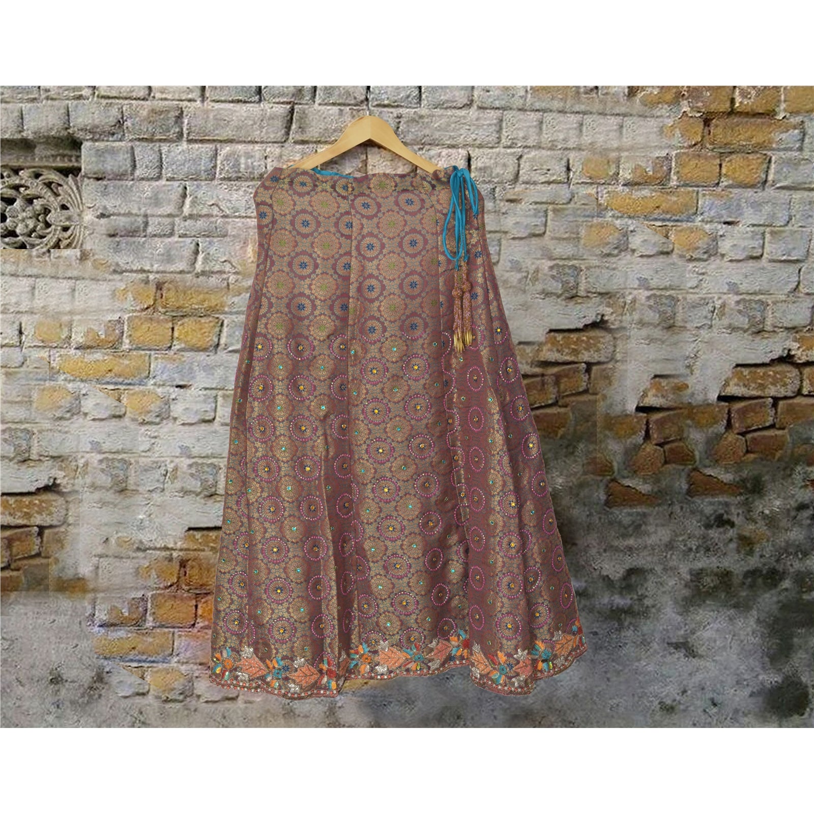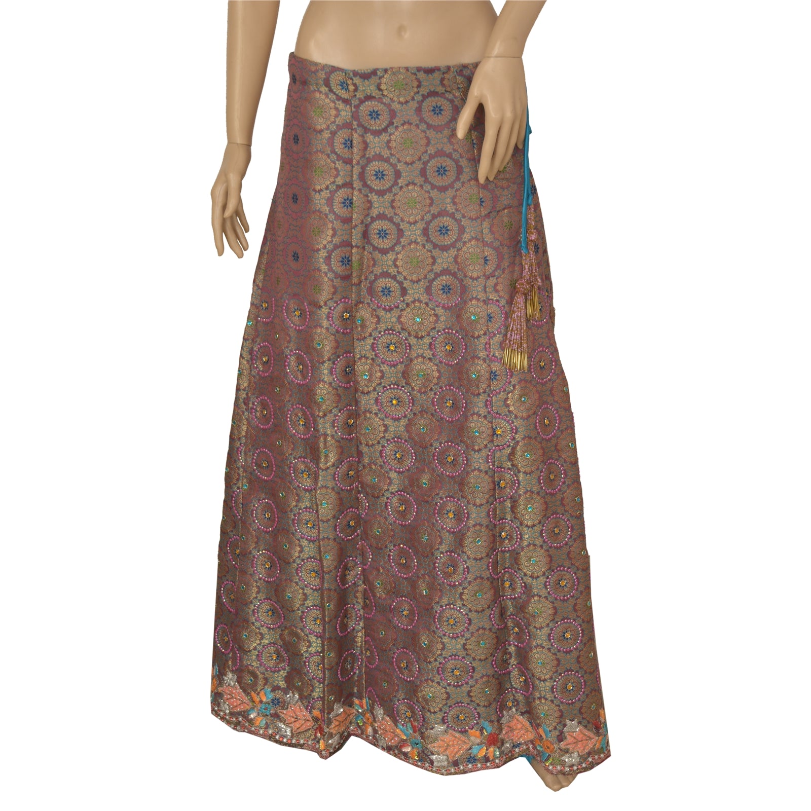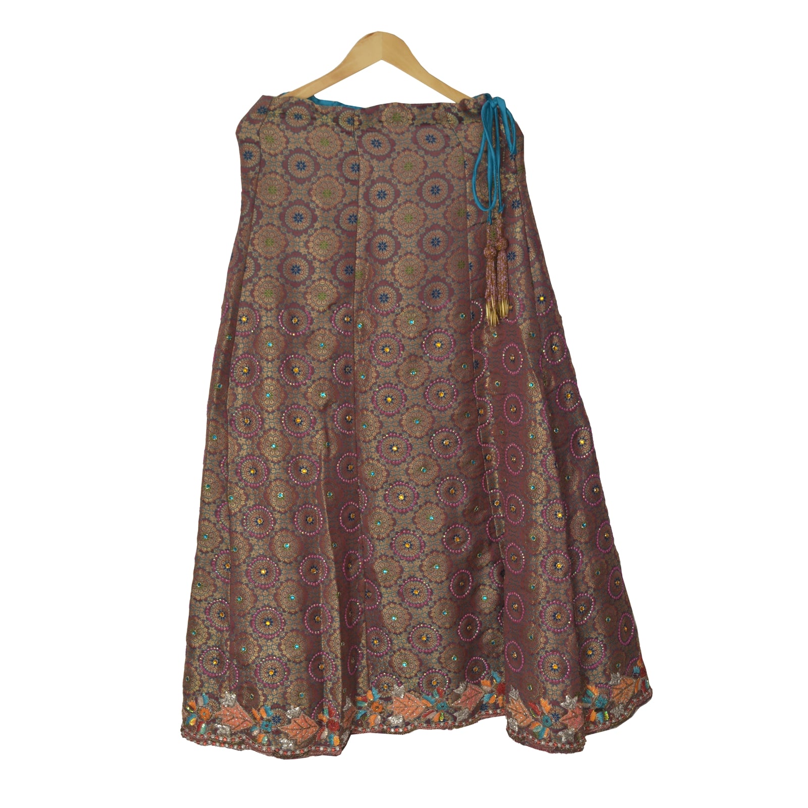 Sanskriti Offers This Vintage Purple color Stitched Long Skirt Made With Brocade Base Sustainable Fabric. Wonderful hand embroidered skirt flare features is multi color thread, peach Sustainable Fabric patch, multicolor sequins, white/red rhinestone, red/golden dabka work. You can see golden zari woven work, sequins & rhinestone work with floral design in center part of the skirt. It is a stitched skirt with a length of 42 inch, flare of the skirt is 100 width- 0 hip size- 38 inch. Flaunt this heavy skirt with ethnic tops, blouses or kurtis at parties, weddings and other occasions. Outstanding hand embroidered work skirt with beautiful craftsmanship which I am sure you will truly appreciate.