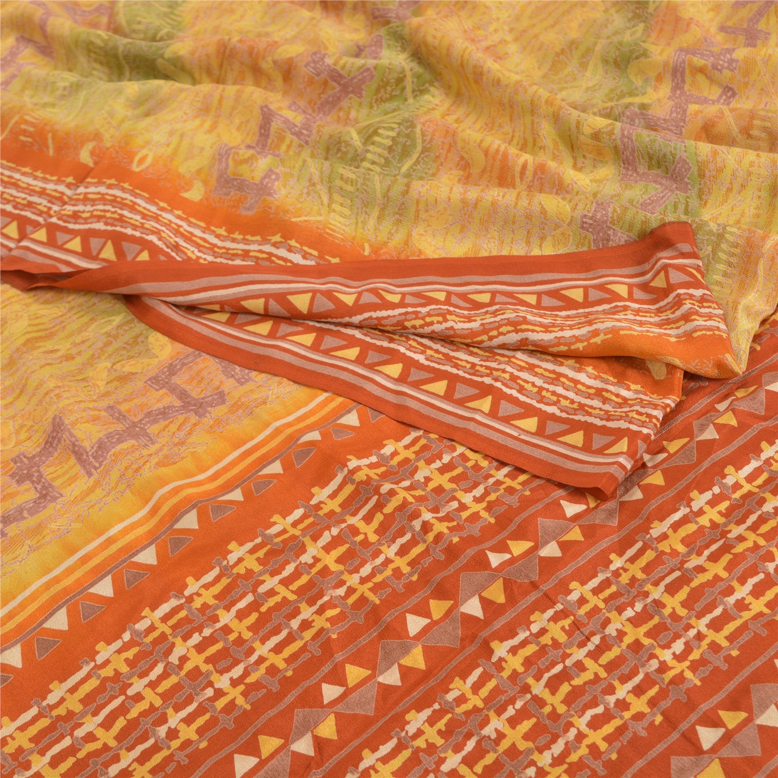 • Ravishing mustard & orange colored printed pure crepe silk saree. • Pallu & Border has printed georgette design. • Abstract design in center part of sari. This unique vintage saree can be used for various crafting ideas even if you don't want to use it as a sari. Design a dress, use it as a as window dressing, upholstery, sarongs, throw, dress making and table linen much more. Let your creative juices flow and use this decorated Sustainable Fabric in multiple fashion.