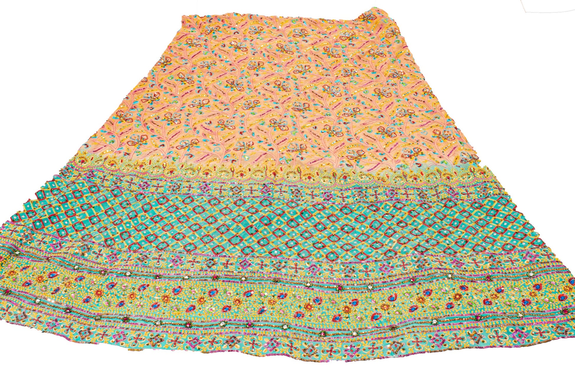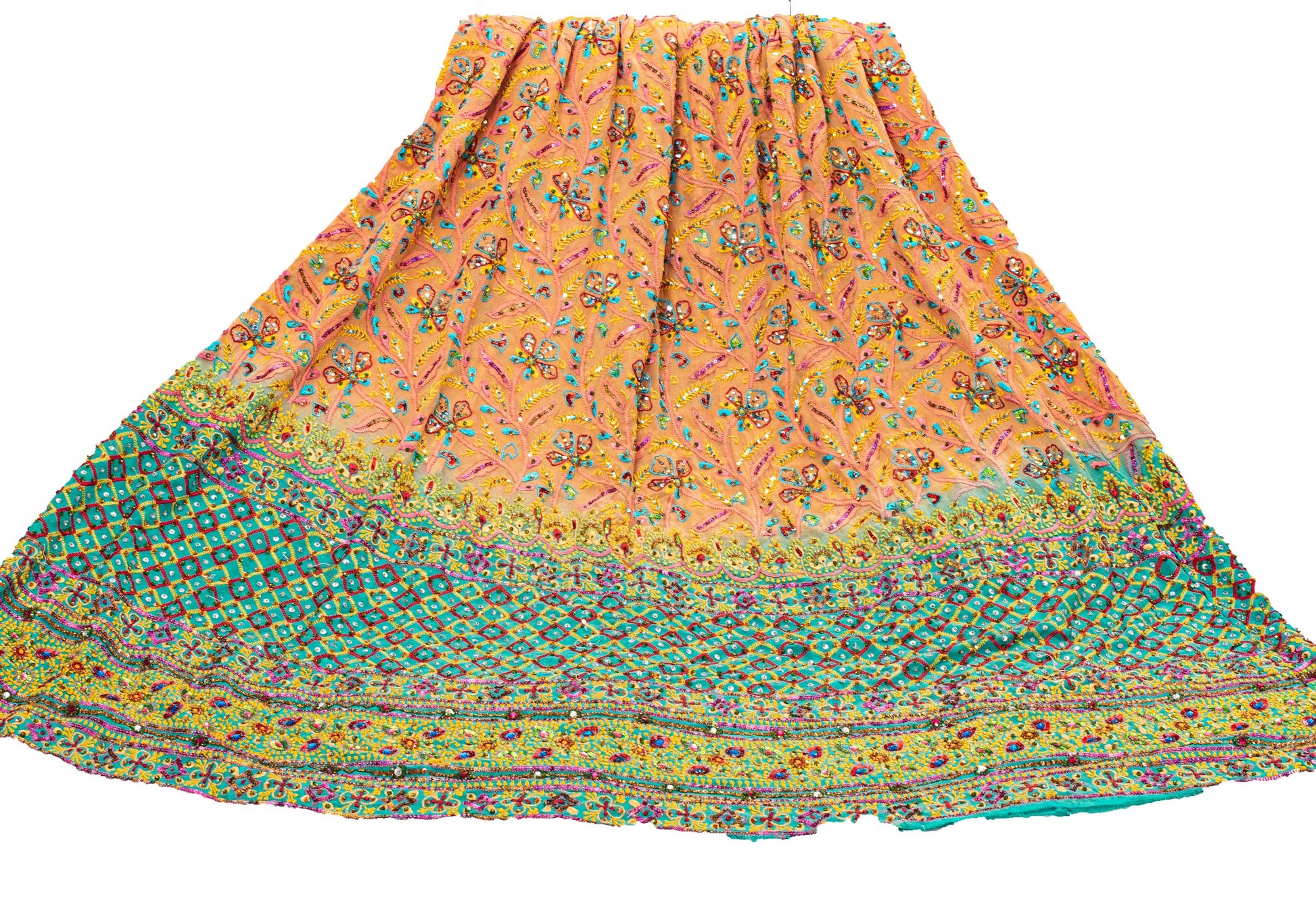 Awesome orange colored vintage pure georgette silk hand embroidered unstitched lehenga. Bottom of lehenga features floral design embellished with thread, sequins, rhinestone & glass beaded work. Similar work on allover lehenga. Length-48, Flare-105 inches, Waist-40 Flaunt this heavy lehenga with ethnic tops, blouses or kurtis at parties, weddings and other occasions. A one of a kind item hard to find. Awesome craftsmanship. THE ITEM COLOR OR SHADE MAY BE DARKER OR LIGHTER THAN THE PICTURE.' International buyers please note: Import duties, taxes, and charges are not included in the item price or postage cost. Buyer will pay custom duty/tax,VAT, and any applicable charges at the time of delivery. L-783