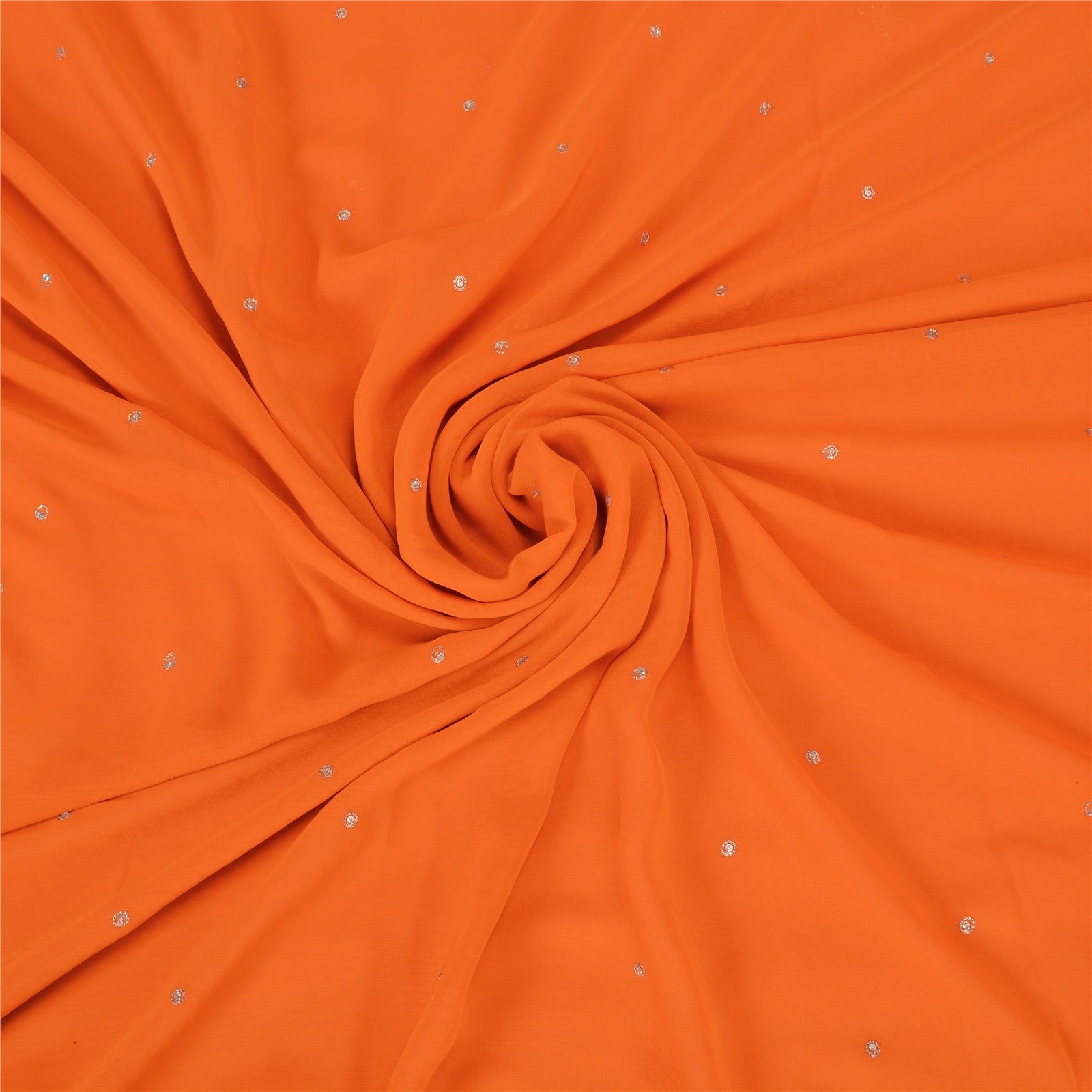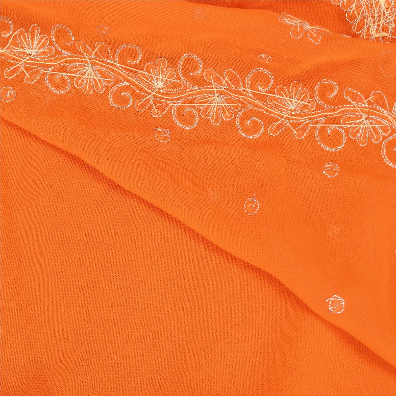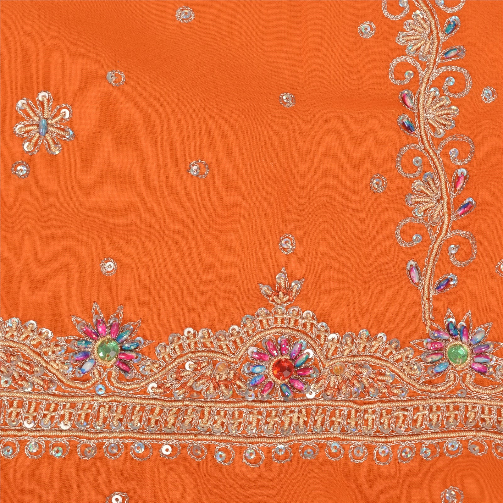 THE ITEM COLOR OR SHADE MAY BE DARKER OR LIGHTER THAN THE PICTURE.' • Beautiful orange colored hand embroidered pure georgette silk sari/Sustainable Fabric. • Pallu & Border features floral design embellished with metallic gold zari/dabka work, gold/orange zardozi work, silver sequins, white glass/multi color beads work, red/green rhinestone work. . • There are floral motifs with similar work in center part of sari. This unique vintage saree can be used for various crafting ideas even if you don't want to use it as a sari. Design a dress, use it as a throw, as window dressing, upholstery, sarongs, table linen and much more. Let your creative juices flow and use this decorated Sustainable Fabric in multiple fashion. Shipping note: International buyers please note: Import duties, taxes, and charges are not included in the item price or postage cost. These charges are the buyer's responsibility. Please check with your country's customs office to determine what these additional costs will be prior to bidding or buying. Buyer will pay custom duty/tax. It is calculated and charged differently by every country. As a seller I do not have any control over it. VAT or sales tax is calculated by the platform at the time of checkout. Customs charge is payable at the time of delivery. SKu: PS-40793