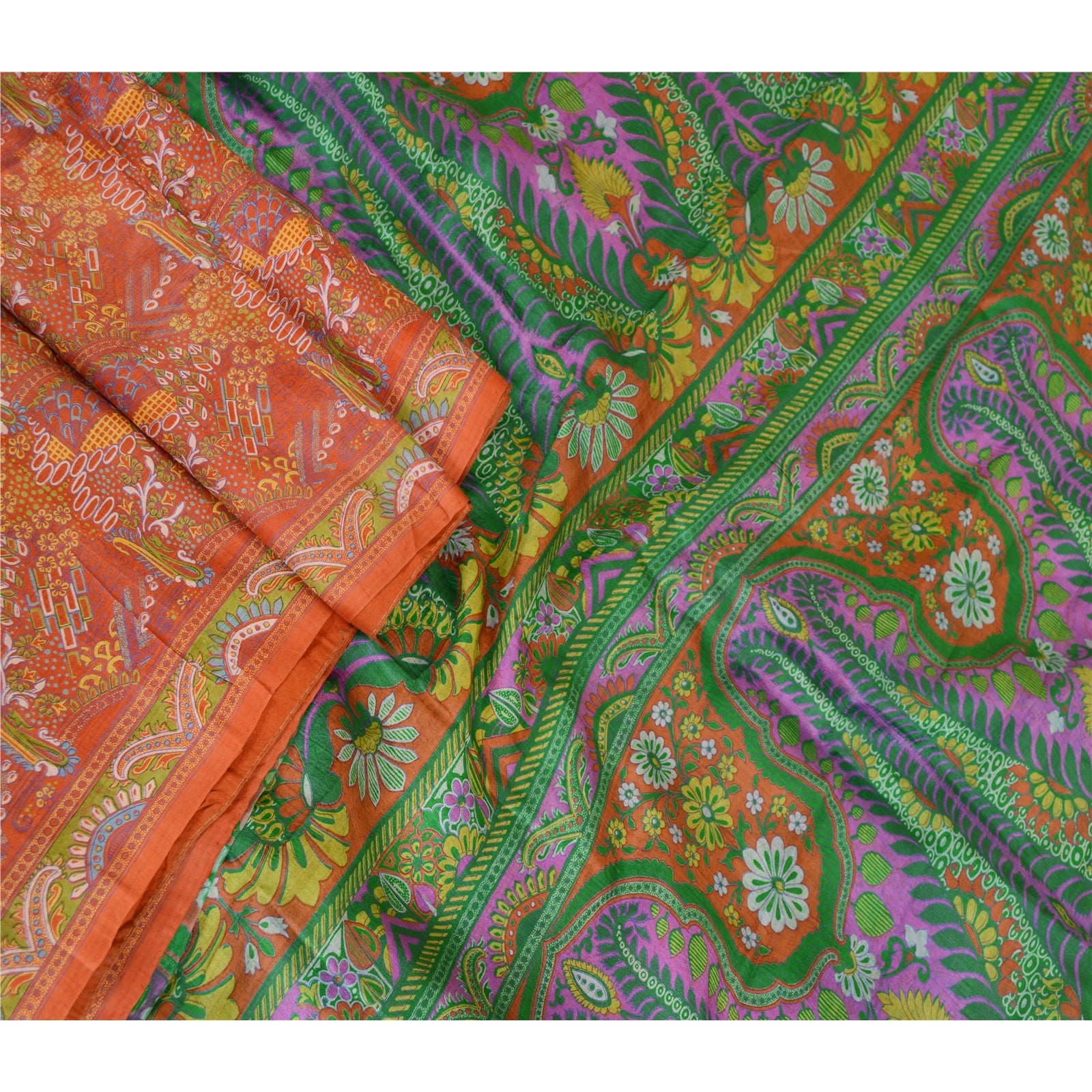 Beautiful orange & green colored pure silk printed saree. Pallu & Border has printed floral design. Similar desgin in center part of saree. What is special about this saree? Fabulous design is really enhancing the beauty of the saree.This unique vintage saree can be used for various crafting ideas even if you don't want to use it as a sari. Design a dress, use it as window,dressing, upholstery, sarongs, throw, dress making and table linen much more. Let your creative juices flow and use this decorated Sustainable Fabric in multiple fashion.