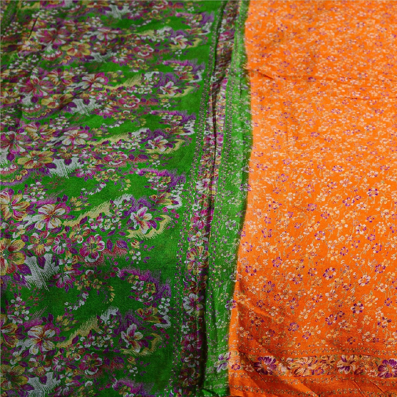 Beautiful orange & green colored pure silk printed saree. Pallu has printed floral design. Floral design in center part of saree. What is special about this saree? Fabulous design is really enhancing the beauty of the saree.This unique vintage saree can be used for various crafting ideas even if you don't want to use it as a sari. Design a dress, use it as window,dressing, upholstery, sarongs, throw, dress making and table linen much more. Let your creative juices flow and use this decorated Sustainable Fabric in multiple fashion.
