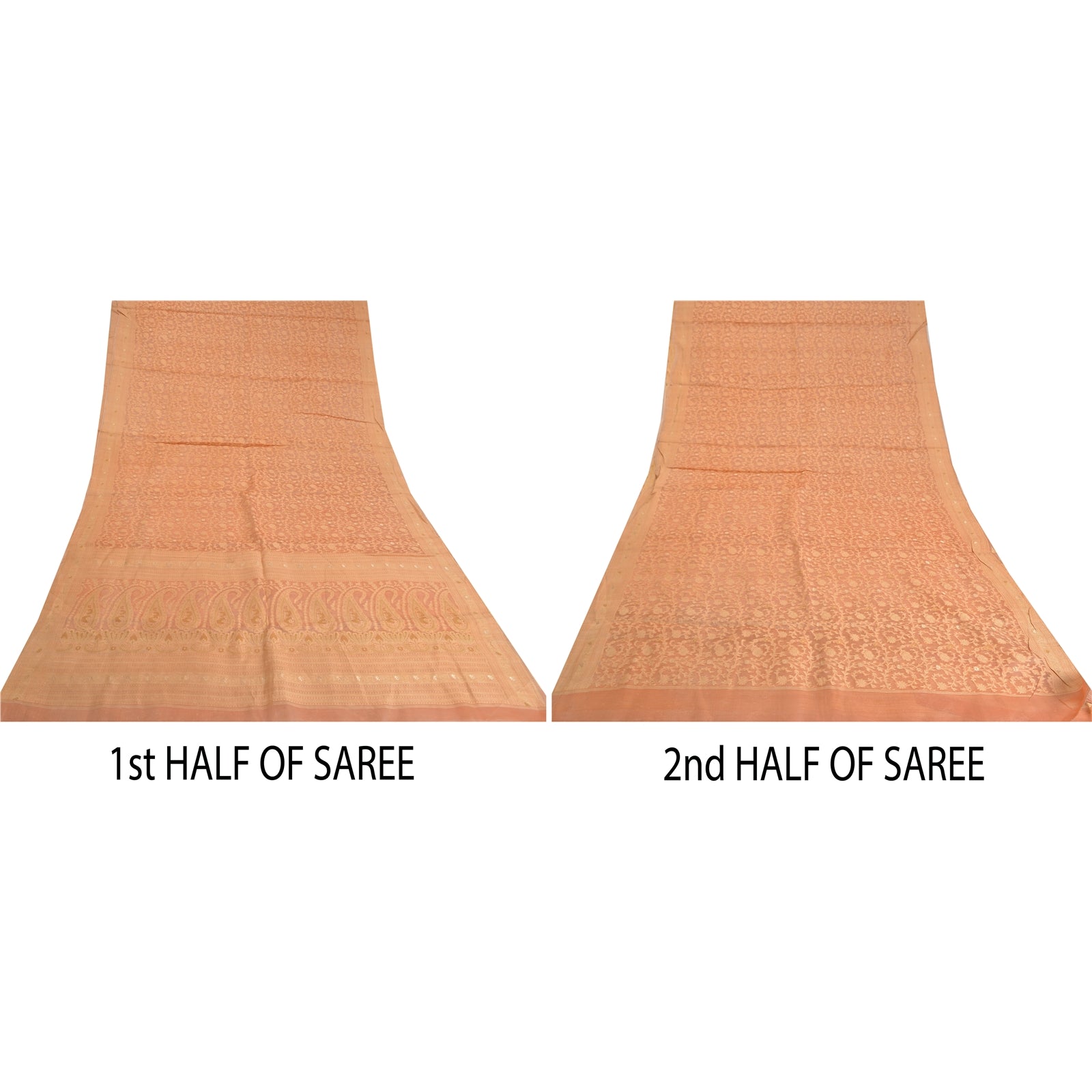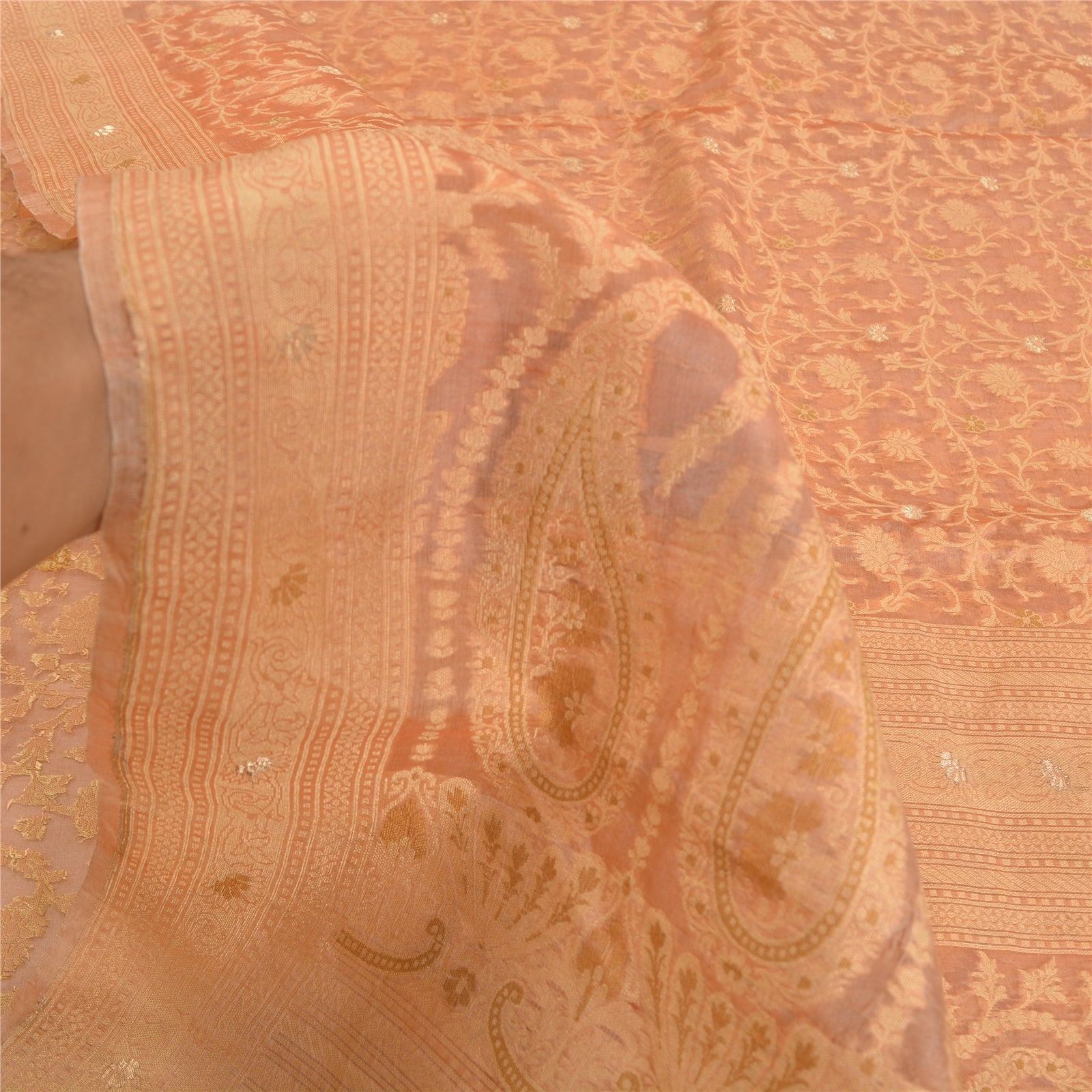 THE ITEM COLOR OR SHADE MAY BE DARKER OR LIGHTER THAN THE PICTURE.' Beautiful Peach Colored 100% Pure Silk Woven Sari/Fabric. Pallu & border features floral & paisley design embellished with metallic golden zari work, yellow glass beads, purple pearl like beads with jaal design. The center part of the sari has floral design with zari & beaded work. This saree can be used for various crafting ideas too. Use it for dress designing, as a throw, as window dressing, upholstery, table linen and much more. Let your creative juices flow. International buyers please note: Import duties, taxes, and charges are not included in the item price or postage cost. These charges are the buyer's responsibility. Please check with your country's customs office to determine what these additional costs will be prior to bidding or buying. Buyer will pay custom duty/tax. It is calculated and charged differently by every country. As a seller I do not have any control over it.VAT or sales tax is calculated by the platform at the time of checkout. Customs charge is payable at the time of delivery.