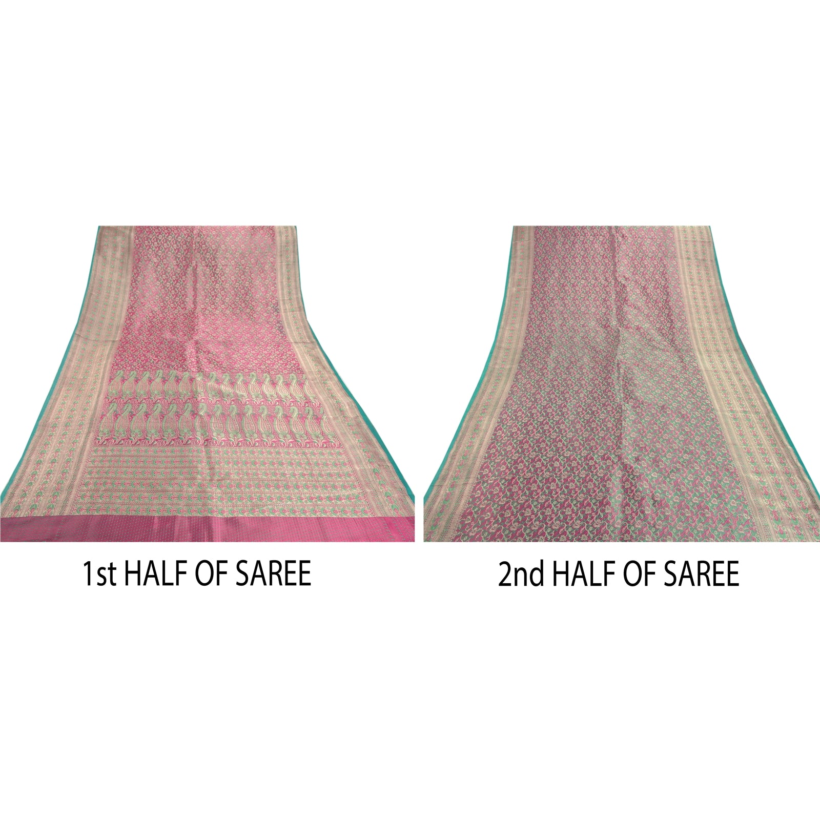 Sanskriti Offers This Vintage Pink Color Woven Brocade/Banarasi Heavy Saree Which Is Crafted With Art (Artificial) Silk Base Sustainable Fabric The pallu & border sari features floral & paisley design embellished with pure metallic golden zari work, pink/green thread woven work. The center part of sari boasts similar woven work. This heavy saree can be used for various crafting ideas too. Use it for dress designing, as a throw, as window dressing, upholstery, table linen and much more. Let your creative juices flow! The quality of zari work is amazing, its a pure metallic zari. Some zari work gives a antique look. As the item is vintage some mild stains are visible.