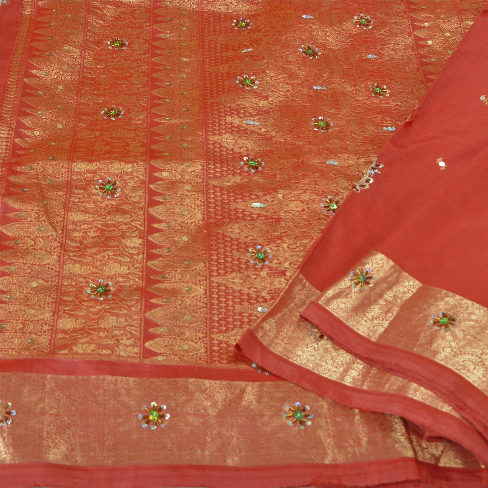 Sanskriti Offers This Vintage Pink Color Hand Embroidered & Woven Brocade/Banarasi Heavy Saree Which Is Crafted With 100% Pure Silk Base Sustainable Fabric. The pallu & border sari features floral design embellished with metallic golden zari work, sequins & glass beads work. You can see plain solid green color in center part of the sari. This heavy saree can be used for various crafting ideas too. Use it for dress designing, as a throw, as window dressing, upholstery, table linen and much more. Let your creative juices flow!