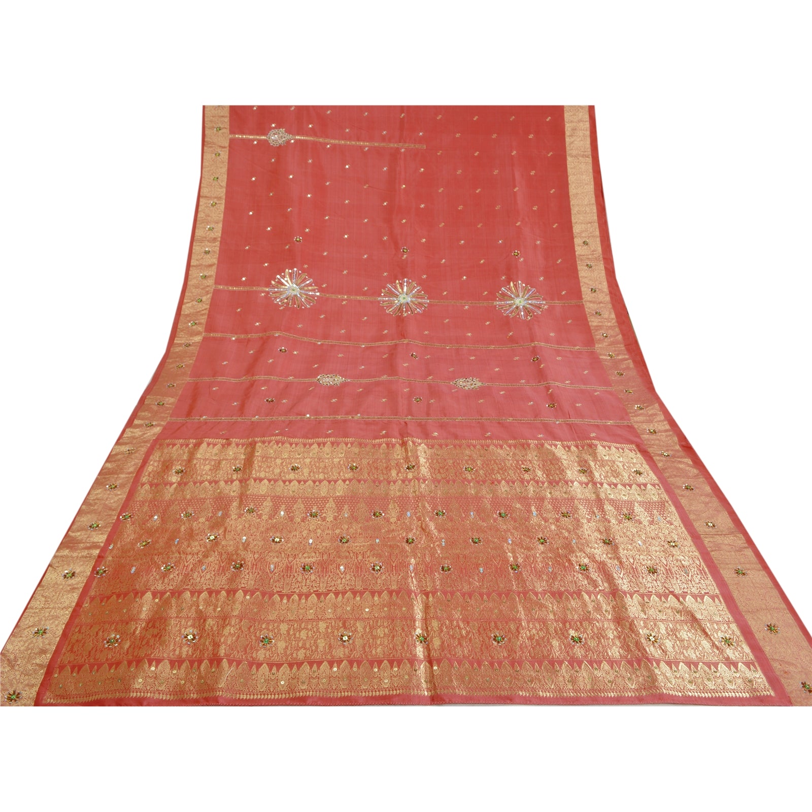 Sanskriti Vintage Pink Heavy Sarees Pure Silk Hand Beaded Brocade Sari Sustainable Fabric