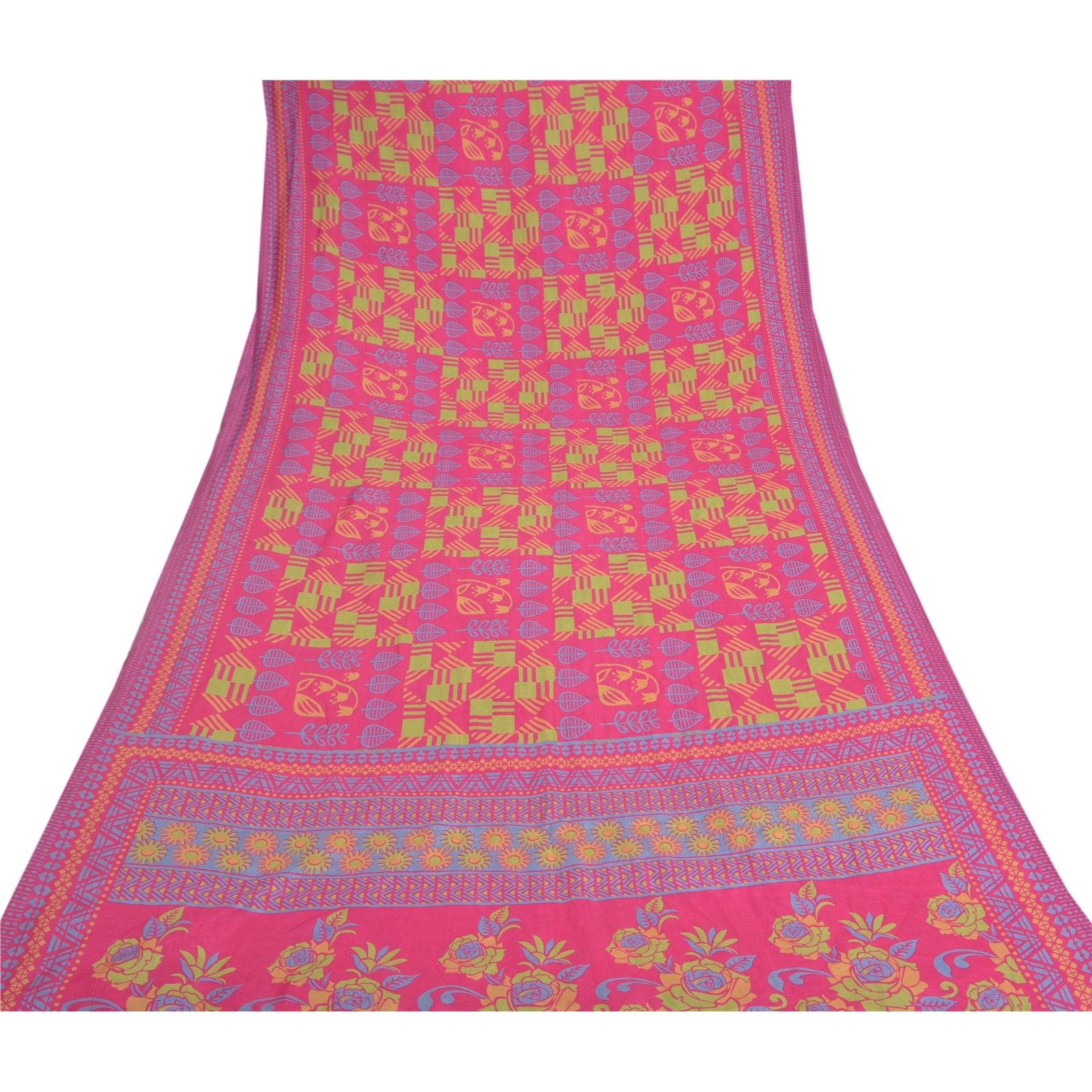 Sanskriti Vintage Pink Sarees Moss Crepe Floral Printed Craft Sustainable Fabric 5 Yard Sari