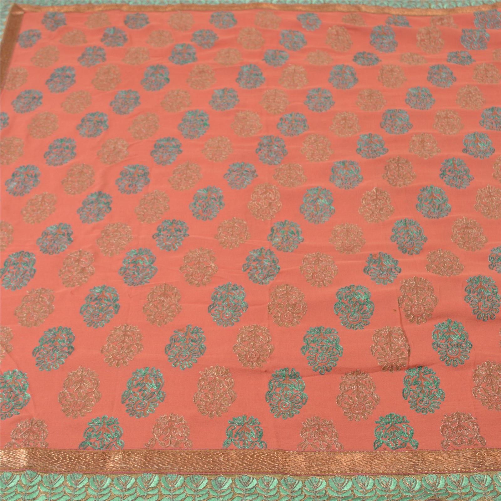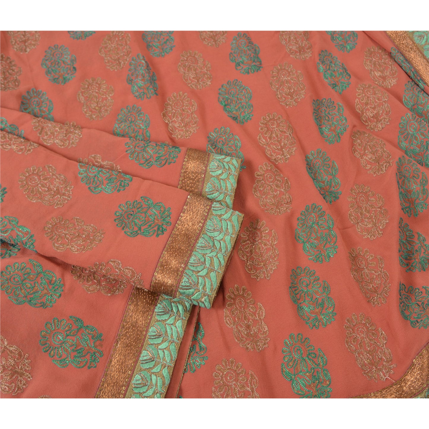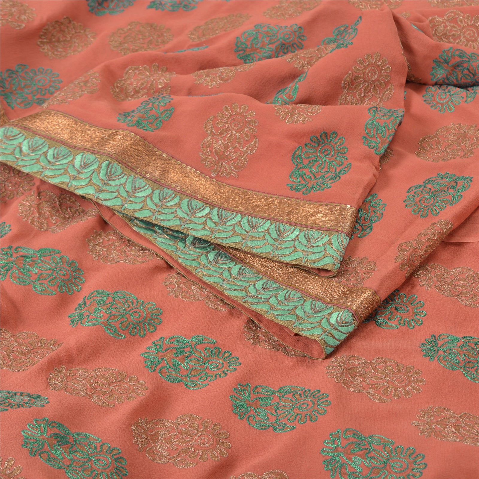 'THE ITEM COLOR OR SHADE MAY BE DARKER OR LIGHTER THAN THE PICTURE.' What a wonderful saree in pink in pure georgette Sustainable Fabric. Base Sustainable Fabric with floral design adorned with green and brown thread work, copper zari work is adding grace to the saree. You can see the gorgeous border work in green threadwork and golden sequins all around. WOW !! a great saree. 'International buyers please note: Import duties, taxes, and charges are not included in the item price or postage cost. These charges are the buyer's responsibility. Please check with your country's customs office to determine what these additional costs will be prior to bidding or buying. Buyer will pay custom duty/tax. It is calculated and charged differently by every country. As a seller I do not have any control over it. VAT or sales tax is calculated by the platform at the time of checkout. Customs charge is payable at the time of delivery.