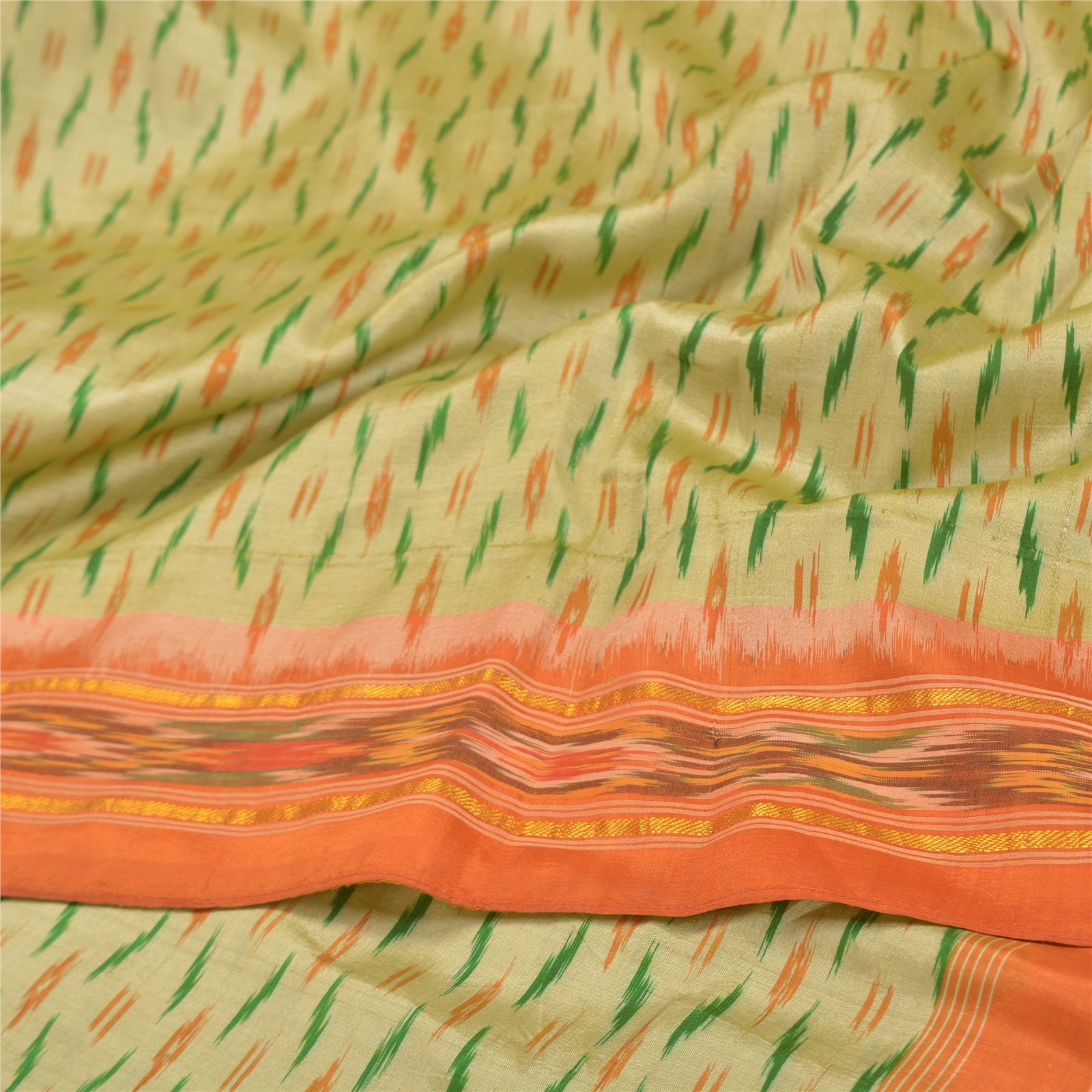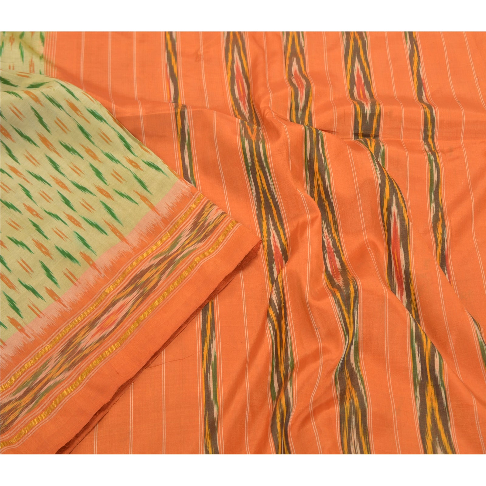 Sanskriti Vintage Pochampally Green Hand Woven Ikat Sarees Pure Silk Sari Sustainable Fabric