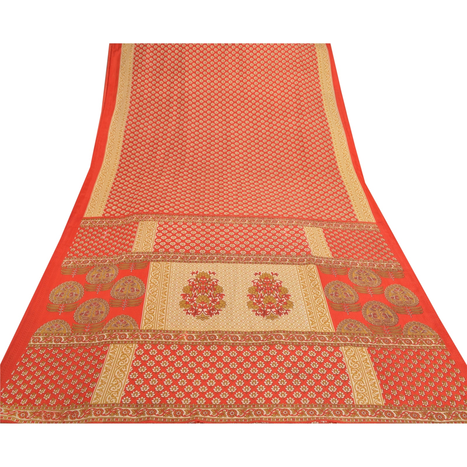 Sanskriti Vintage Red Indian Sarees Moss Crepe Printed Blouse Piece Sari Sustainable Fabric
