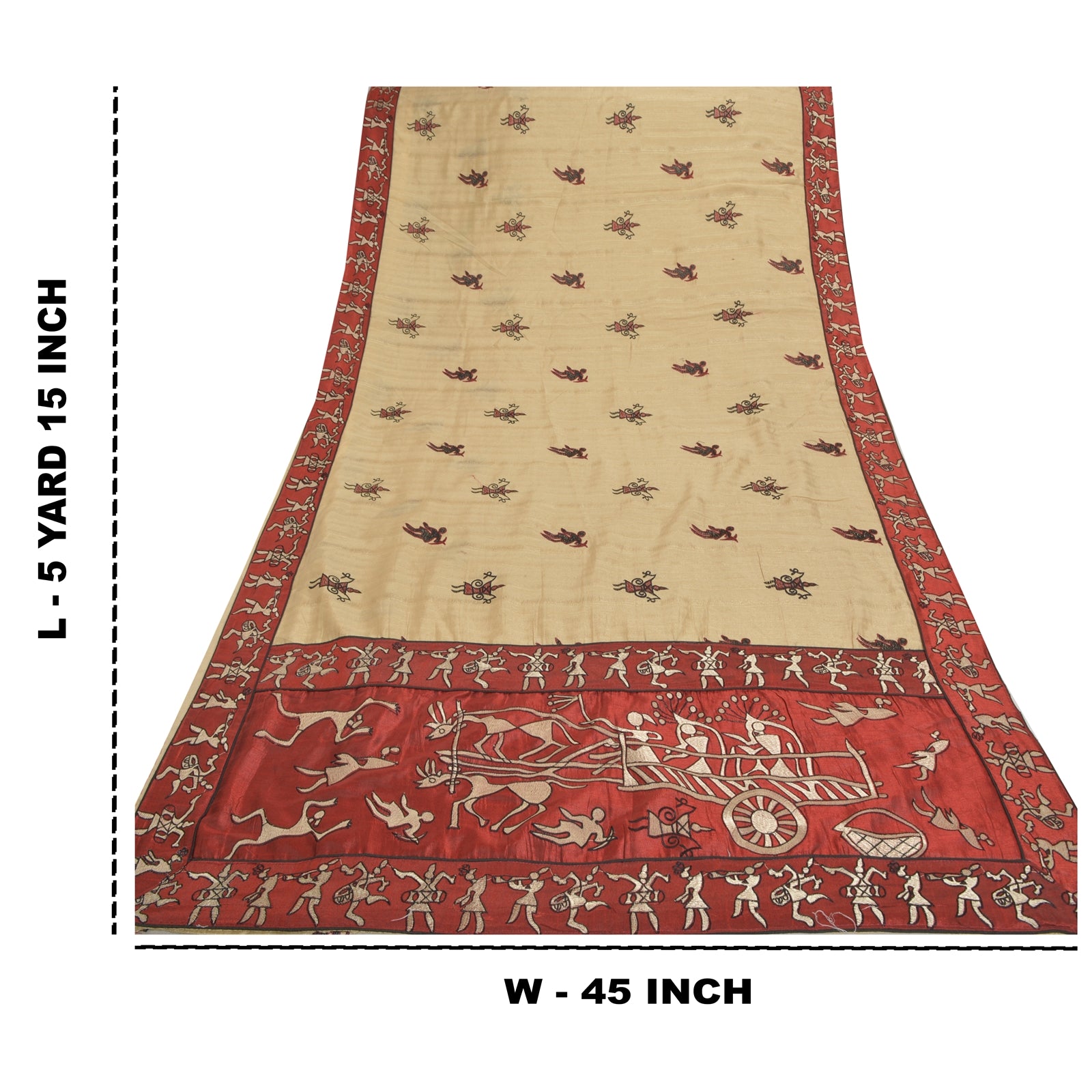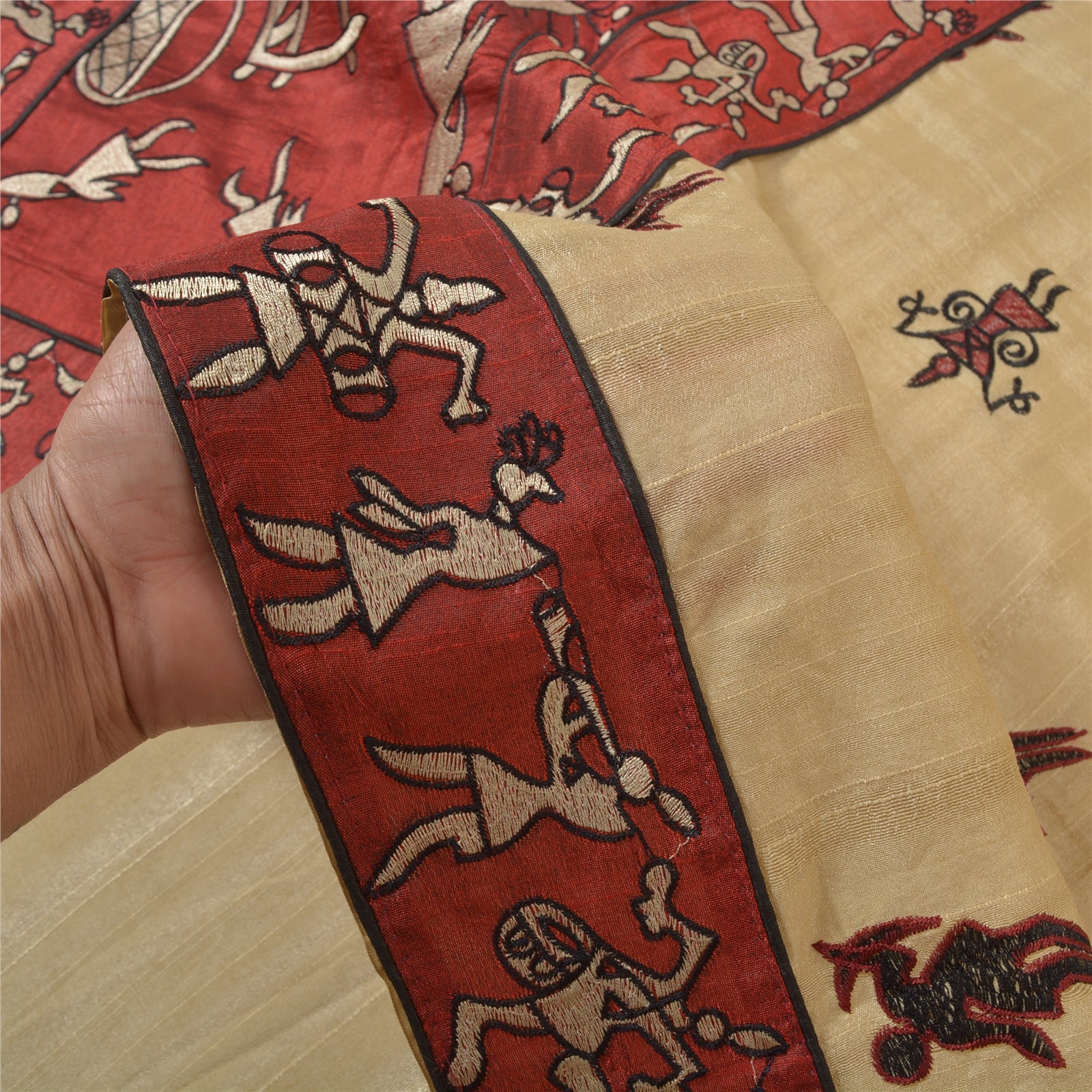 Beautiful Red & Cream Colored Art (Artificial) Silk Embroidered Warli Art Sari. Pallu & Border features floral & depicting life of tribals design embroidered with cream/black thread work. Also you can see similar thread & pattern in center part of the sari. What is special about this saree? Traditional warli art work with wonderful pattern is really enhancing the beauty of the saree.