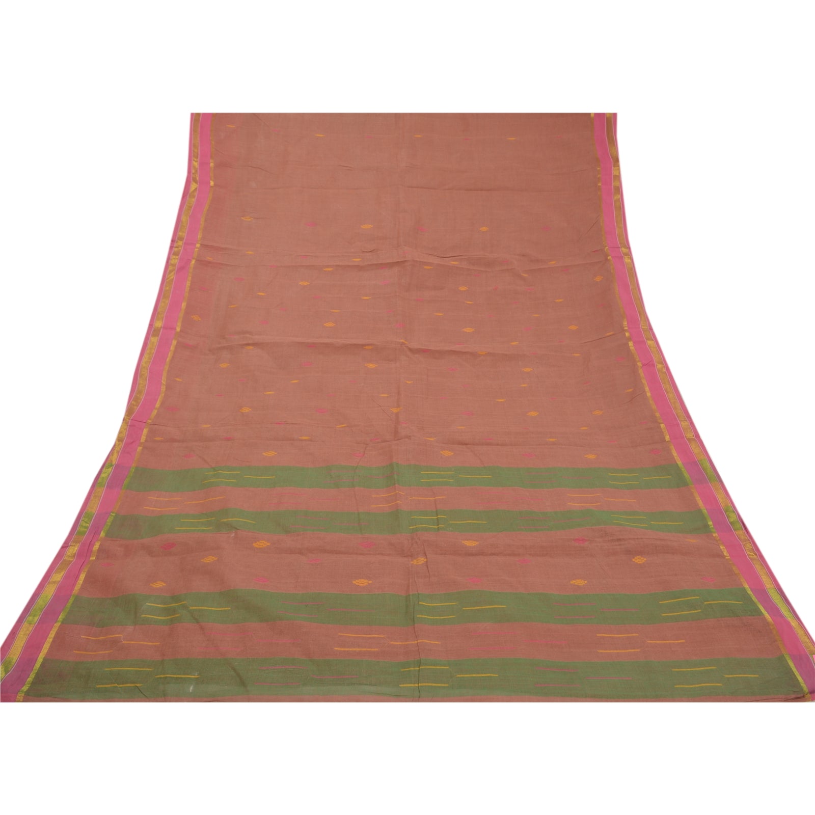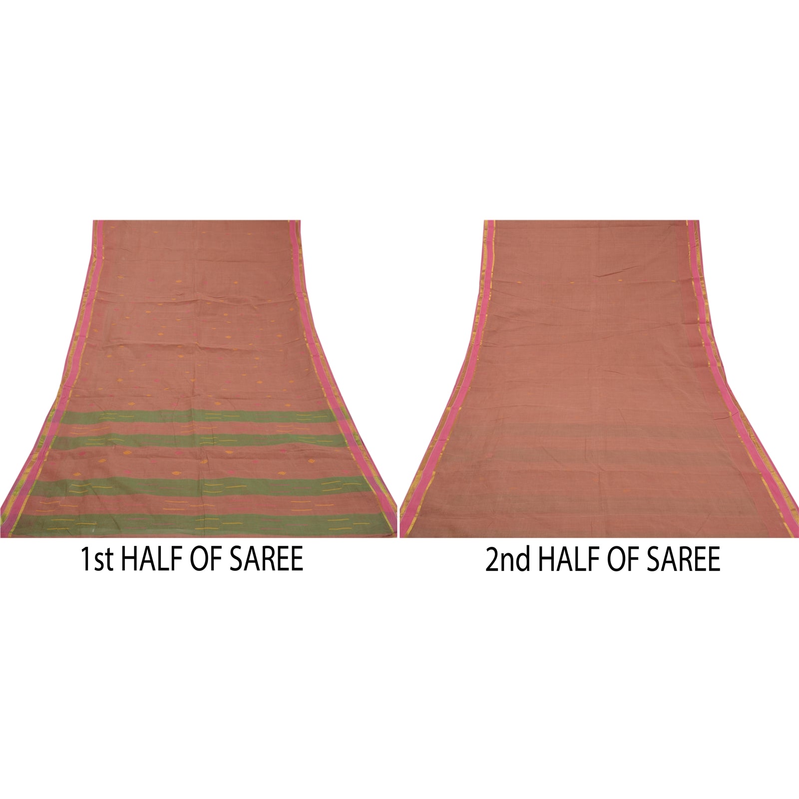 Beautiful Rose Ash Colored 100% Pure Cotton Hand-Woven Tant Sari. Pallu & Border features hand-woven work with floral motifs. Similar woven work with floral motifs in center part of the sari. What is special about this saree? TANT SARI:Tant saree is the traditional saree of West Bengal (Eastern India). It is woven from cotton threads and distinguished by its lightness and transparency. It is considered to be the most comfortable saree for the Indian hot and humid climate. The typical Tant saree is characterised by a thick border and a decorative pallav, woven using a variety of floral, paisley and other artistic motifs.  The craftsmen deftly weave the cotton to thread which is used to make a tant saree. As the item is Vintage, some minor stains and defects are expected.