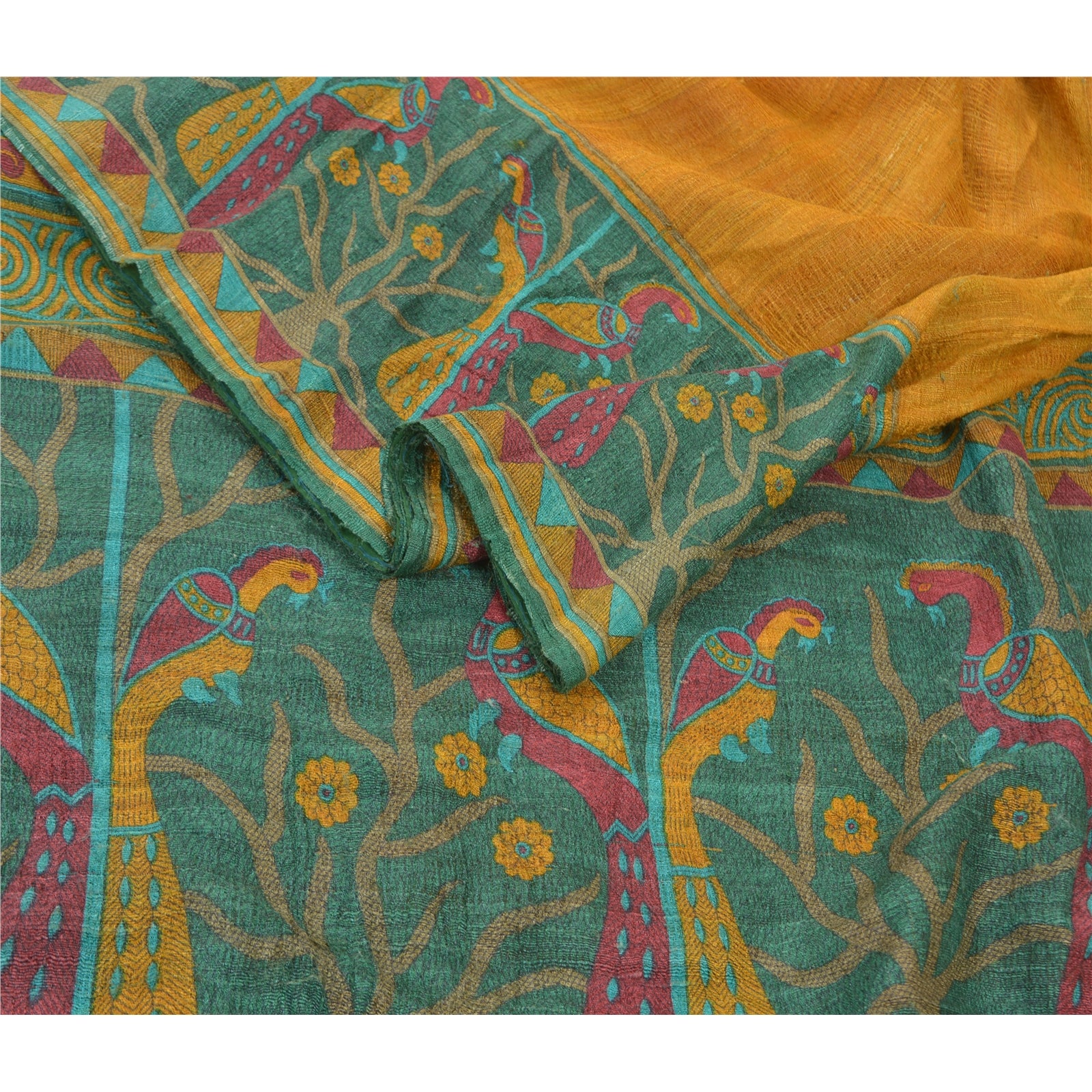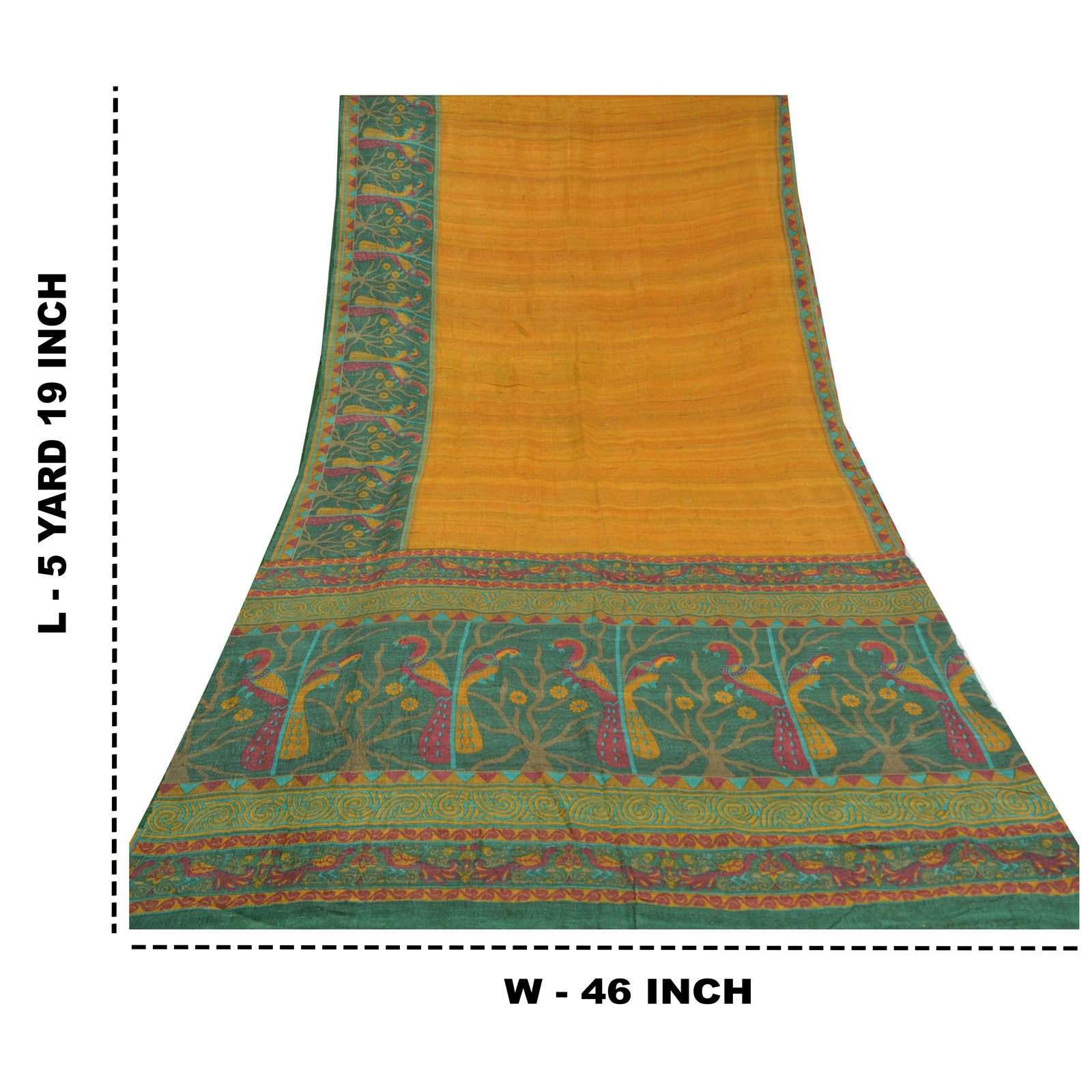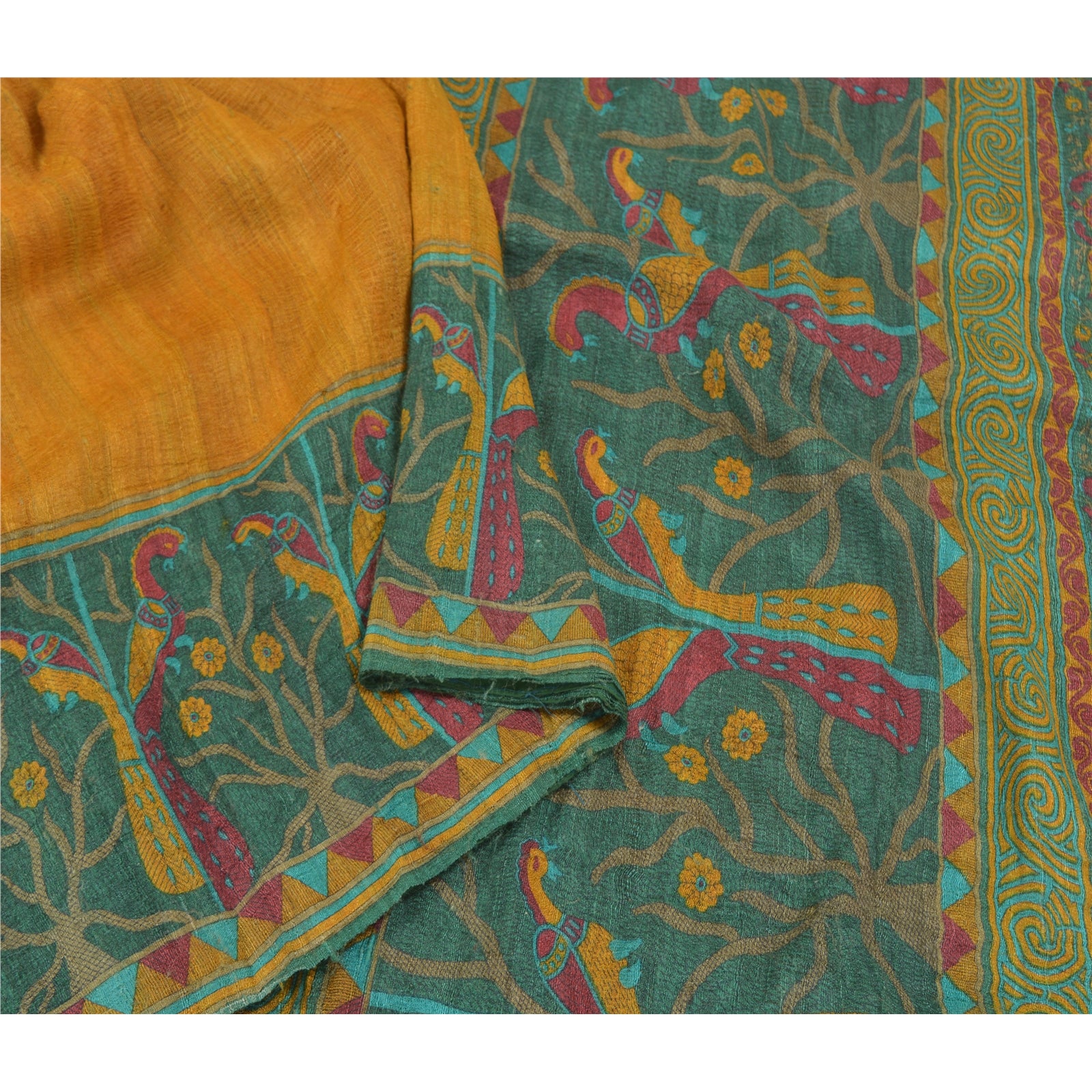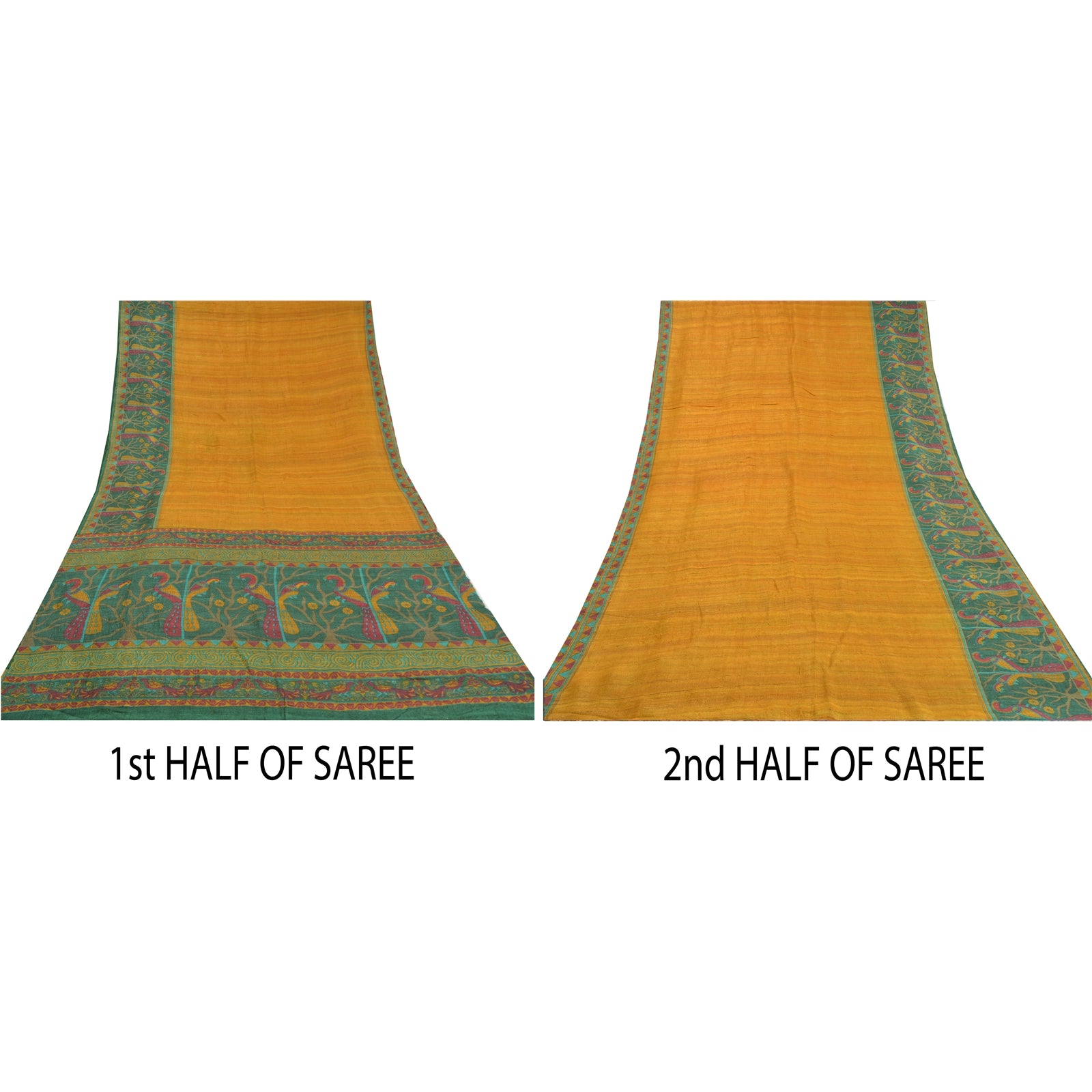 Beautiful heavy Sari In 100% Pure Silk (Handloom) Saffron & Green Colored Printed & Woven Saree/Sustainable Fabric. Pallu & Border Features Printed Work With Floral & Peacock Pattern. You Can See Solid Plain Color In Center Part Of Saree. This heavy saree can be used for various crafting ideas too. Use it for dress designing, as a throw, as window dressing, upholstery, table linen and much more. Let your creative juices flow! For USA buyers - Single item ships via registered air mail, buy 1 more to get FedEx.