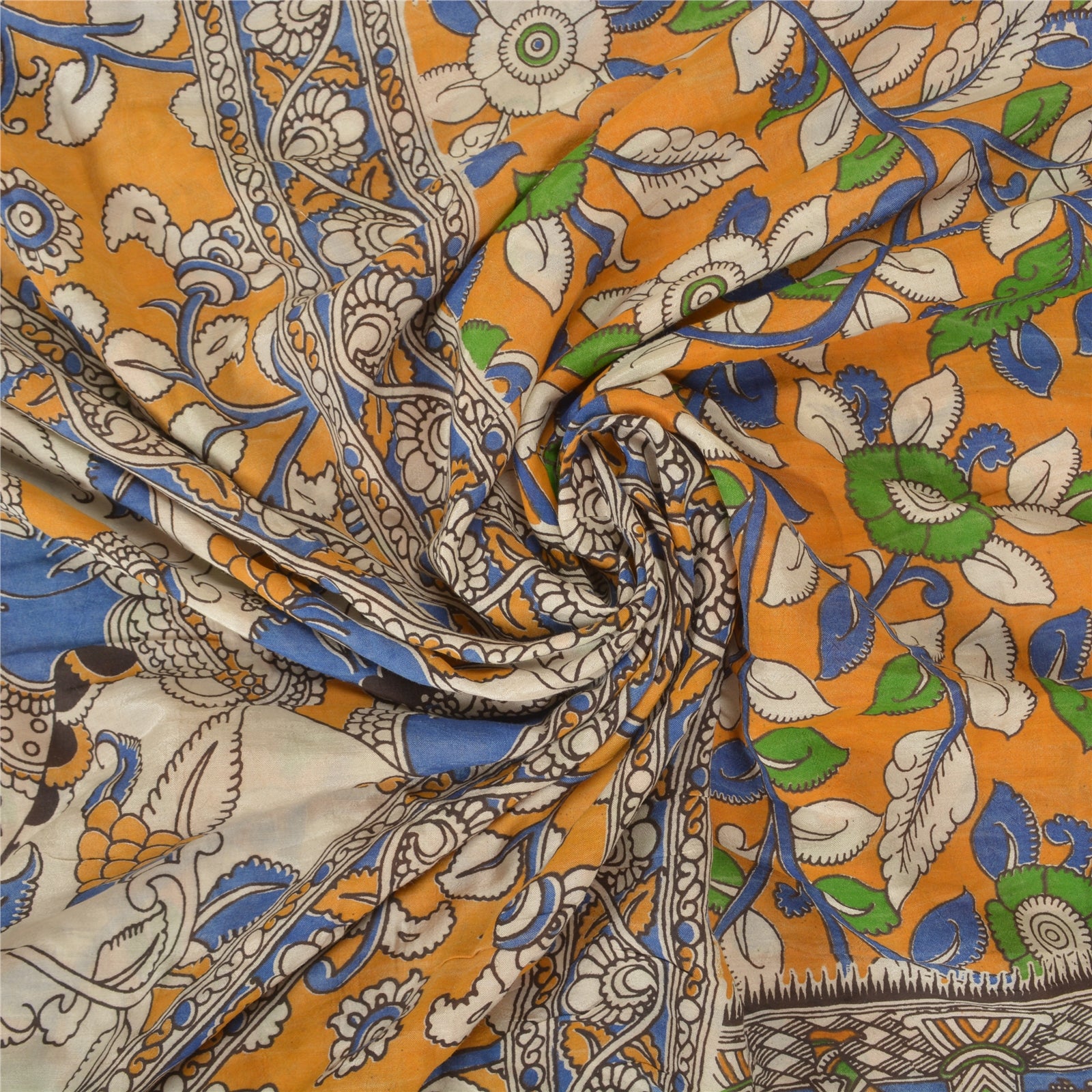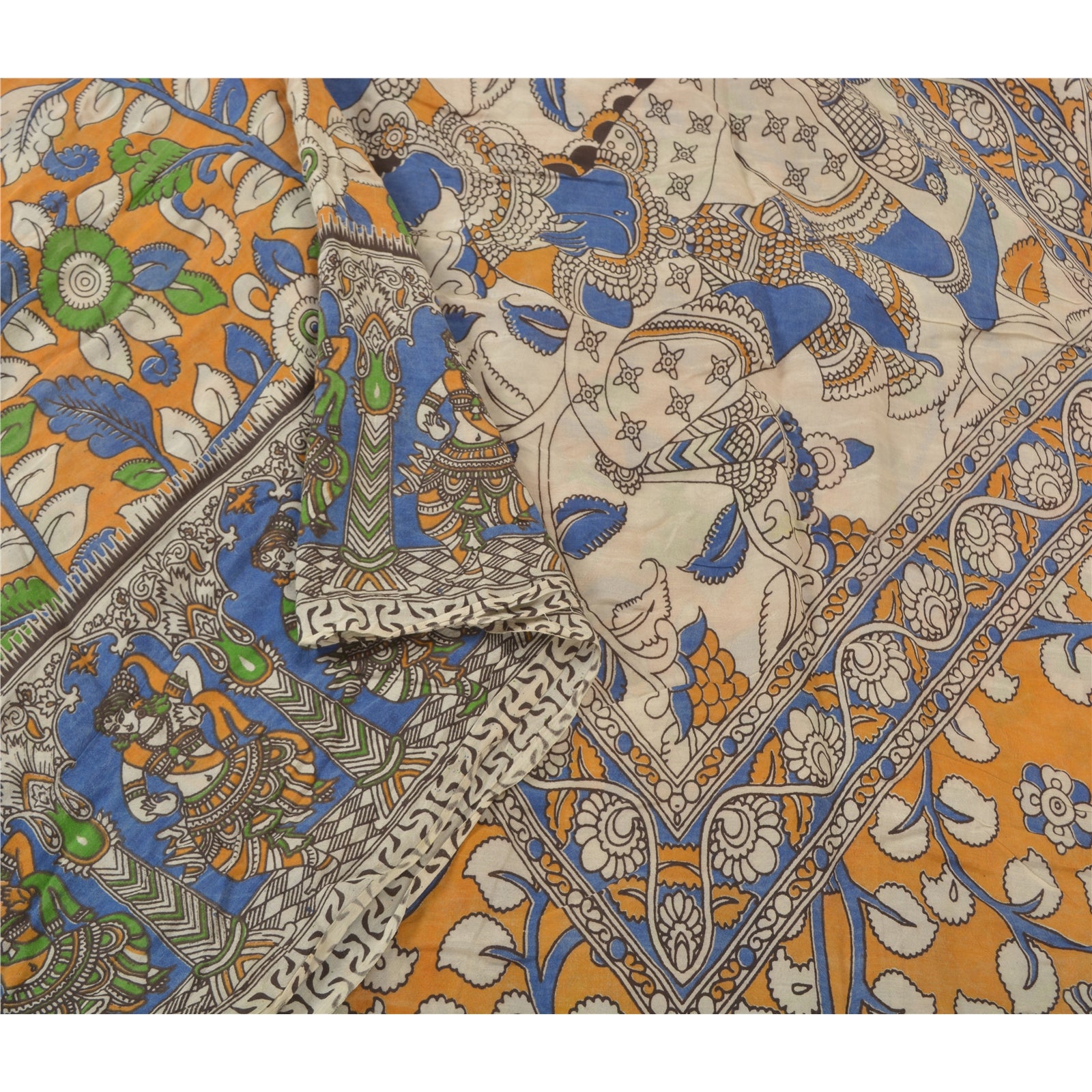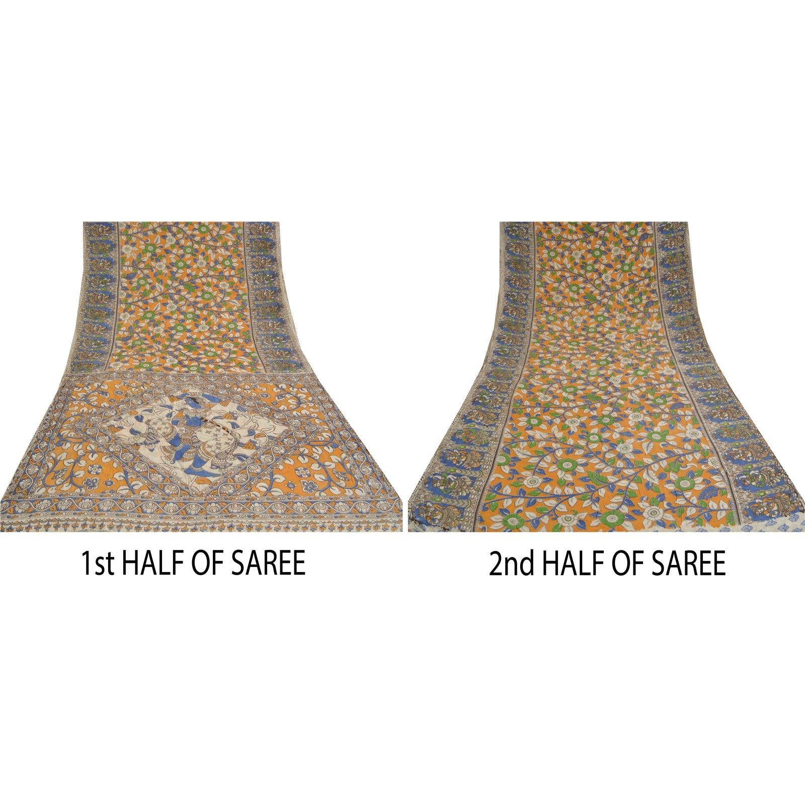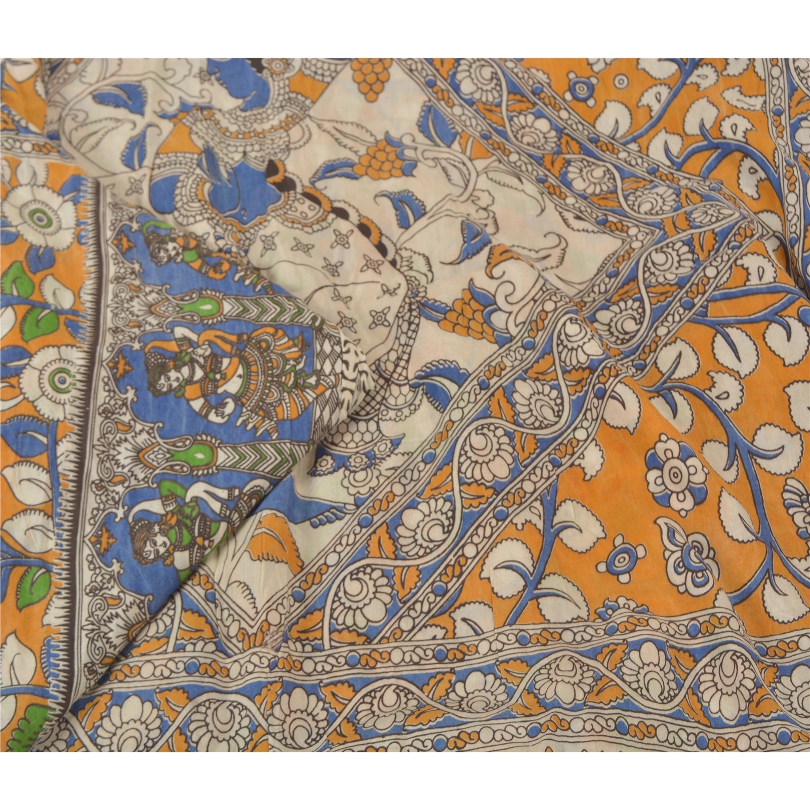 'THE ITEM COLOR OR SHADE MAY BE DARKER OR LIGHTER THAN THE PICTURE.' Beautiful saffron & blue colored cotton silk handmade Kalamkari sari/Sustainable Fabric. Pallu & Border has Traditional handmade Kalamkari work with floral & dancing women design is really enhancing beauty of the sari. Center portion of the sari kalamkari work with floral design. This saree can be used for various crafting ideas too. Use it for dress designing, as a throw, as window dressing, upholstery, table linen and much more. Let your creative juices flow. 'International buyers please note: Import duties, taxes, and charges are not included in the item price or postage cost. These charges are the buyer's responsibility. Please check with your country's customs office to determine what these additional costs will be prior to bidding or buying. Buyer will pay custom duty/tax. It is calculated and charged differently by every country. As a seller I do not have any control over it. VAT or sales tax is calculated by the platform at the time of checkout. Customs charge is payable at the time of delivery.'
