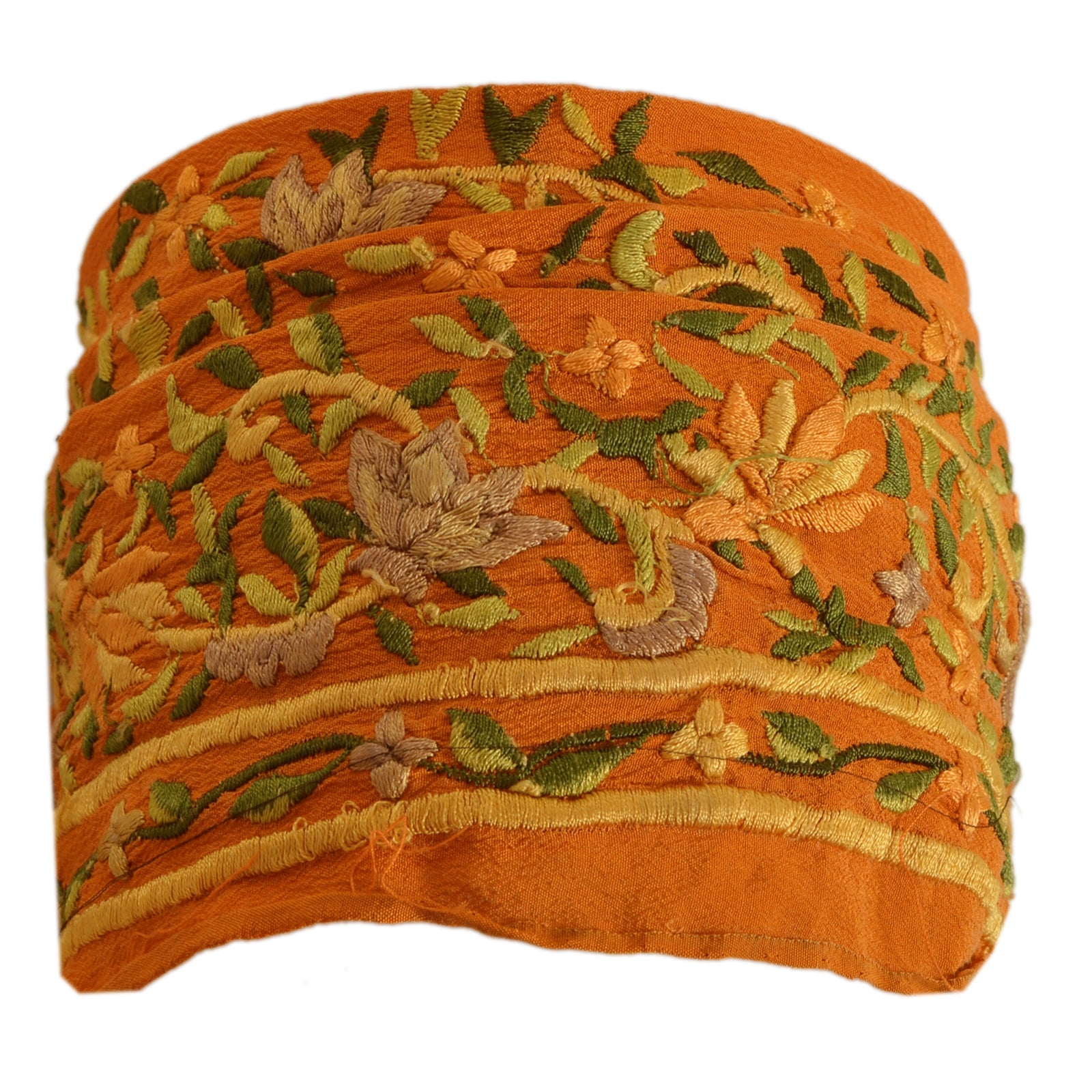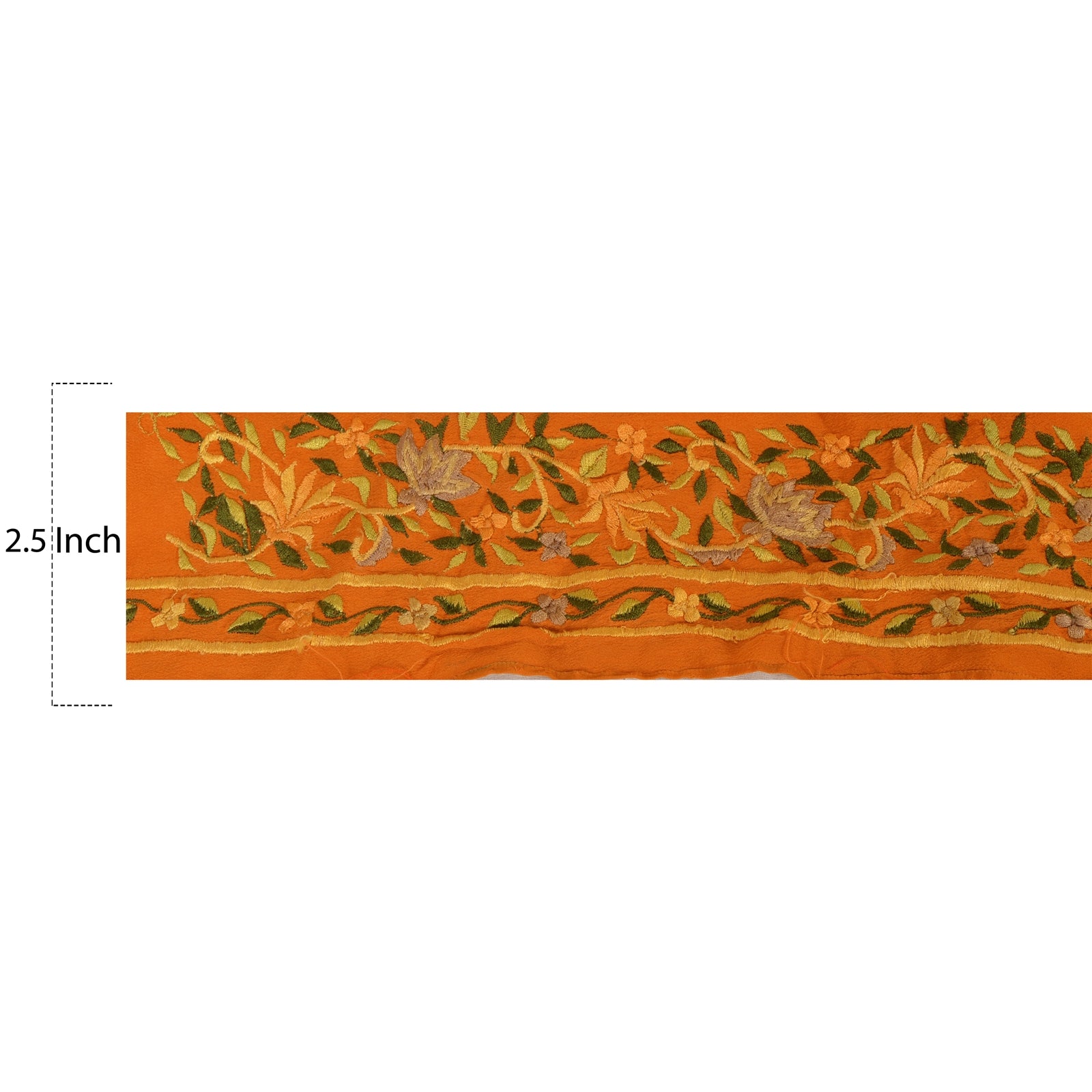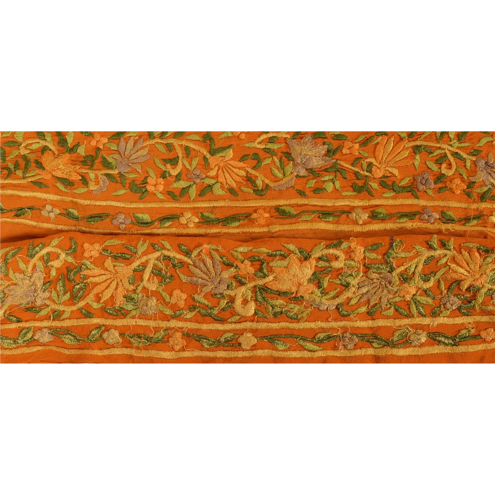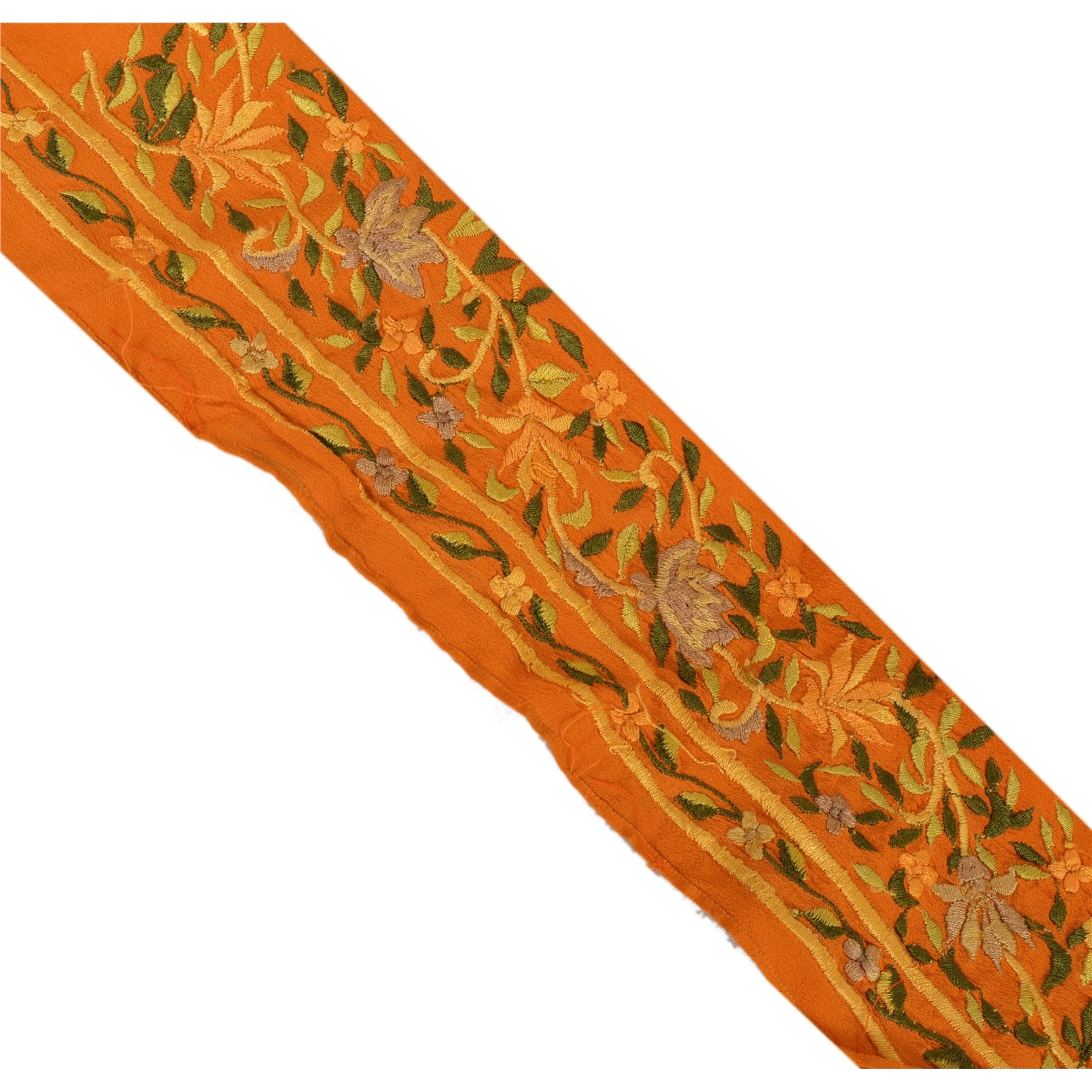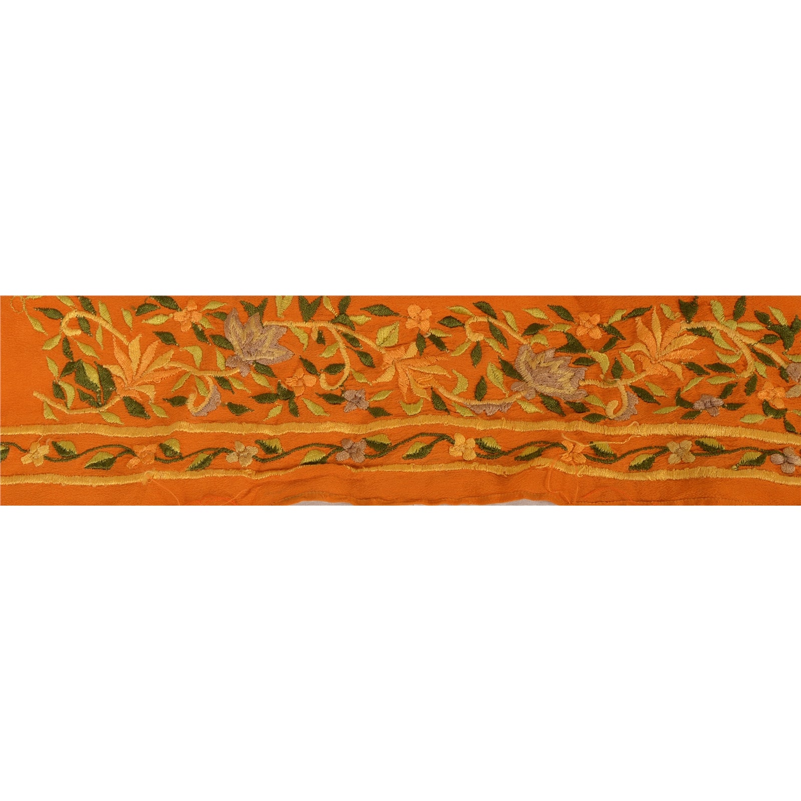 Amazing crepe silk embroidered sari border in orange color highlighting thread work. Border has beautiful floral patterns painstakingly embroidered with green, orange thread work. WOW!! an awesome one of a kind versatile border. 1 Quantity = 1 Yard