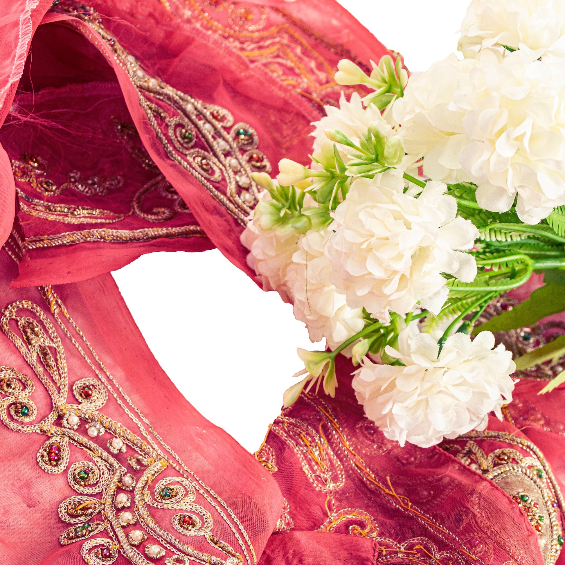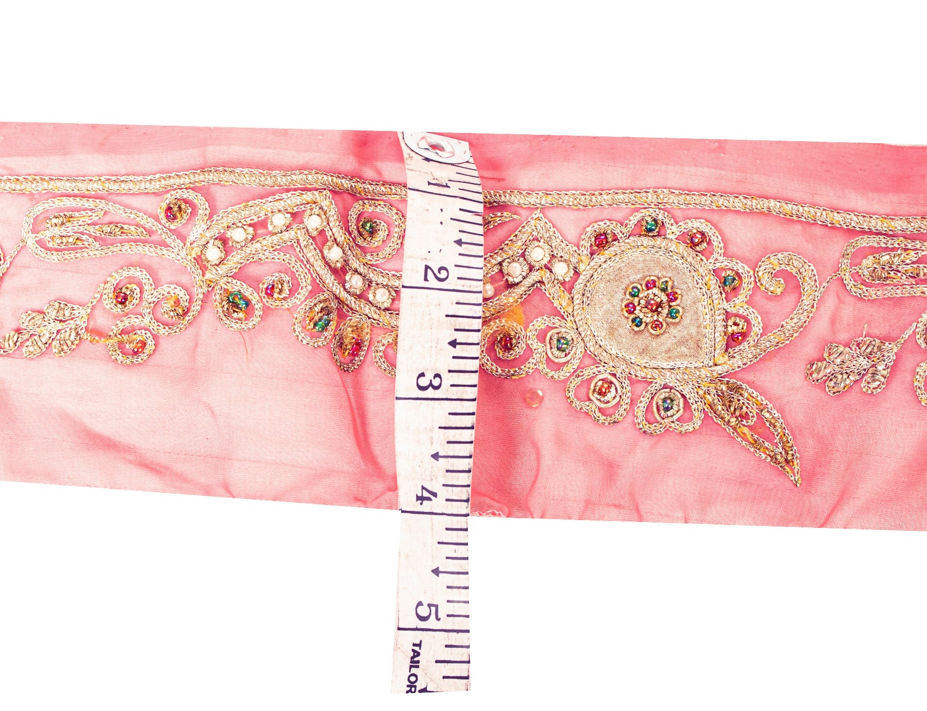 Beautiful American georgette hand embroidered sari border. Further embellished by gold zari/zardozi/dabka work. Also, you can see cream pearl like beads, red/green glass beads, gold dori work, gold patch work along with floral & paisley design on pink base fabric. 1 Quantity = 1 Yard B-9074