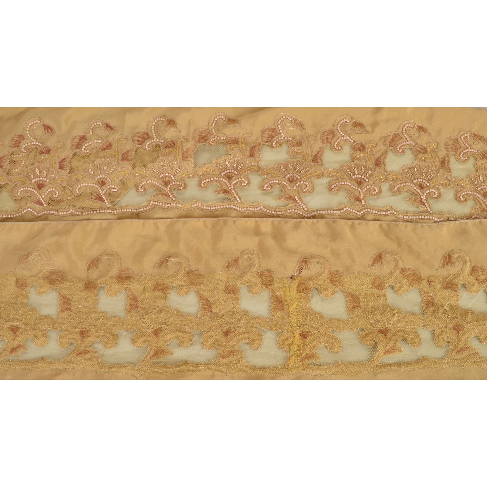 Amazing satin silk hand beaded sari border in beige color highlighting beaded work. Border has beautiful floral patterns painstakingly hand beaded with golden zari/zardozi work, pink pearl like beads work. Further you can see fine detailing with cream net Sustainable Fabric patch work. WOW!! an awesome one of a kind versatile border. 1 Quantity = 1 Yard