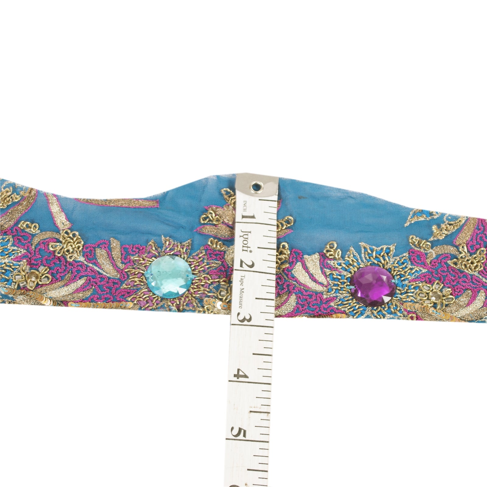 Beautiful art silk hand embroidered sari border. Further embellished by gold zari/zardozi work, pink/blue thread work. Also, you can see gold/copper sequins, yellow glass beads, purple/blue/white stone work along with floral design on blue base fabric. 1 Quantity = 1 Yard B-9295