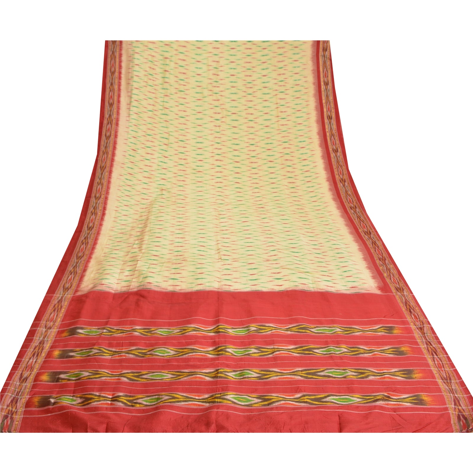 Sanskriti Vintage Saree Cream Pochampally Hand Woven Ikat Pure Silk Sari Sustainable Fabric
