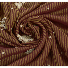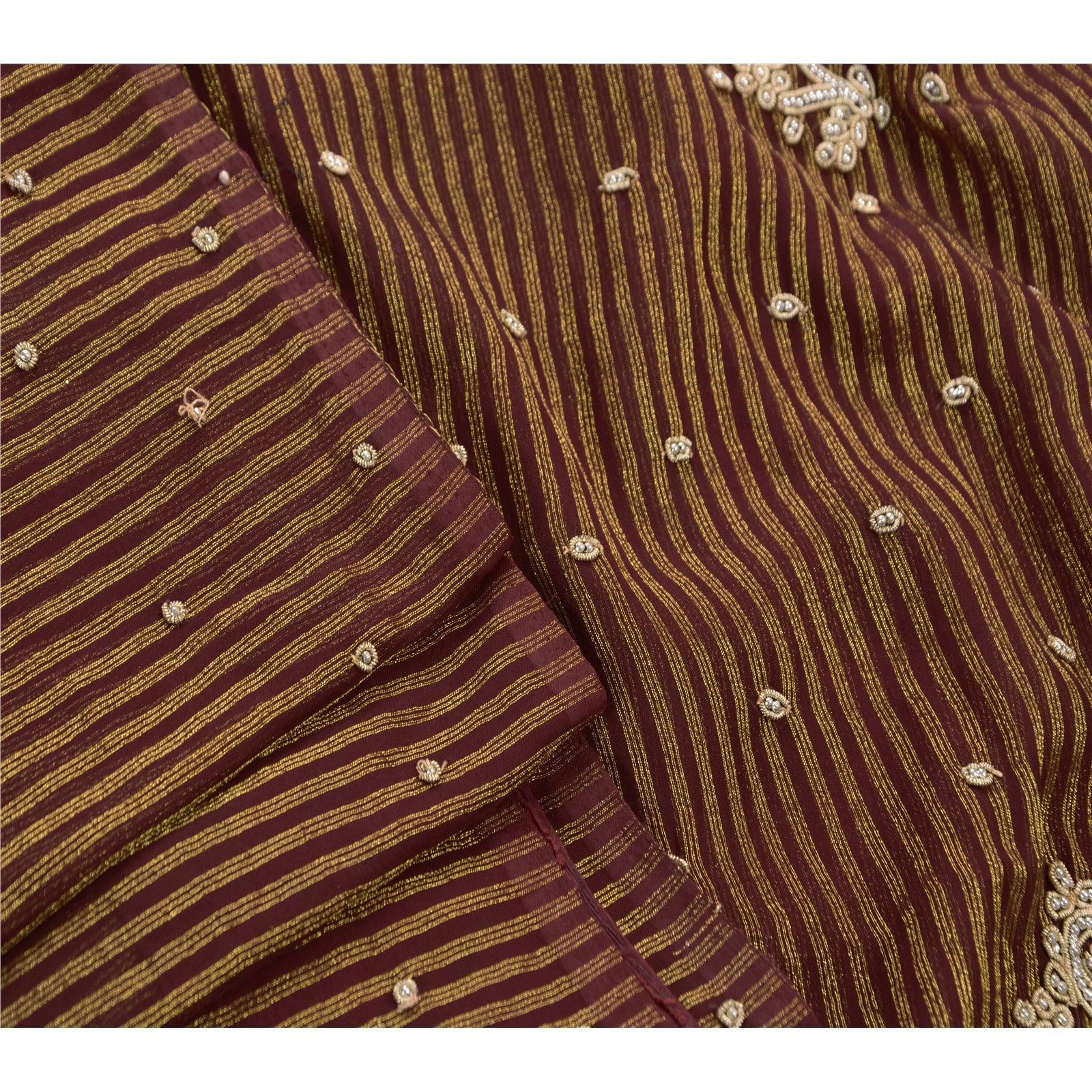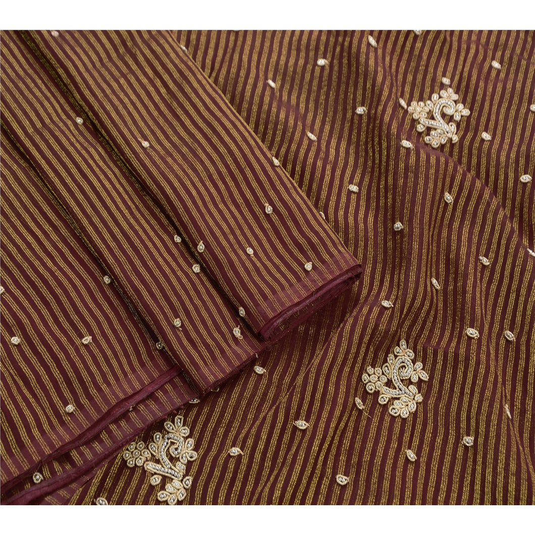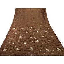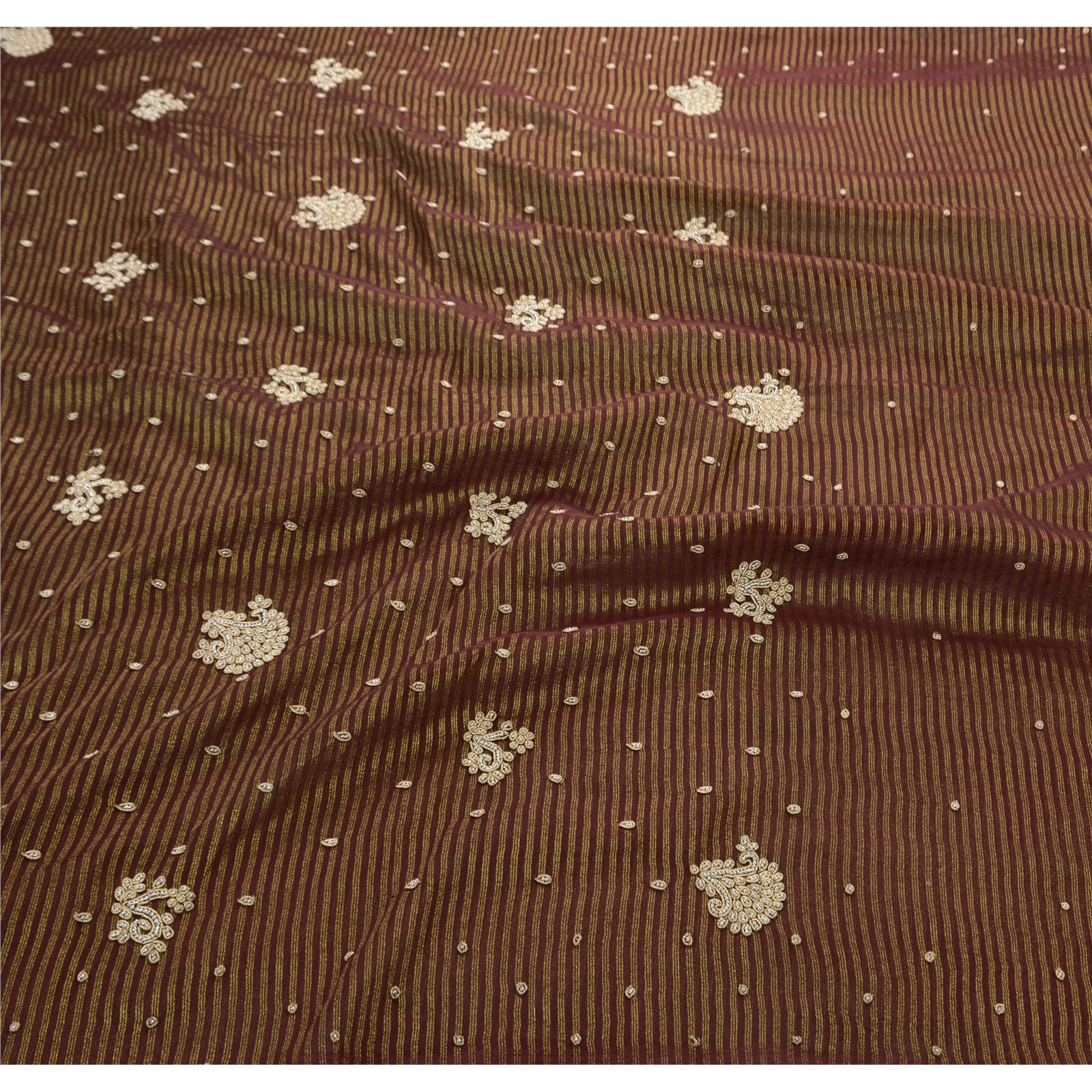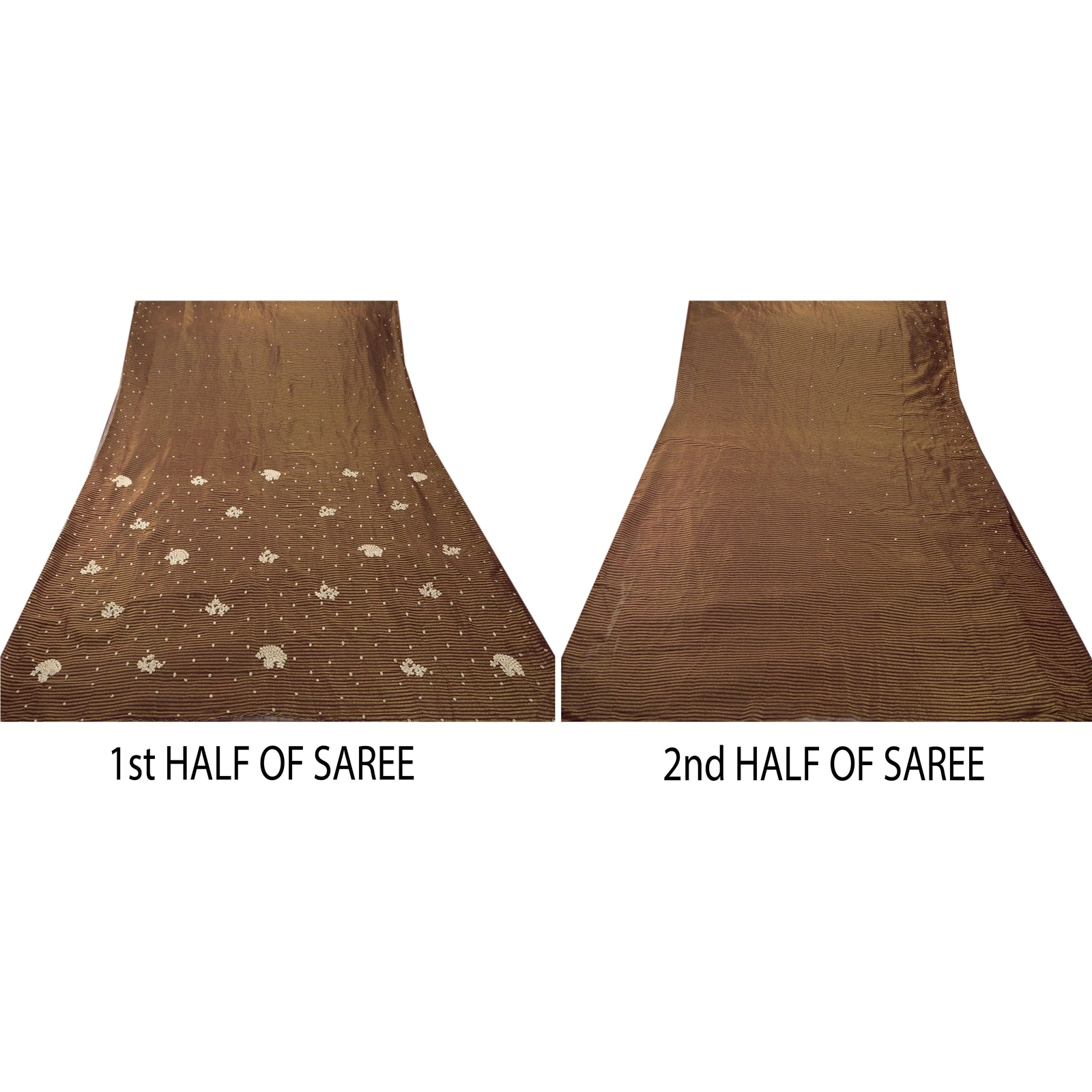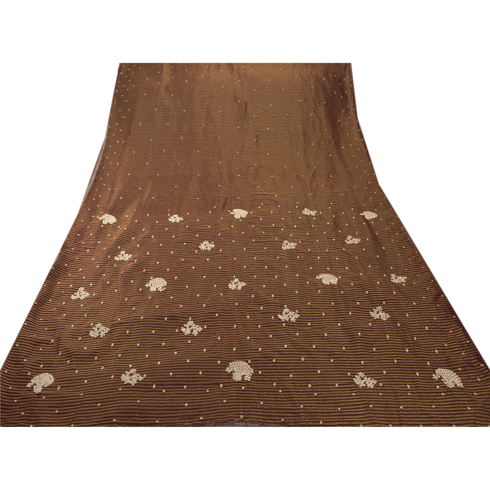 ? Beautiful brown colored hand embroidered woven georgette sari ? Pallu & Border features floral design embellished with gold dabka work, gold beads and weaving work. ? There are floral motifs with similar work in center part of sari. What is special about this saree? Alluring golden dabka work with floral design on brown color base Sustainable Fabric is really enhancing the beauty of the saree. This unique vintage saree can be used for various crafting ideas even if you don't want to use it as a sari. Design a dress, use it as a throw, as window dressing, upholstery, sarongs, table linen and much more. Let your creative juices flow and use this decorated Sustainable Fabric in multiple fashion.