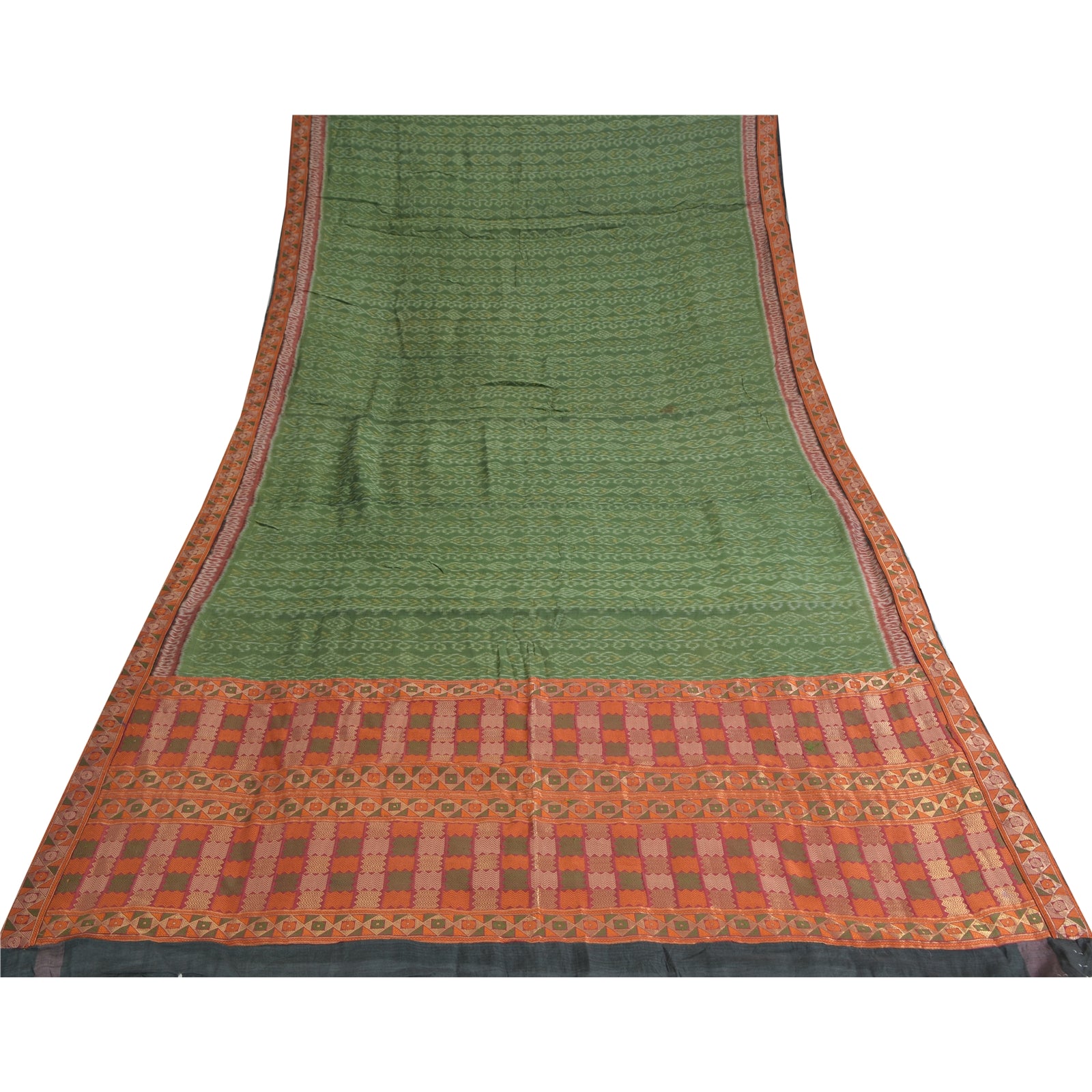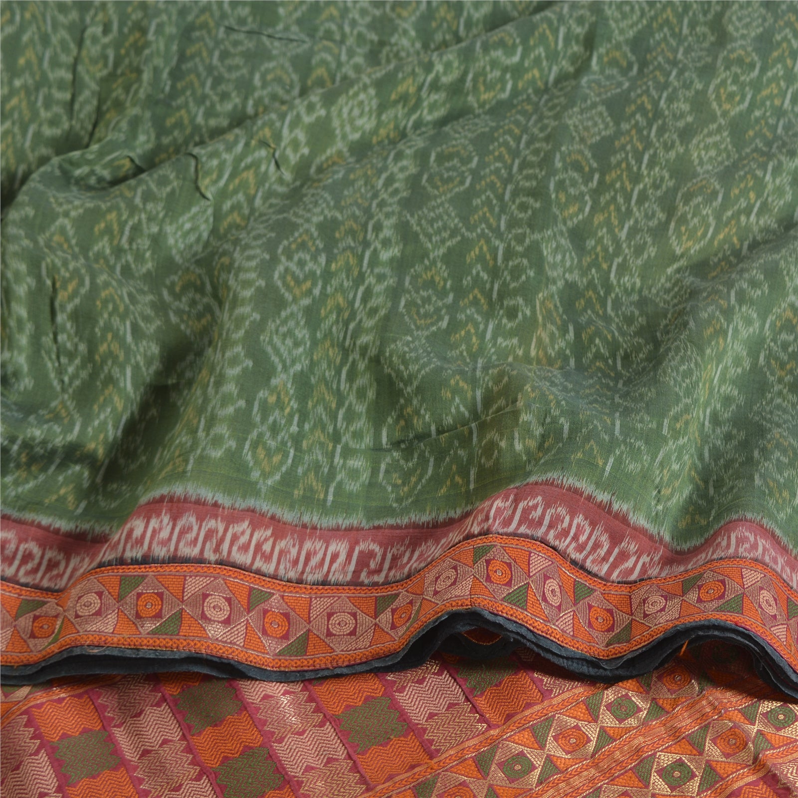 Sanskriti Vintage Saree Green HandWoven Ikat/Patch Pure Cotton Sari Craft Sustainable Fabric