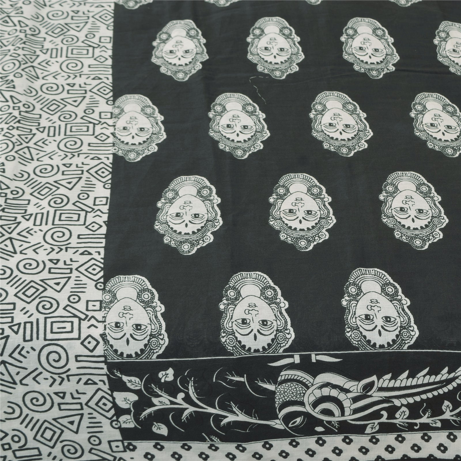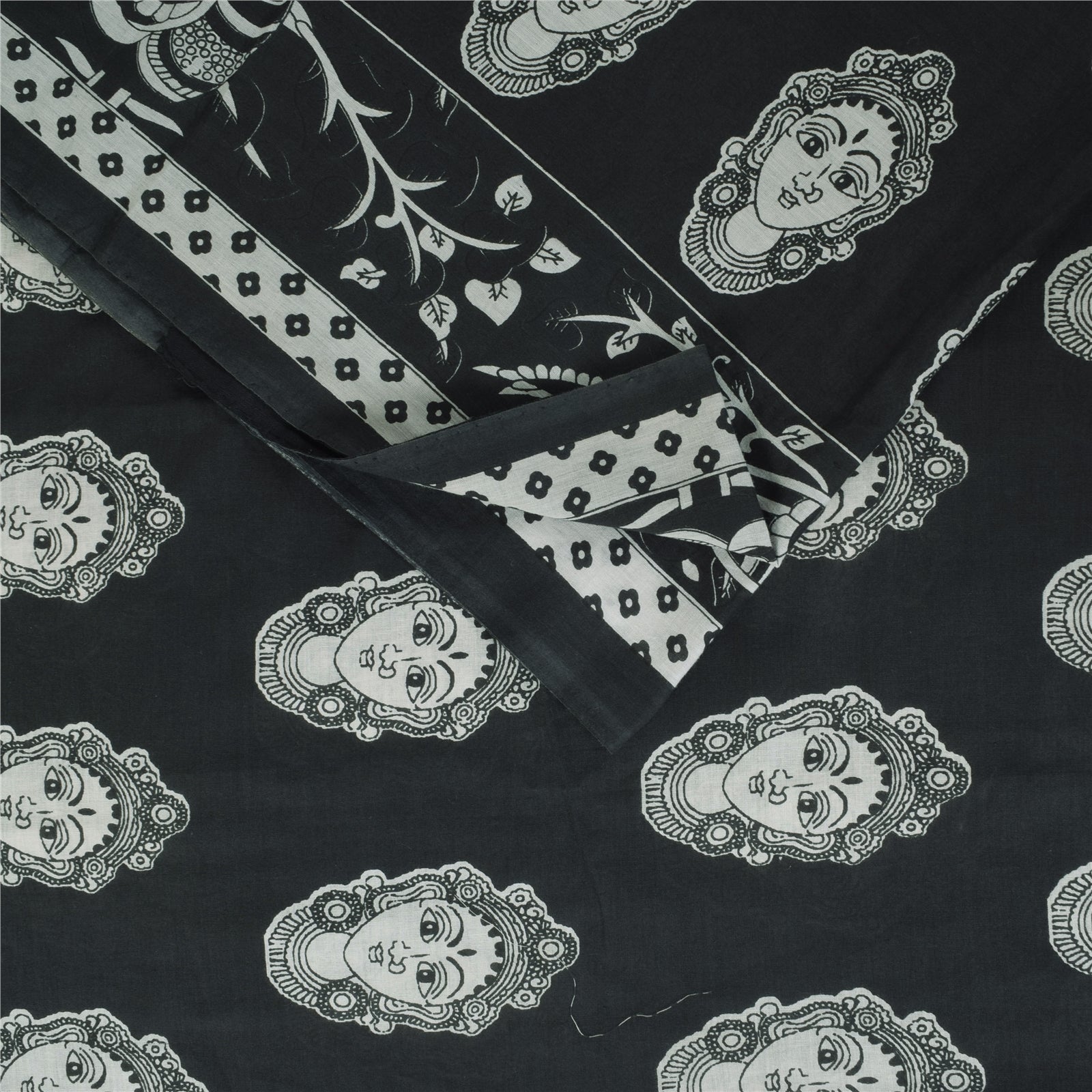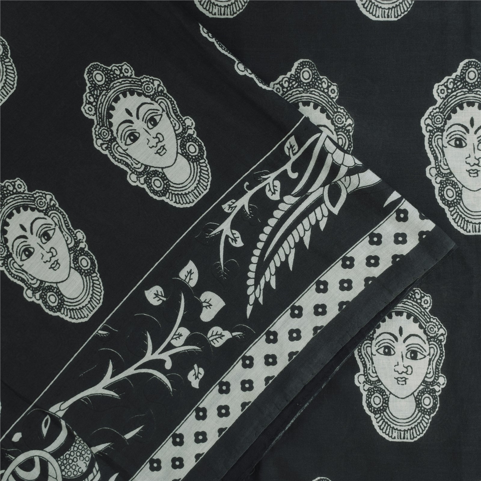 THE ITEM COLOR OR SHADE MAY BE DARKER OR LIGHTER THAN THE PICTURE. Attractive black colored pure cotton hand block printed kalamkari sari. Pallu & Border has printed geometric design. Women face design in center part of saree.. This unique vintage saree can be used for various crafting ideas even if you don't want to use it as a sari. Design a dress, use it as a as window dressing, upholstery, sarongs, throw, dress making and table linen much more. Let your creative juices flow and use this decorated Sustainable Fabric in multiple fashion. Shipping Note: 'International buyers please note: Import duties, taxes, and charges are not included in the item price or postage cost. These charges are the buyer's responsibility. Please check with your country's customs office to determine what these additional costs will be prior to bidding or buying. Buyer will pay custom duty/tax. It is calculated and charged differently by every country. As a seller I do not have any control over it. VAT or sales tax is calculated by the platform at the time of checkout. Customs charge is payable at the time of delivery.' PCS-6397