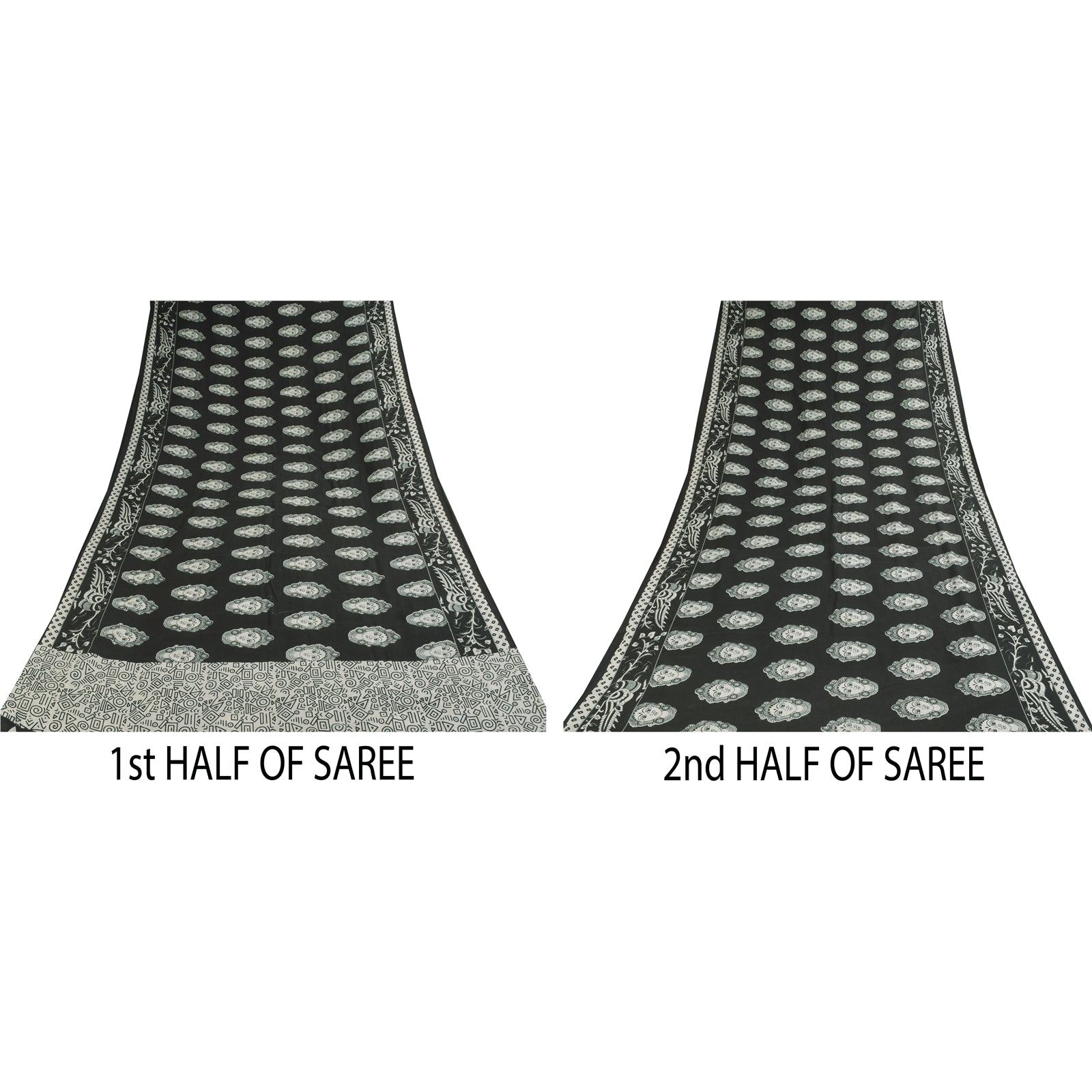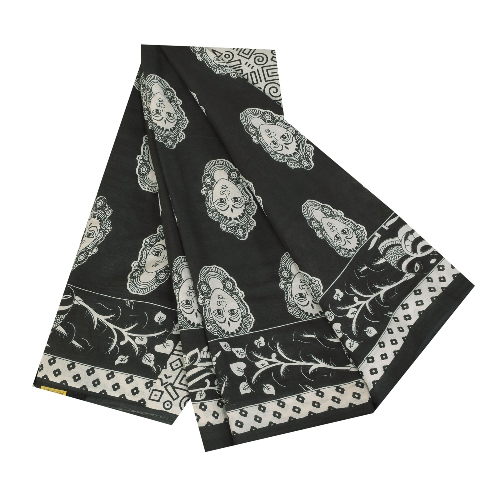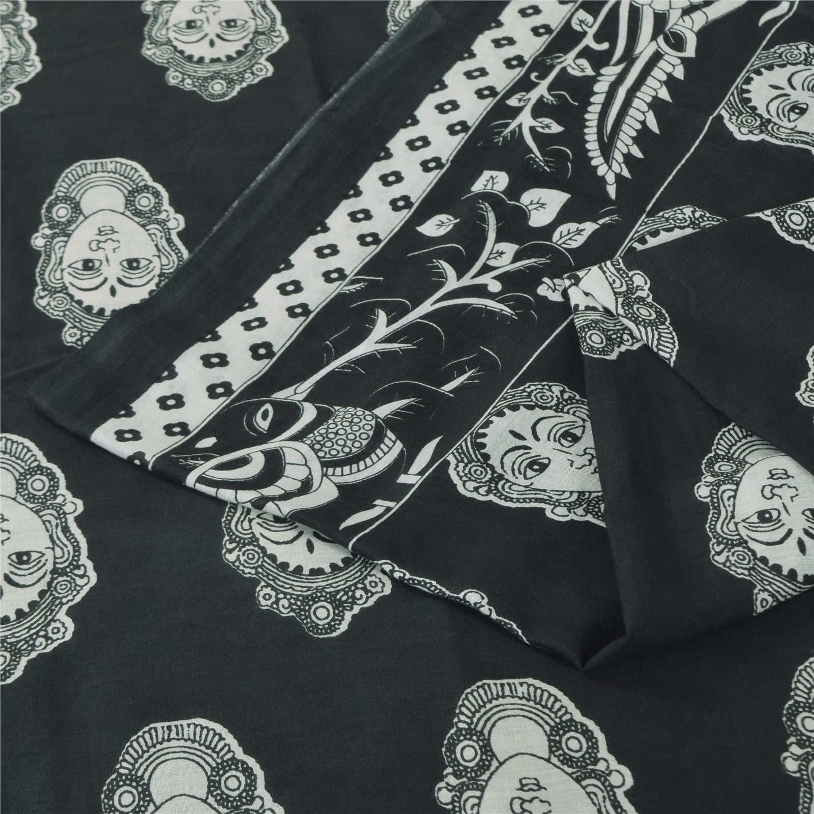 THE ITEM COLOR OR SHADE MAY BE DARKER OR LIGHTER THAN THE PICTURE. Attractive black colored pure cotton hand block printed kalamkari sari. Pallu & Border has printed geometric design. Women face design in center part of saree.. This unique vintage saree can be used for various crafting ideas even if you don't want to use it as a sari. Design a dress, use it as a as window dressing, upholstery, sarongs, throw, dress making and table linen much more. Let your creative juices flow and use this decorated Sustainable Fabric in multiple fashion. Shipping Note: 'International buyers please note: Import duties, taxes, and charges are not included in the item price or postage cost. These charges are the buyer's responsibility. Please check with your country's customs office to determine what these additional costs will be prior to bidding or buying. Buyer will pay custom duty/tax. It is calculated and charged differently by every country. As a seller I do not have any control over it. VAT or sales tax is calculated by the platform at the time of checkout. Customs charge is payable at the time of delivery.' PCS-6397