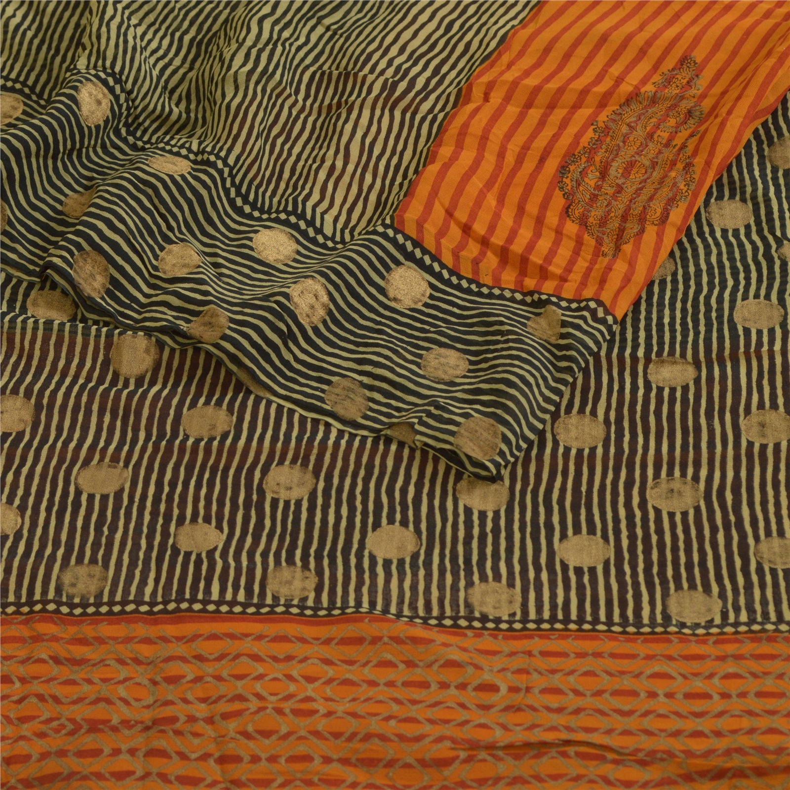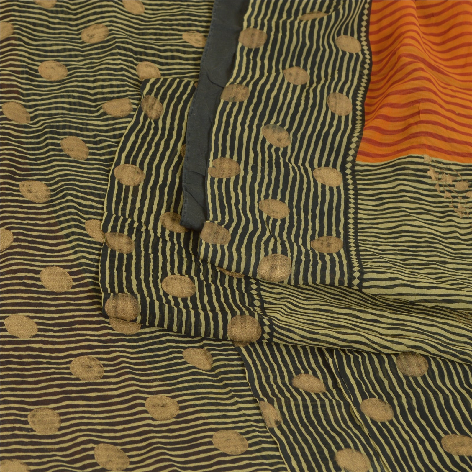 Sanskriti Vintage Sarees Black/Orange Pure Georgette Silk Print Sari 5yd Sustainable Fabric