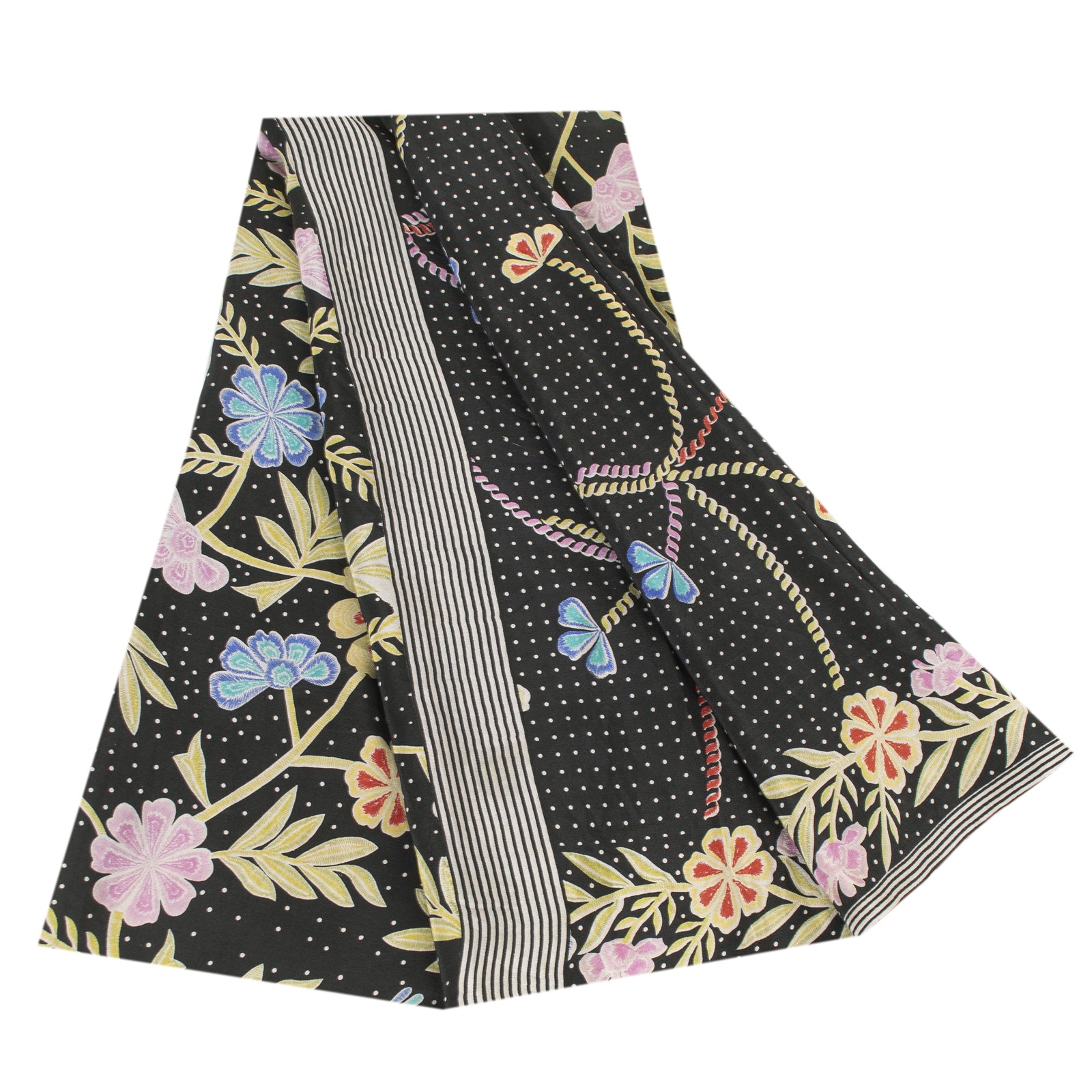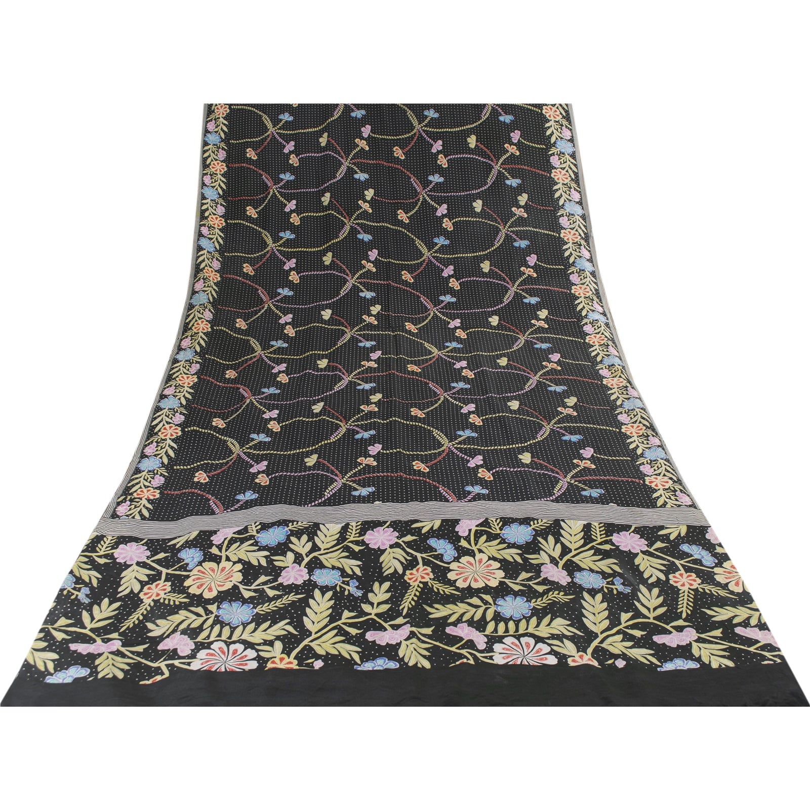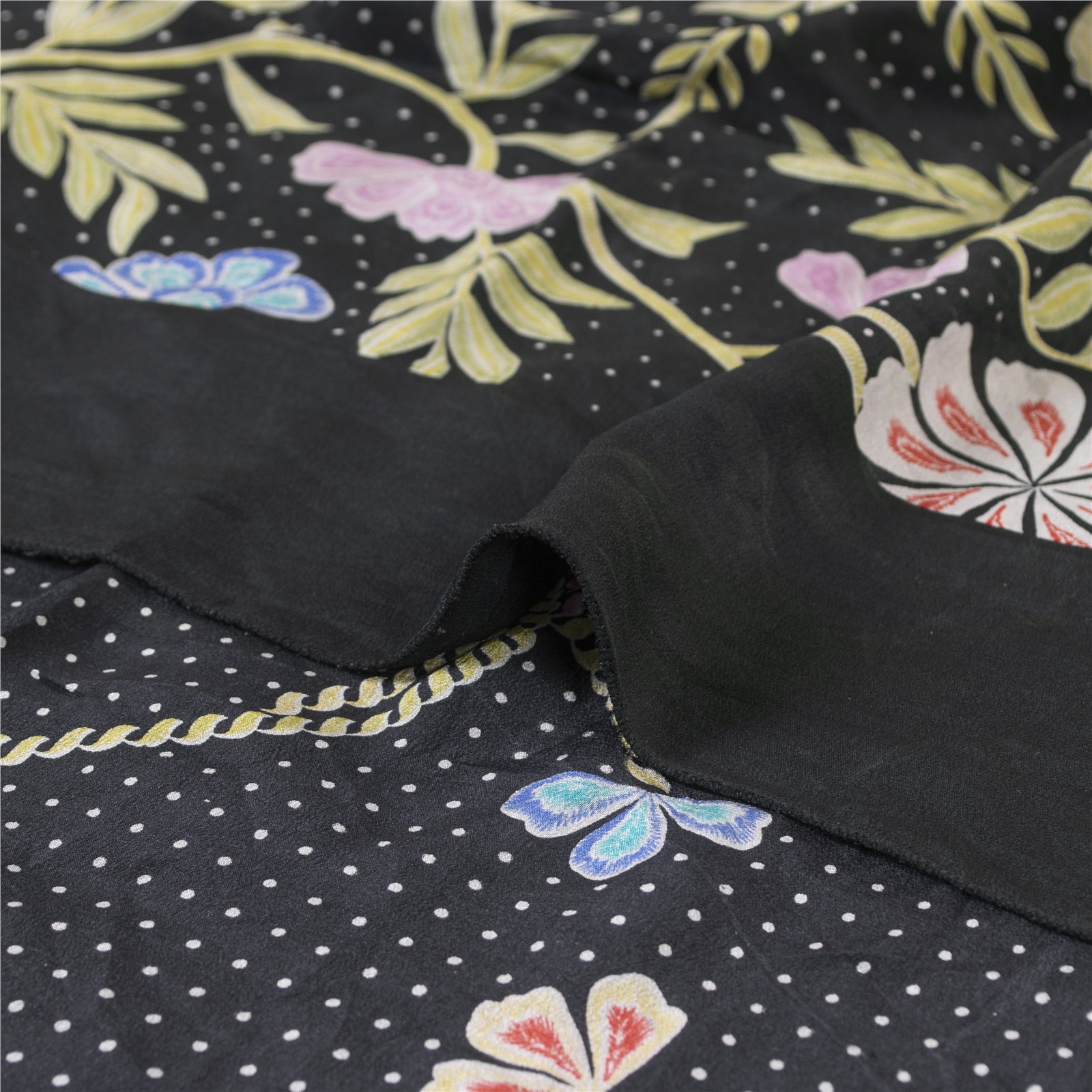 Sanskriti Vintage Sarees Black Pure Crepe Silk Printed Sari 5+yd Craft Fabric