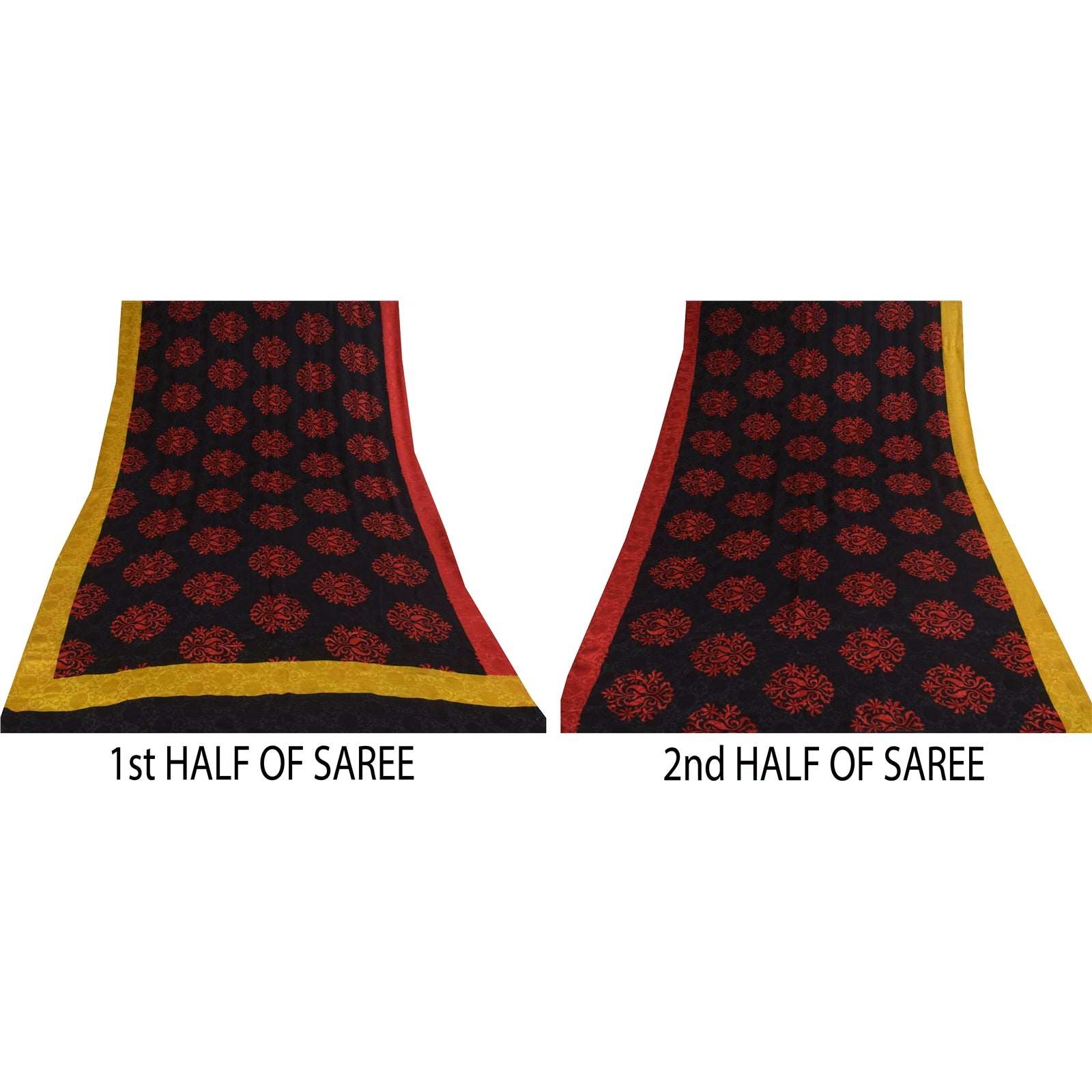 Sanskriti Vintage Sarees Black/Red Pure Crepe Printed Self Sari 5+yd Sustainable Fabric