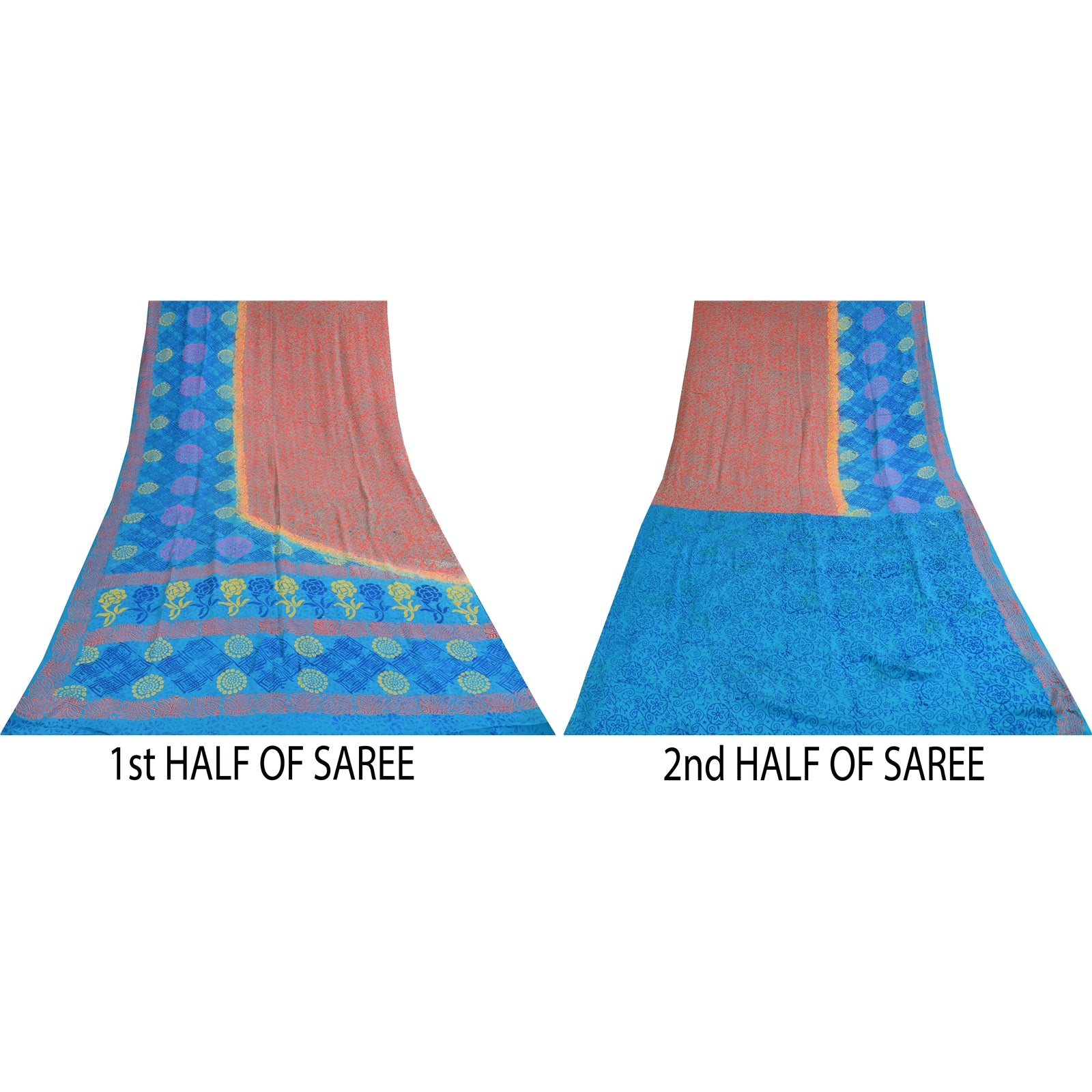 Sanskriti Vintage Sarees Blue & Orange Pure Crepe Silk Printed Sari 5+yd Sustainable Fabric