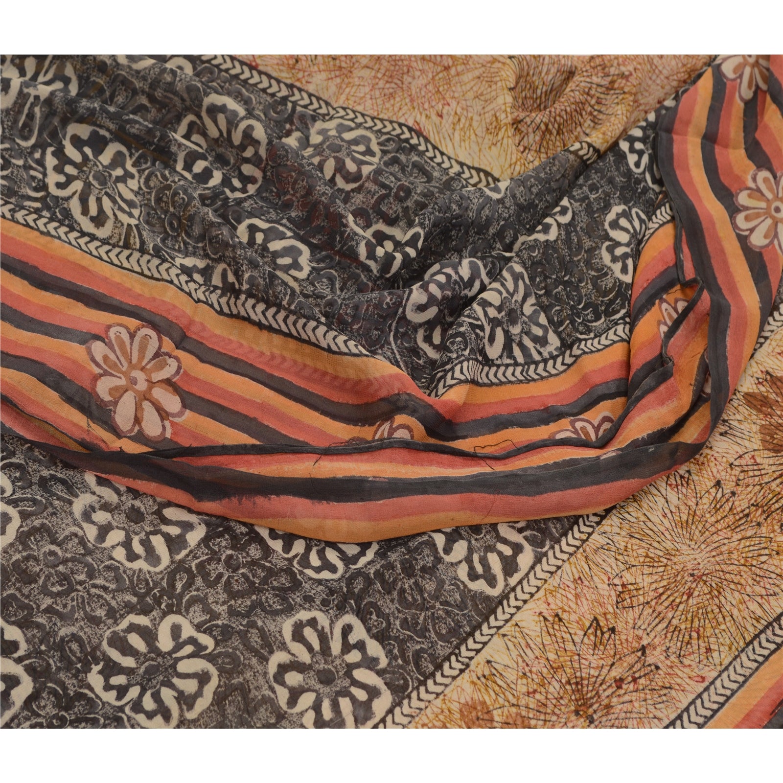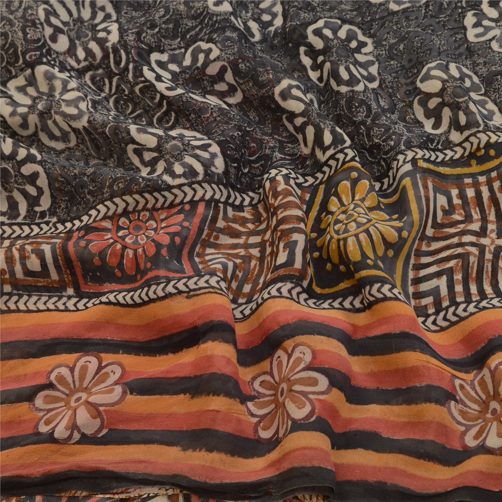 THE ITEM COLOR OR SHADE MAY BE DARKER OR LIGHTER THAN THE PICTURE.' Beautiful brown & black colored pure georgette silk printed saree. Pallu & Border has printed floral & geometric design. Floral design in center part of saree. Saree has mild stain on it. What is special about this saree? Brilliant design on soft Sustainable Fabric is really enhancing the beauty of the saree. This unique vintage saree can be used for various crafting ideas even if you don't want to use it as a sari. Design a dress, use it as a as window dressing, upholstery, sarongs, throw, dress making and table linen much more. Let your creative juices flow and use this decorated Sustainable Fabric in multiple fashion. International buyers please note: Import duties, taxes, and charges are not included in the item price or postage cost. These charges are the buyer's responsibility. Please check with your country's customs office to determine what these additional costs will be prior to bidding or buying.Buyer will pay custom duty/tax. It is calculated and charged differently by every country. As a seller I do not have any control over it. VAT or sales tax is calculated by the platform at the time of checkout. Customs charge is payable at the time of delivery.