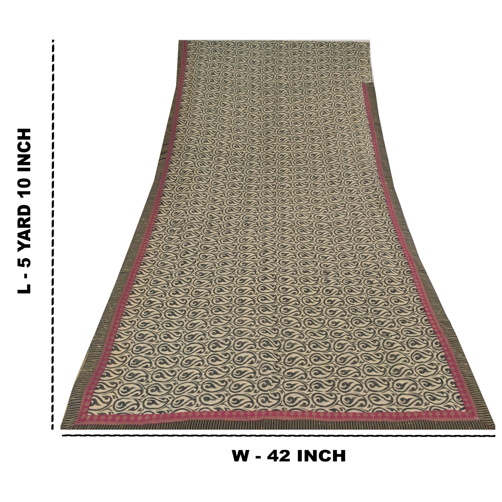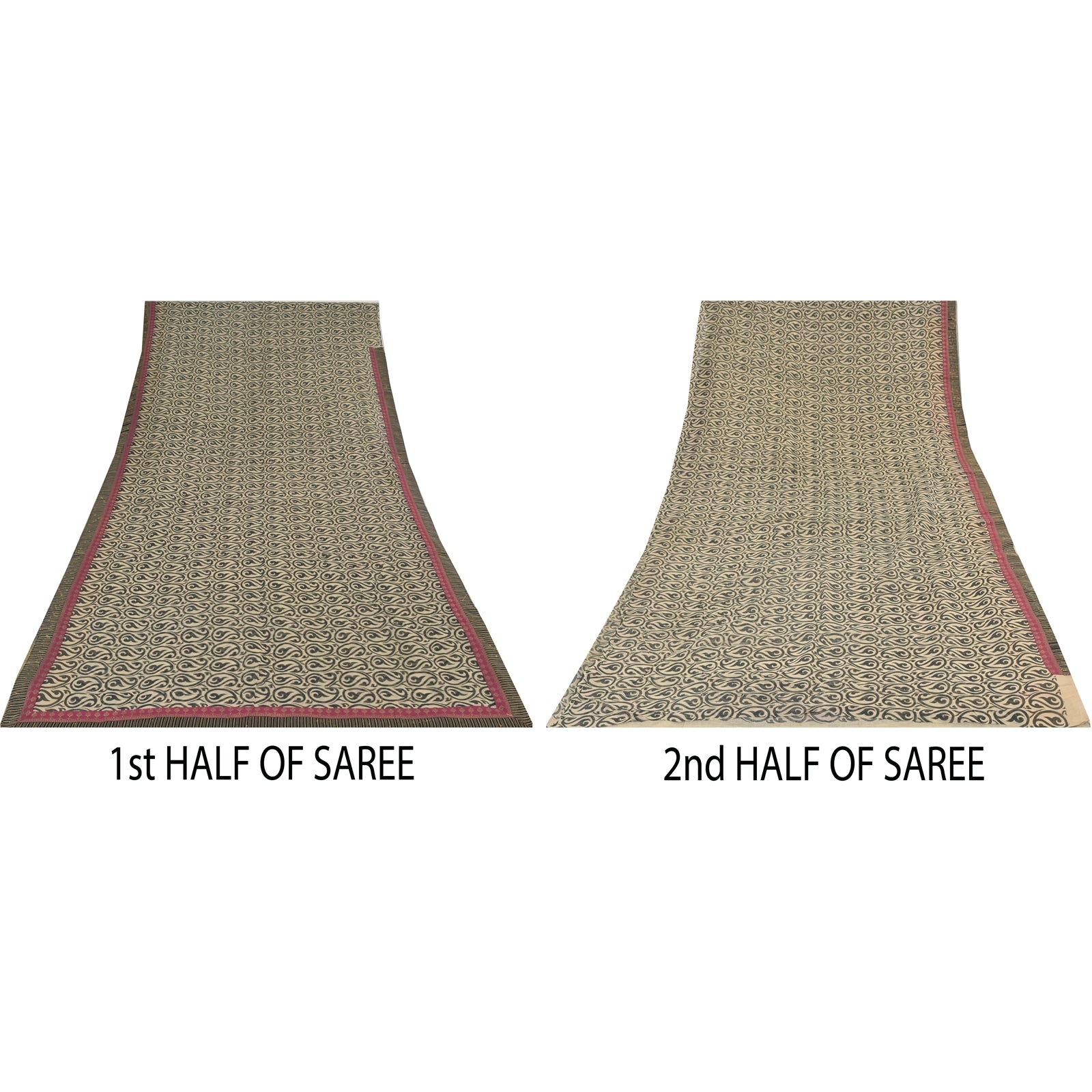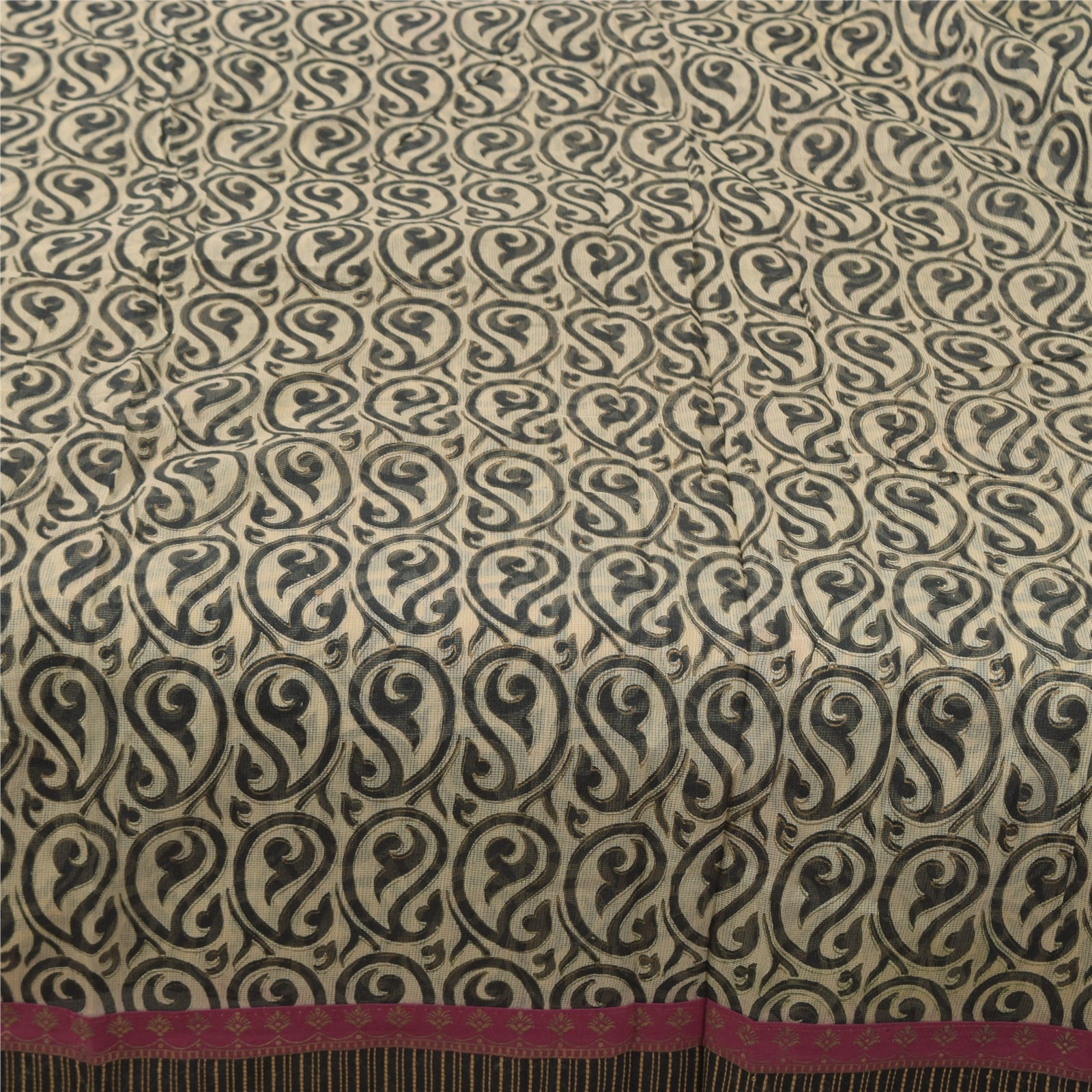 Sanskriti Vintage Sarees Cream/Black 100%Pure Cotton Print Kota Sari 5+yd Sustainable Fabric